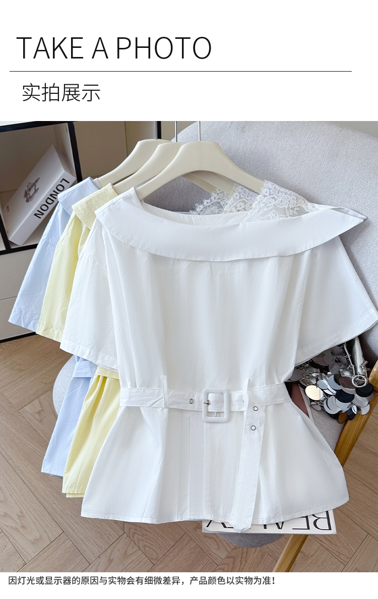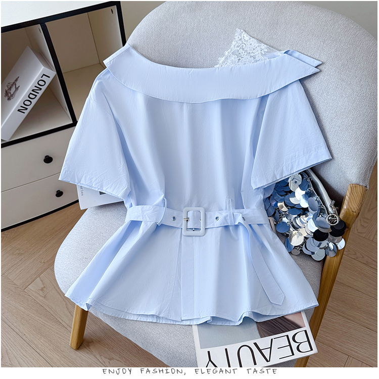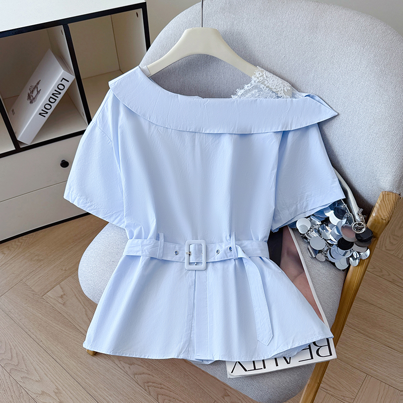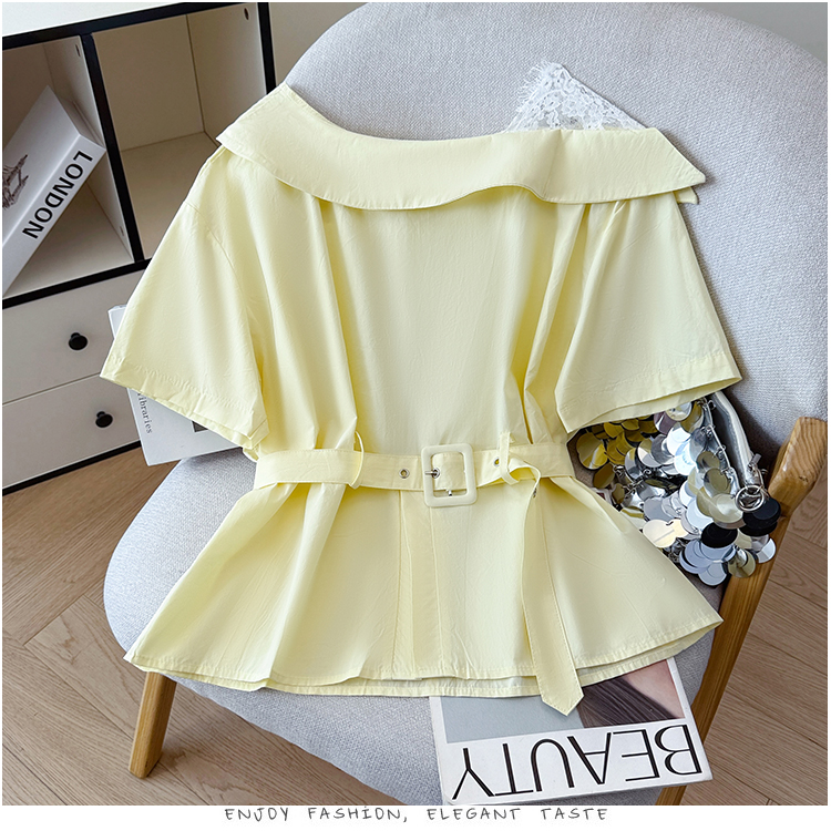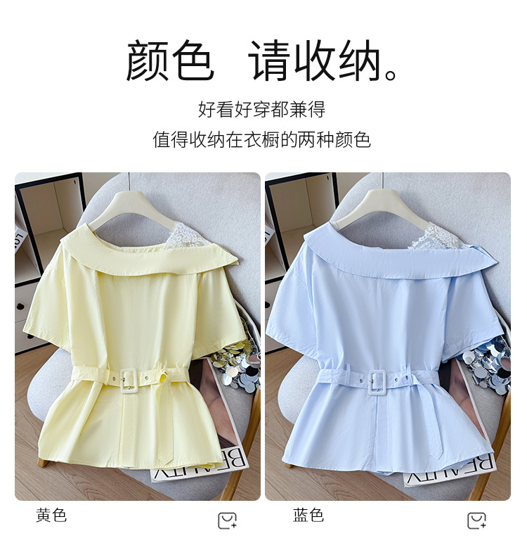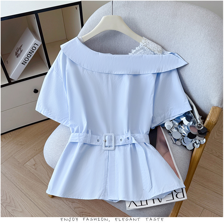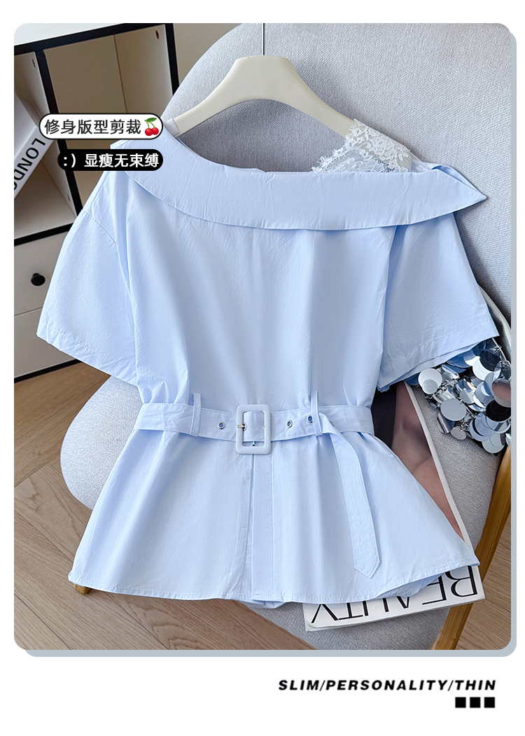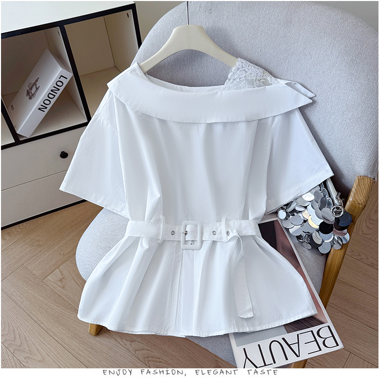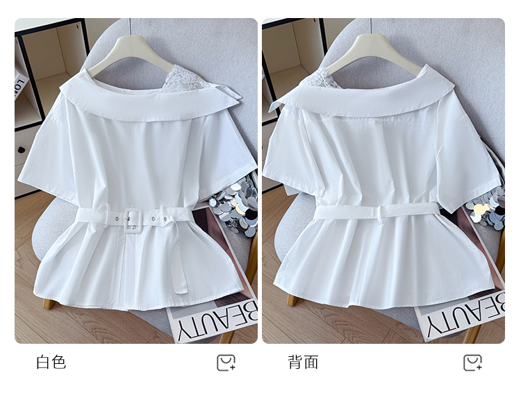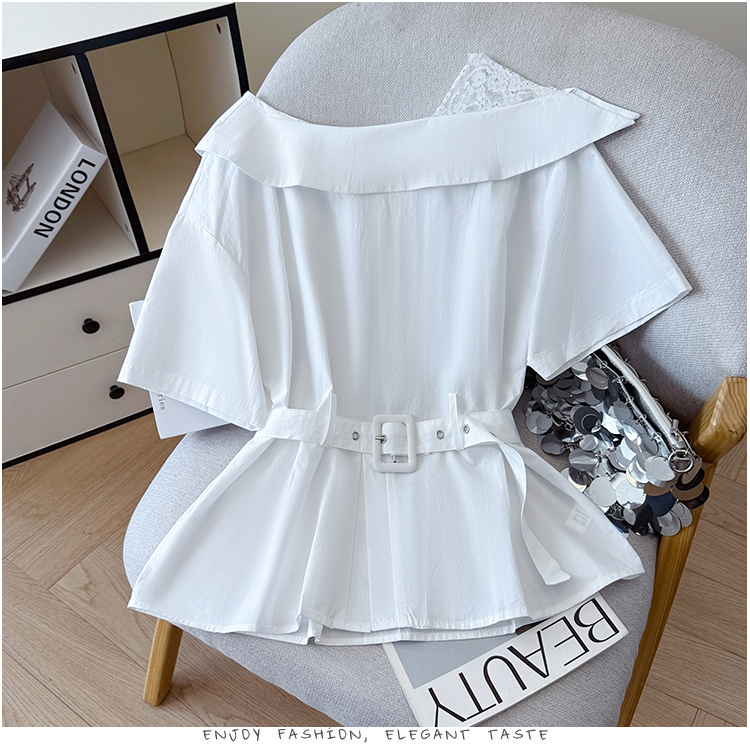 RY3522# 夏季新款设计感白色露肩短袖衬衫女洋气遮肉宽松斜肩上衣收腰显瘦