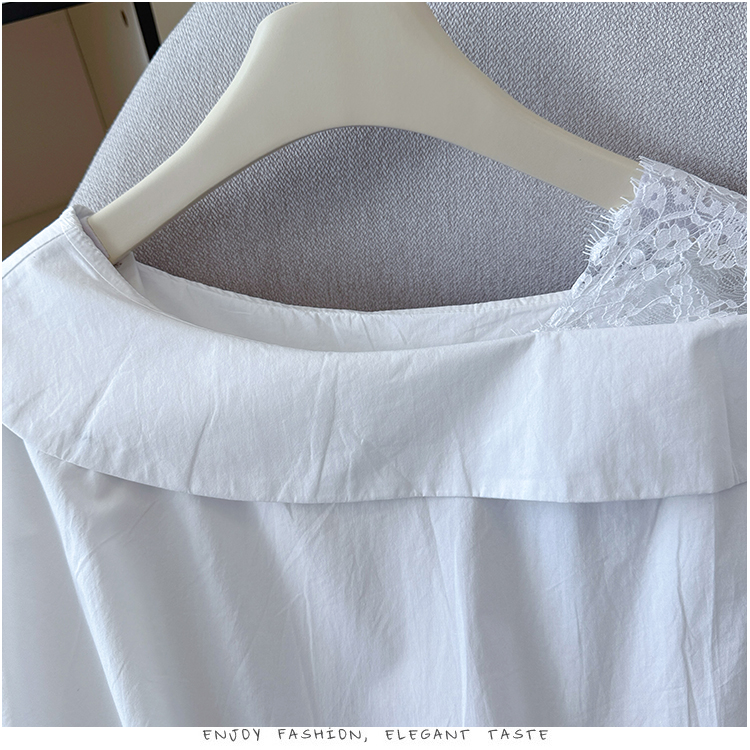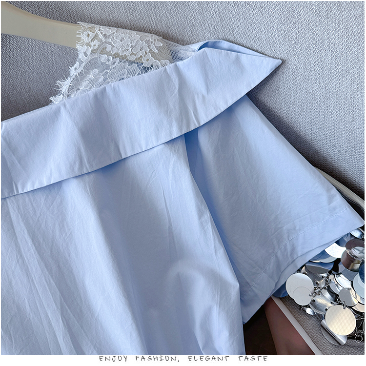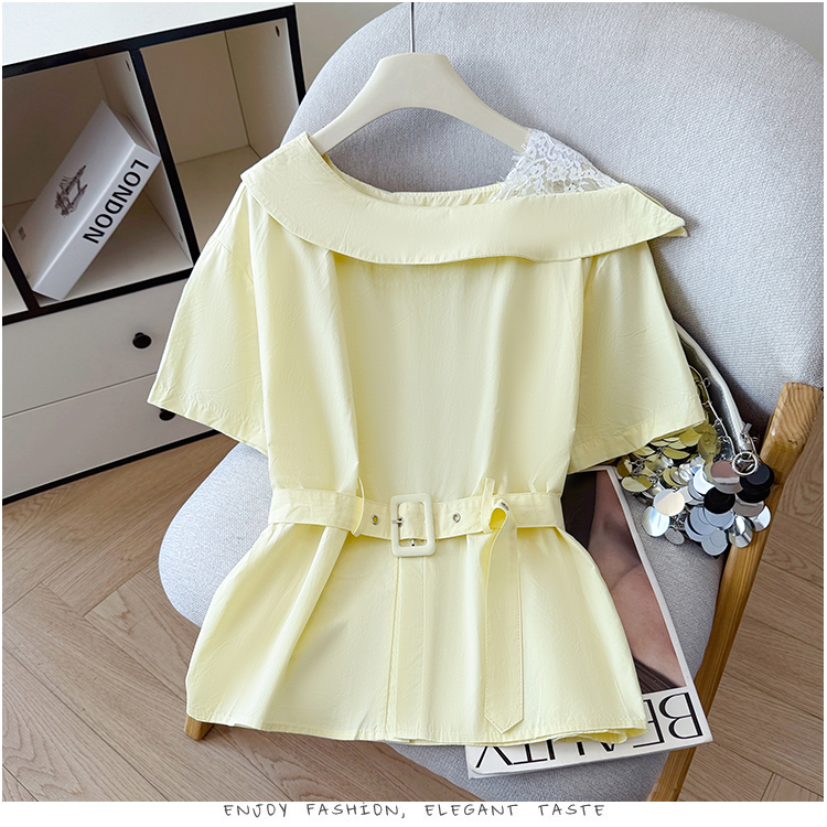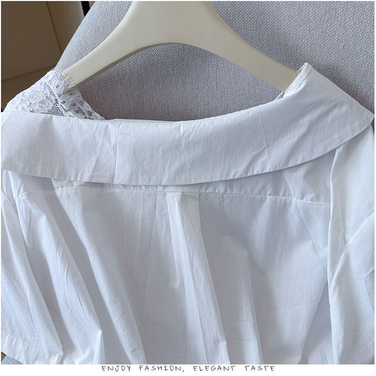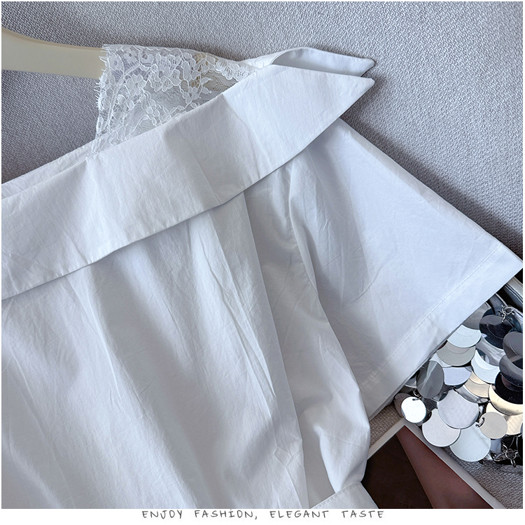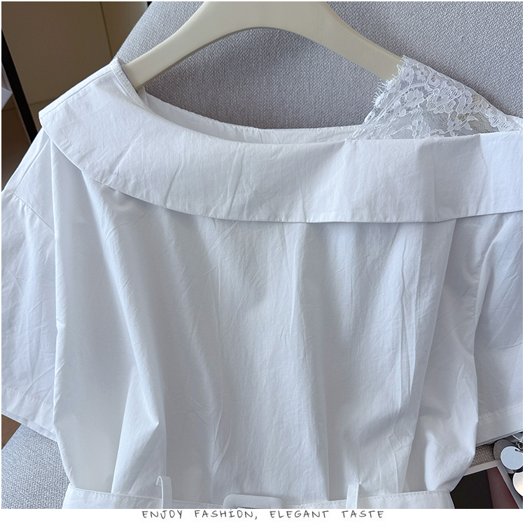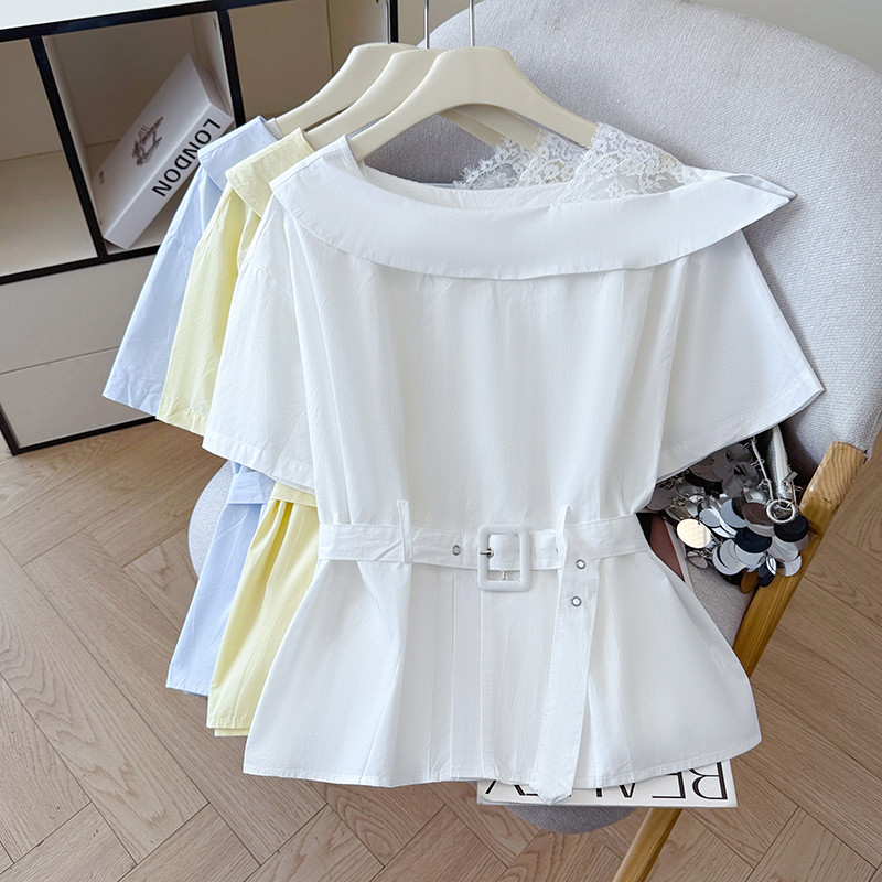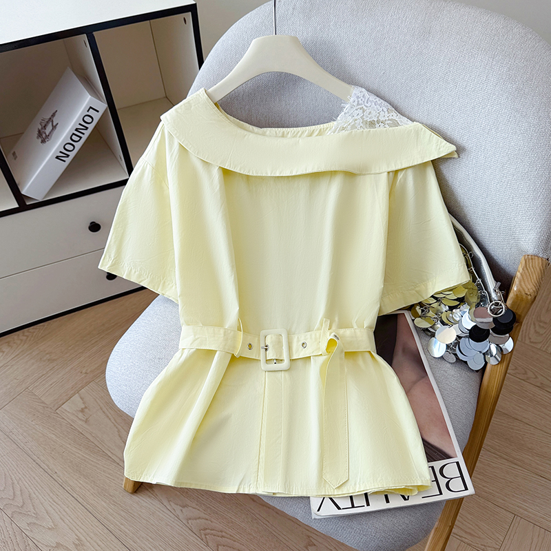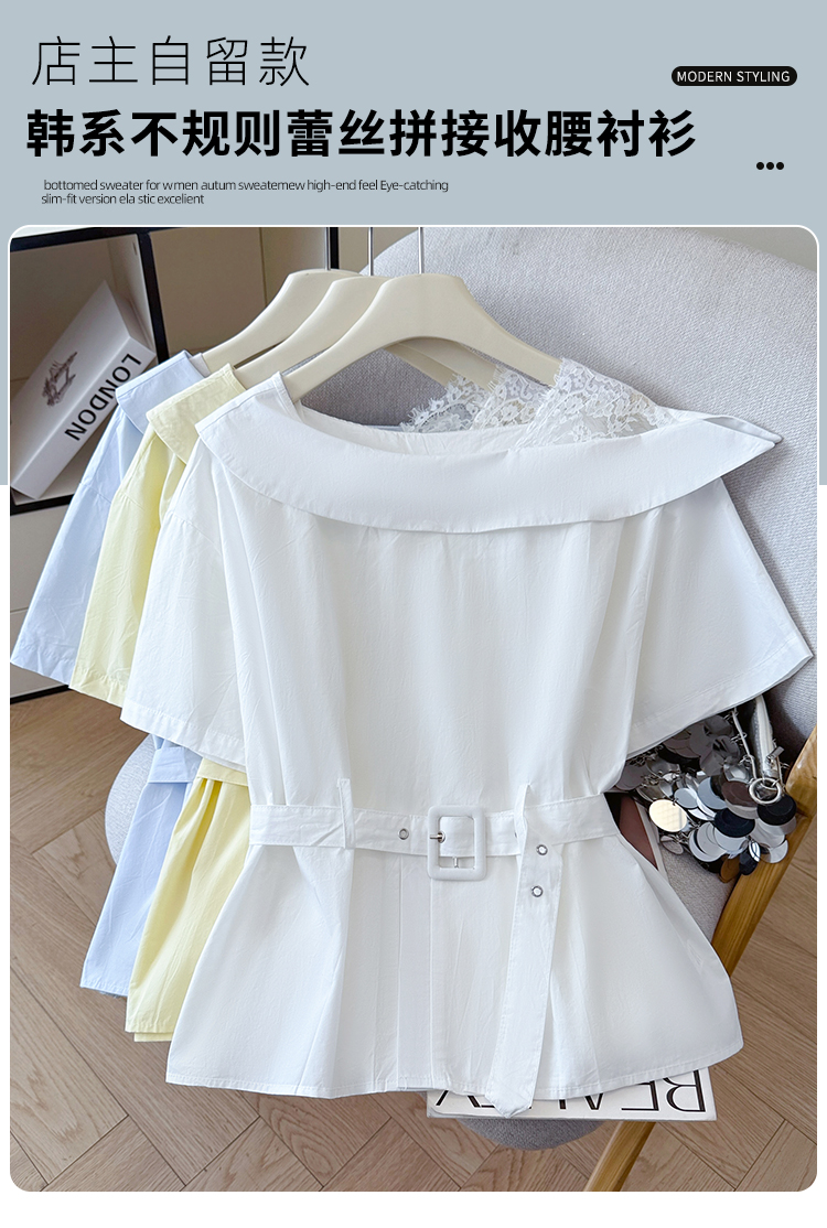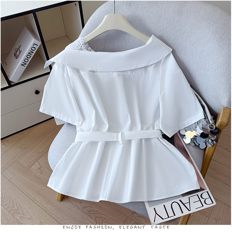 RY3522# 夏季新款设计感白色露肩短袖衬衫女洋气遮肉宽松斜肩上衣收腰显瘦