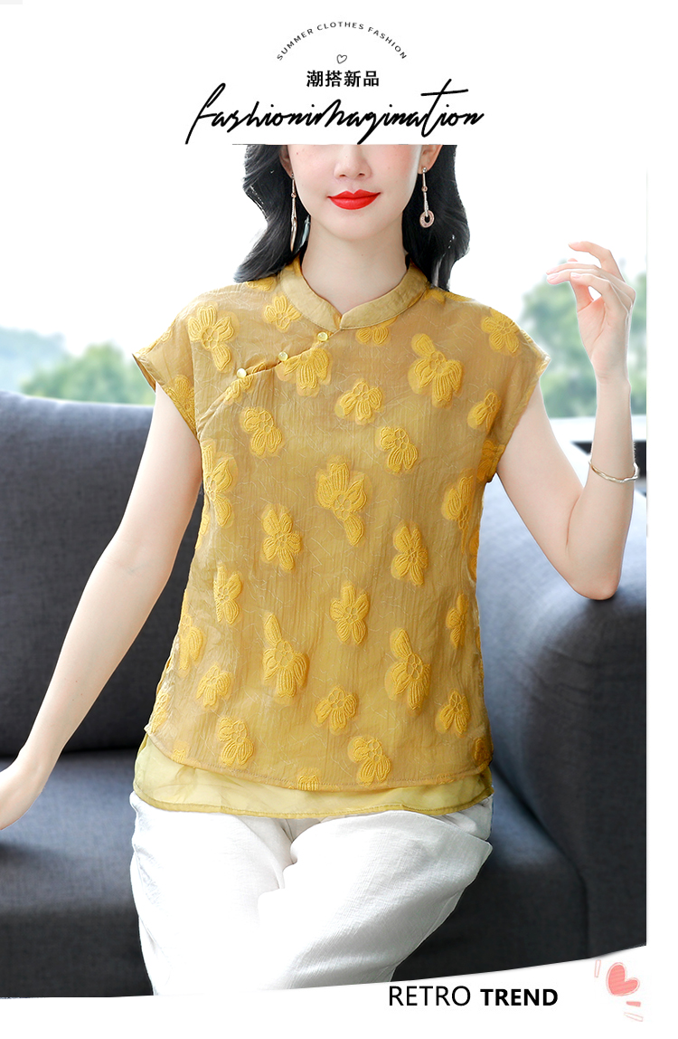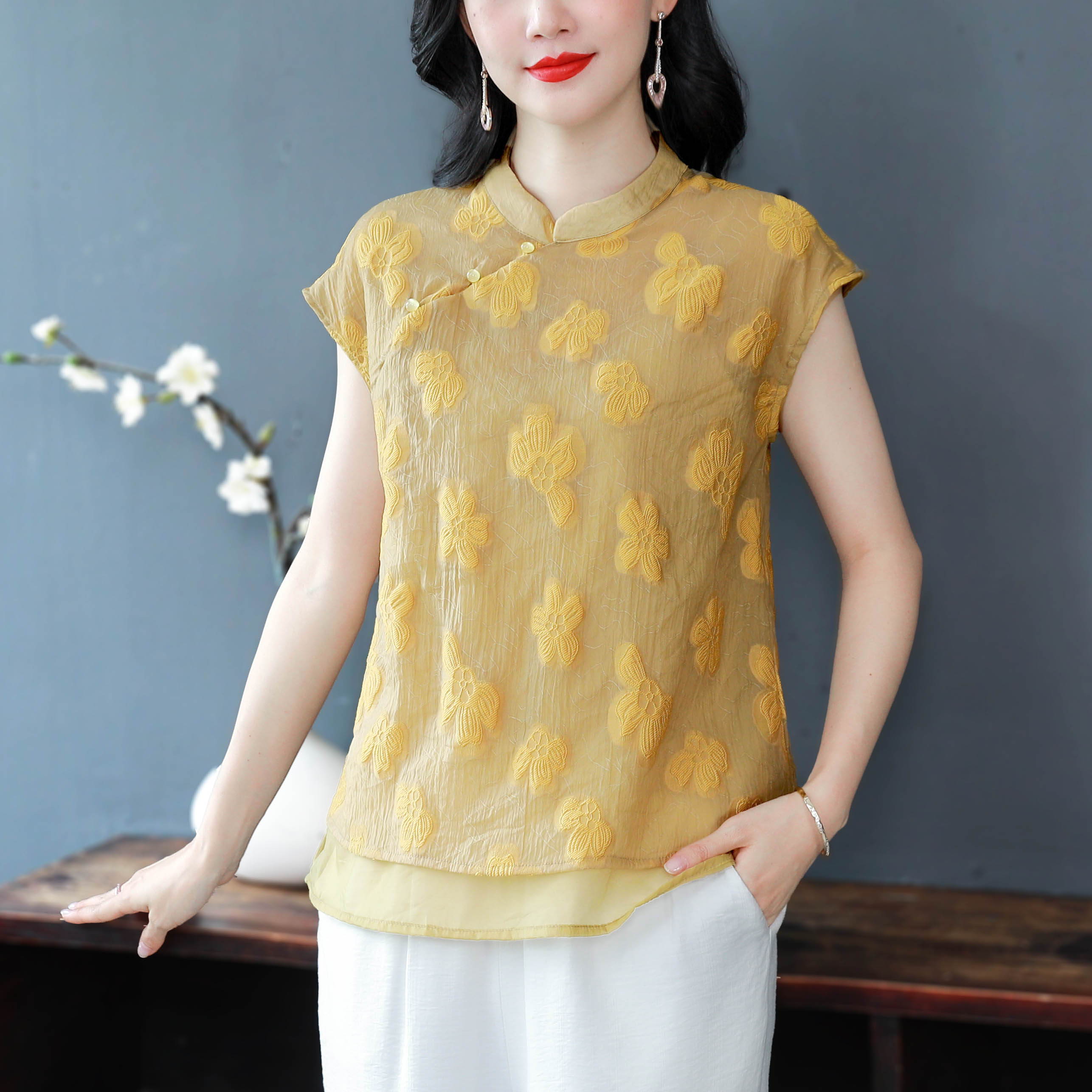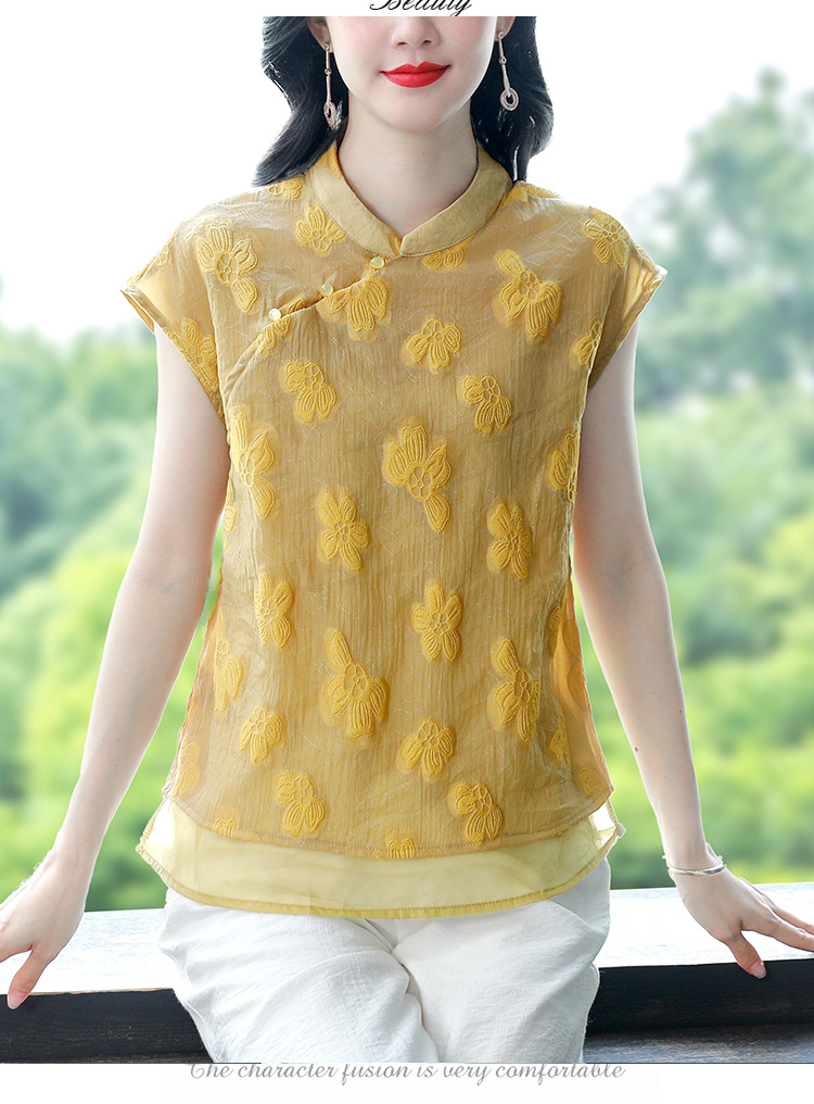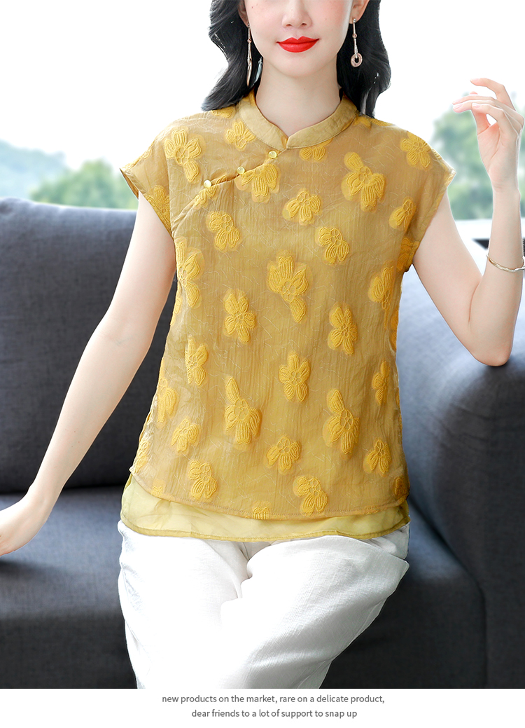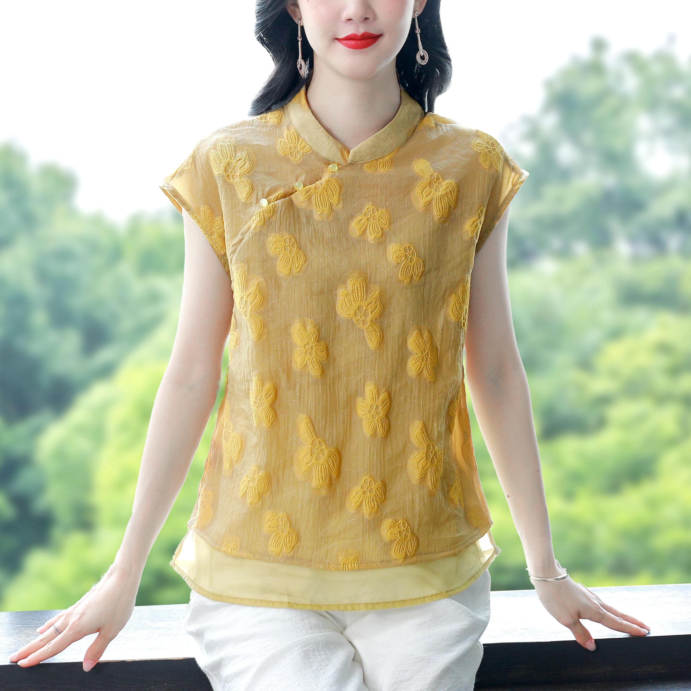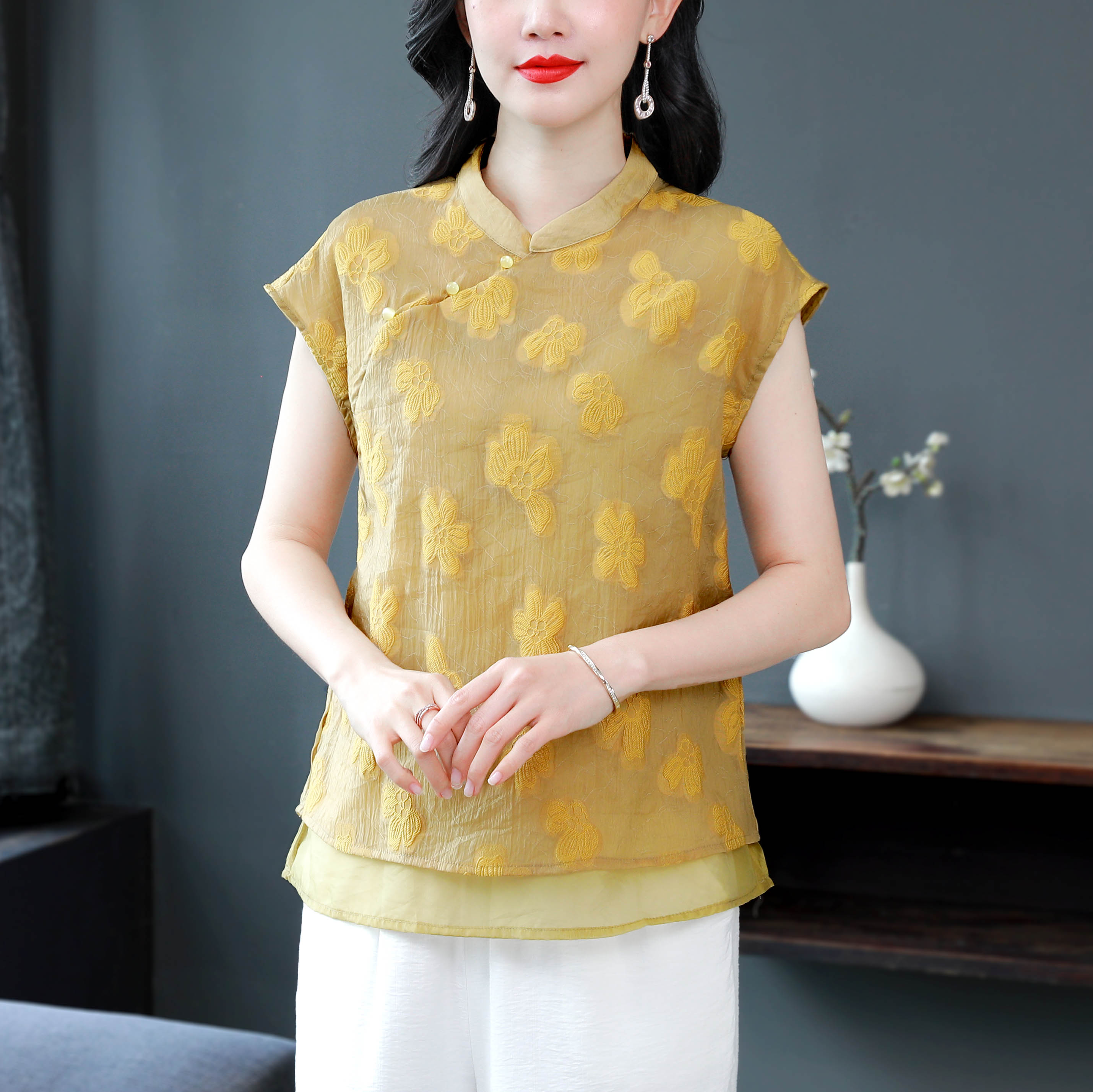 RY3528# 春夏新款国风立领盘扣刺绣落肩上衣百搭宽松气质显瘦小衫大码女