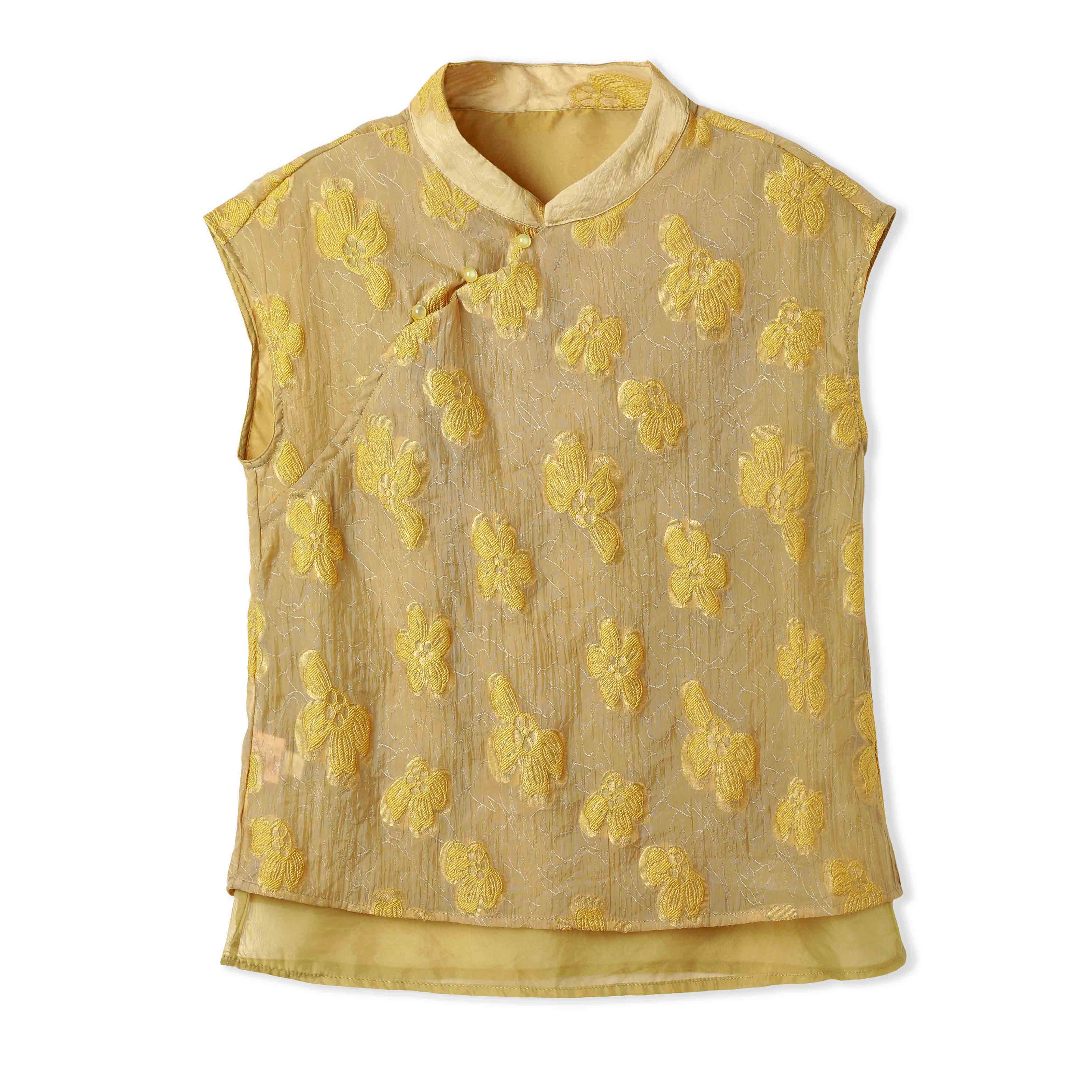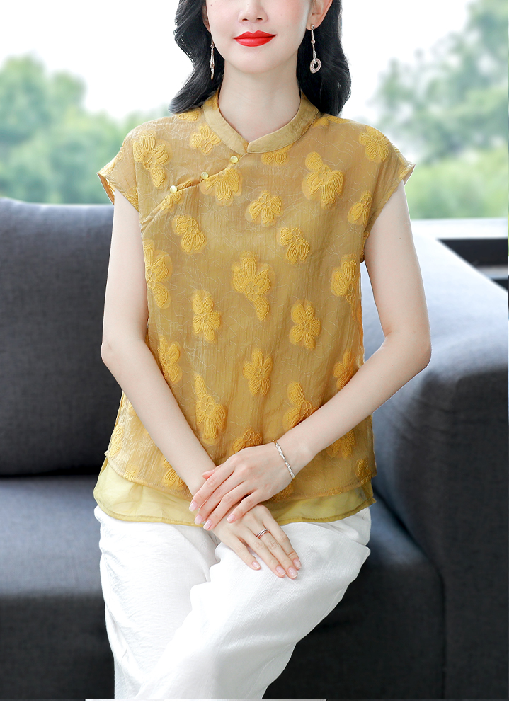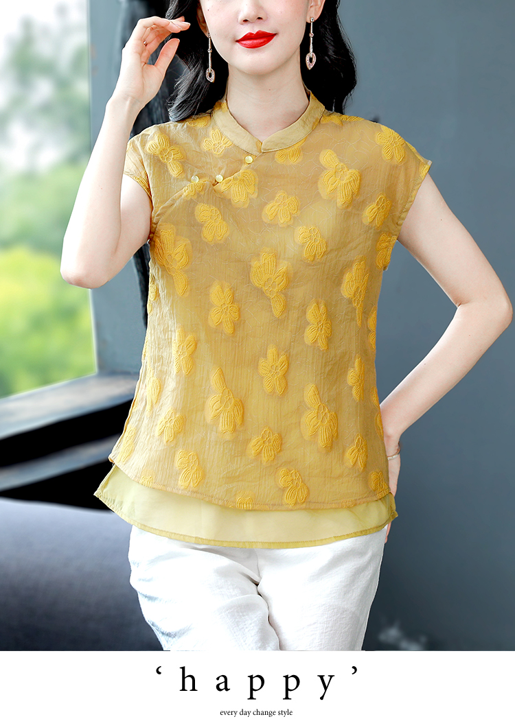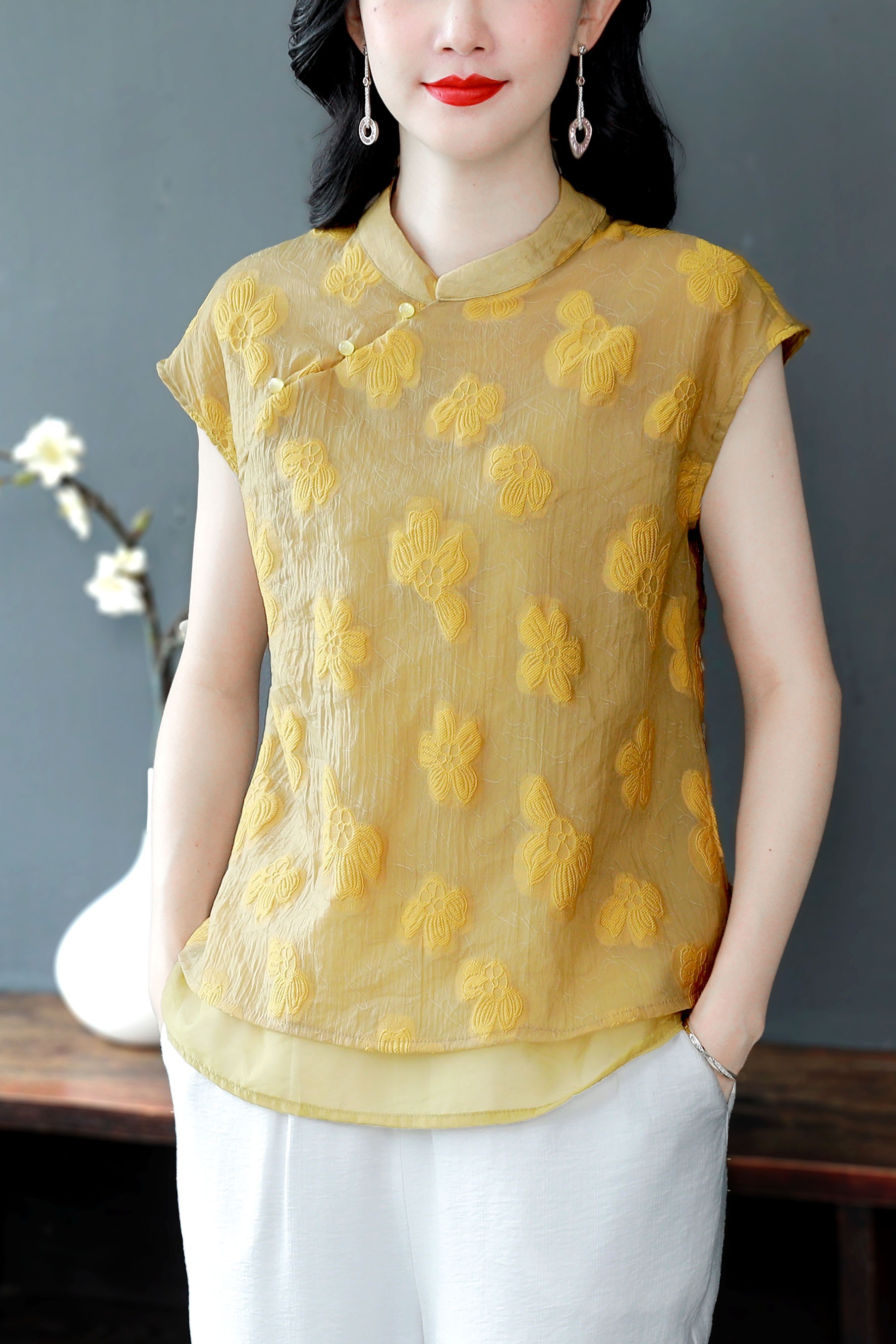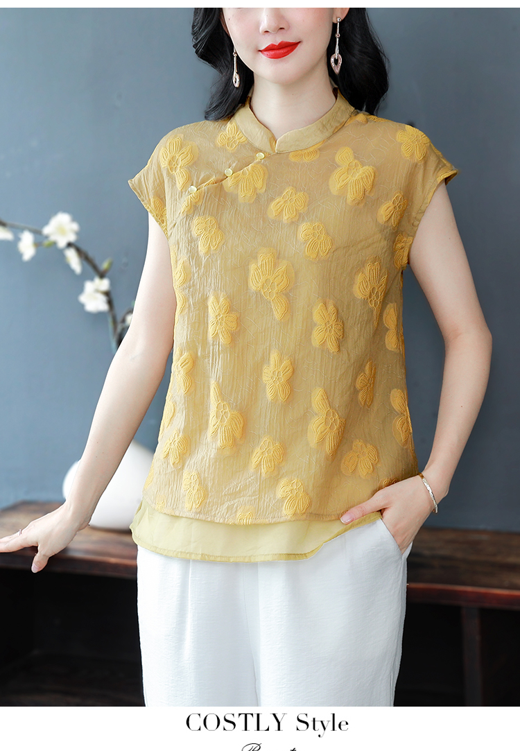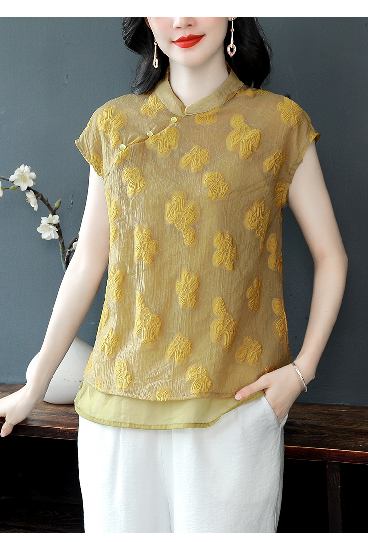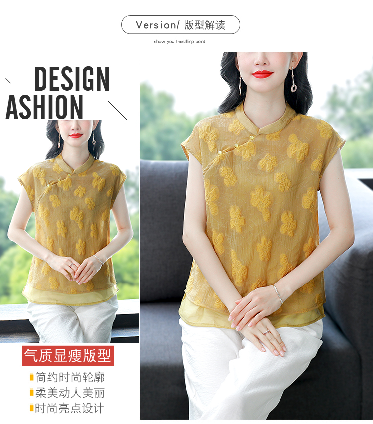 RY3528# 春夏新款国风立领盘扣刺绣落肩上衣百搭宽松气质显瘦小衫大码女