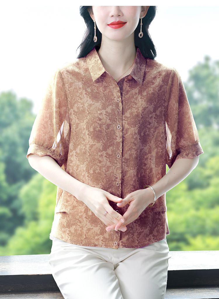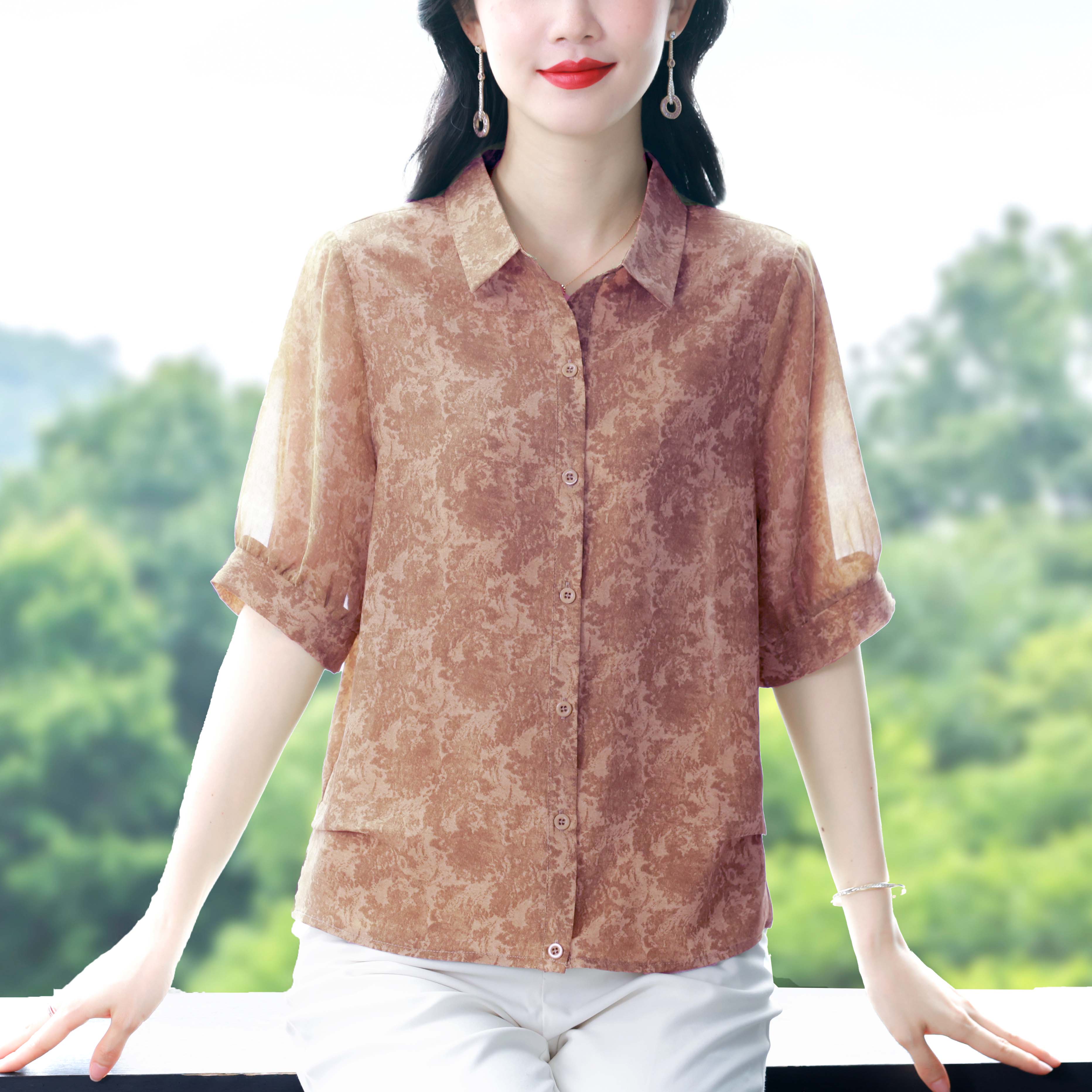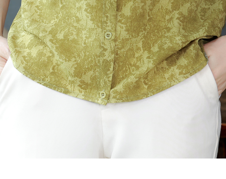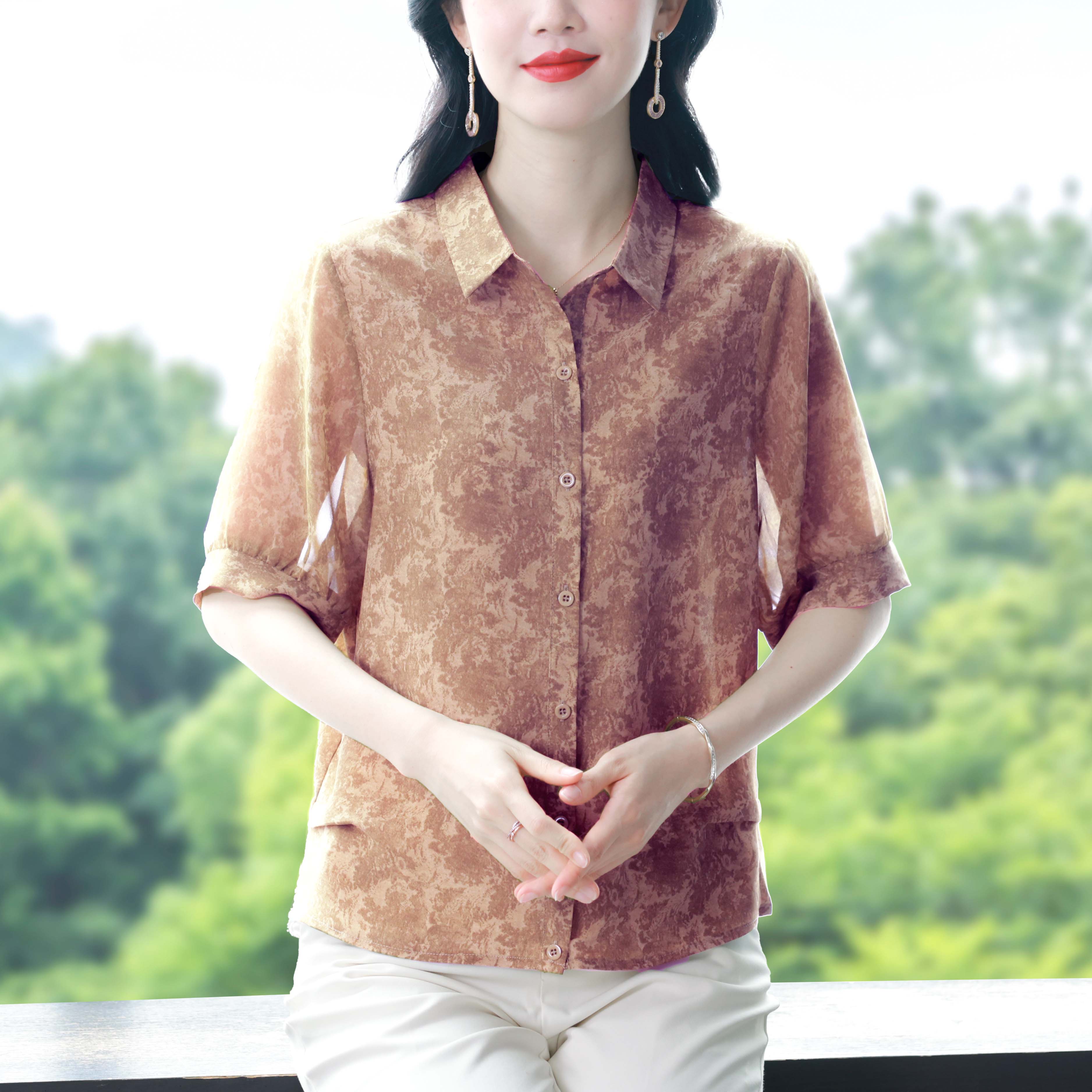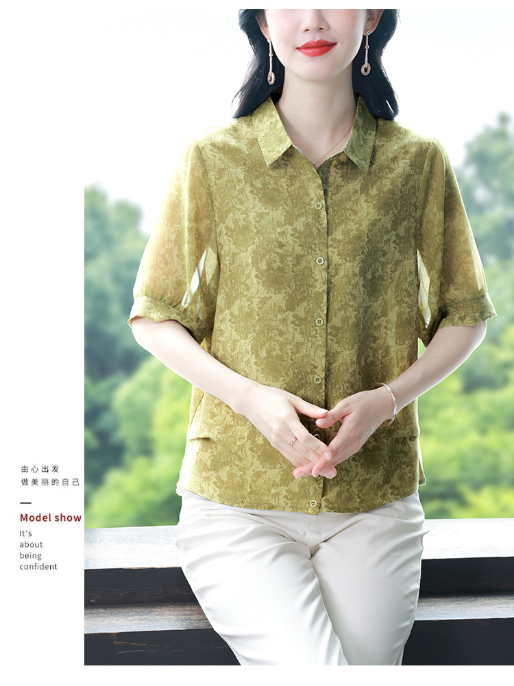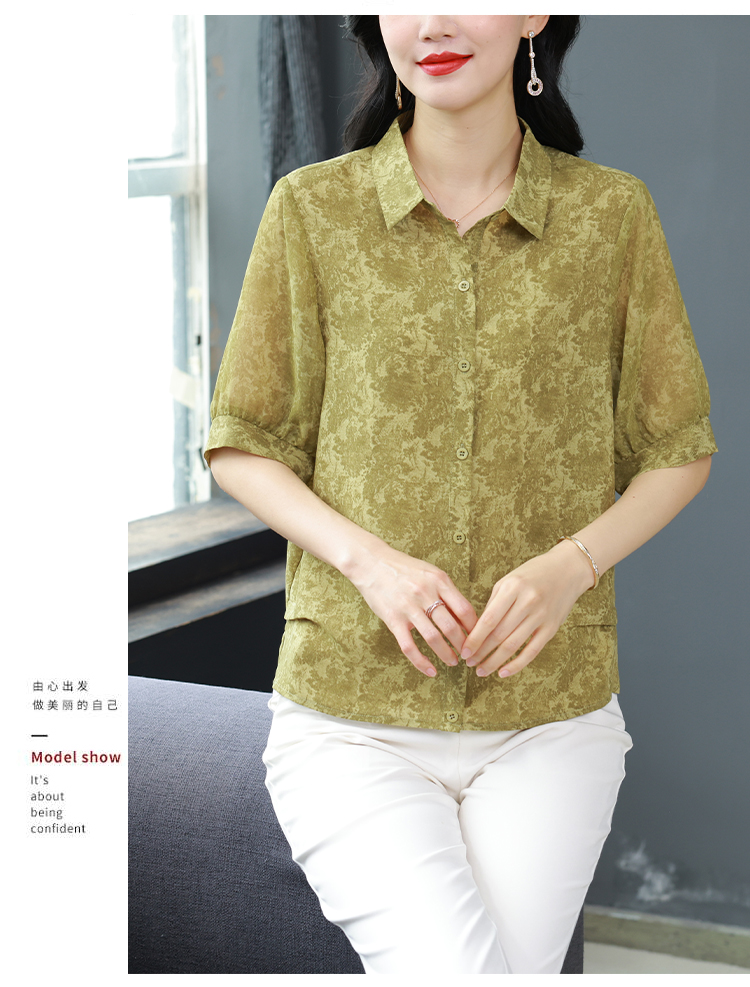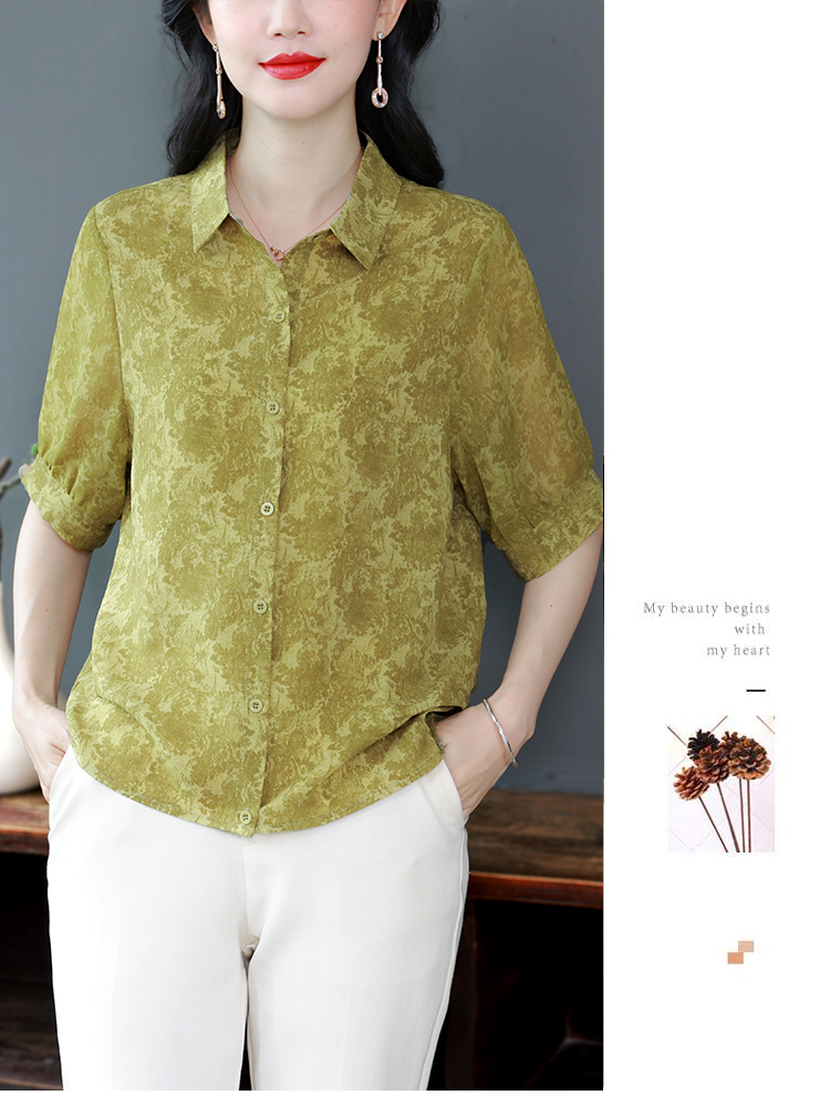 RY3530# 春夏新款七分袖真丝桑蚕丝雪纺翻领开襟衬衫防晒气质显瘦遮肚上衣