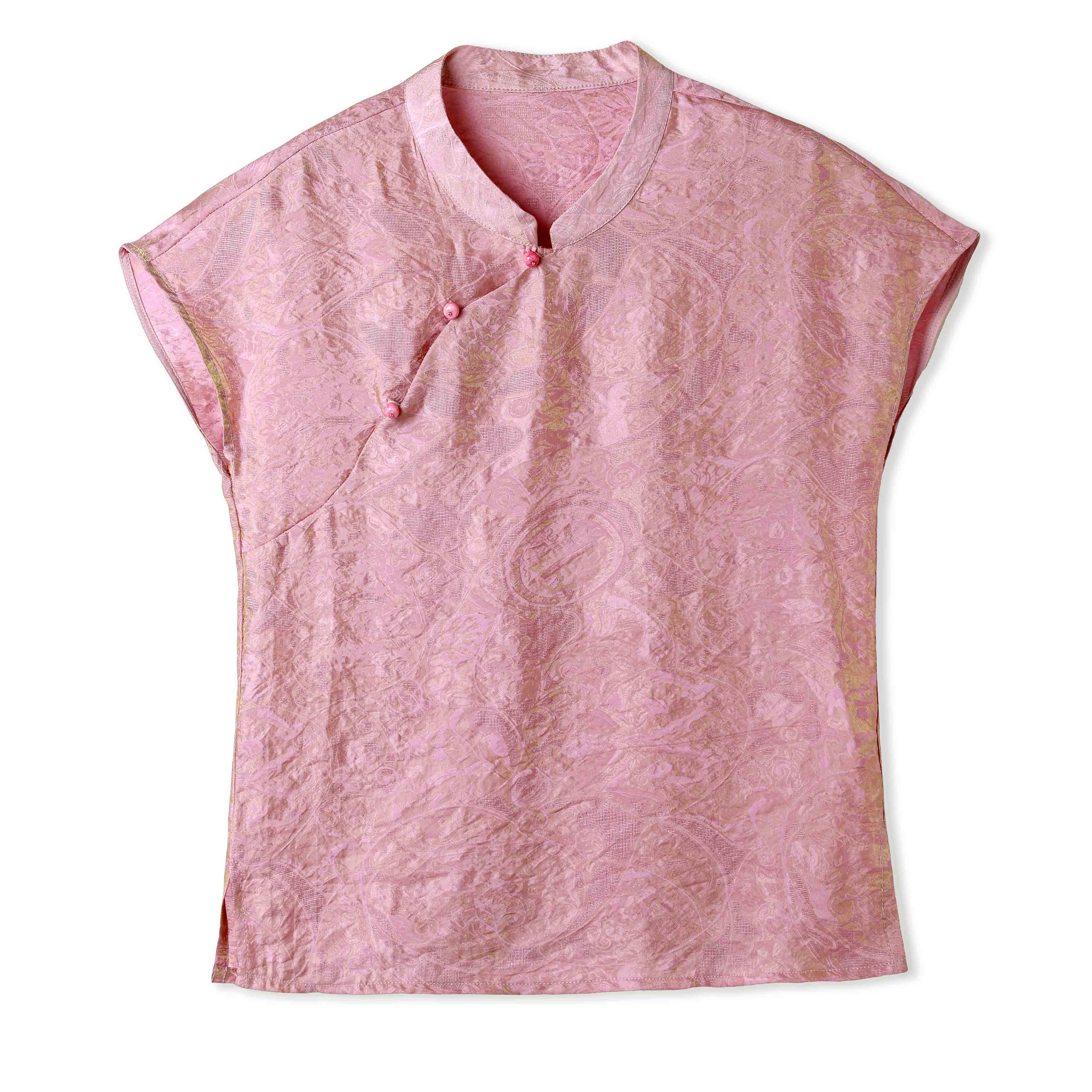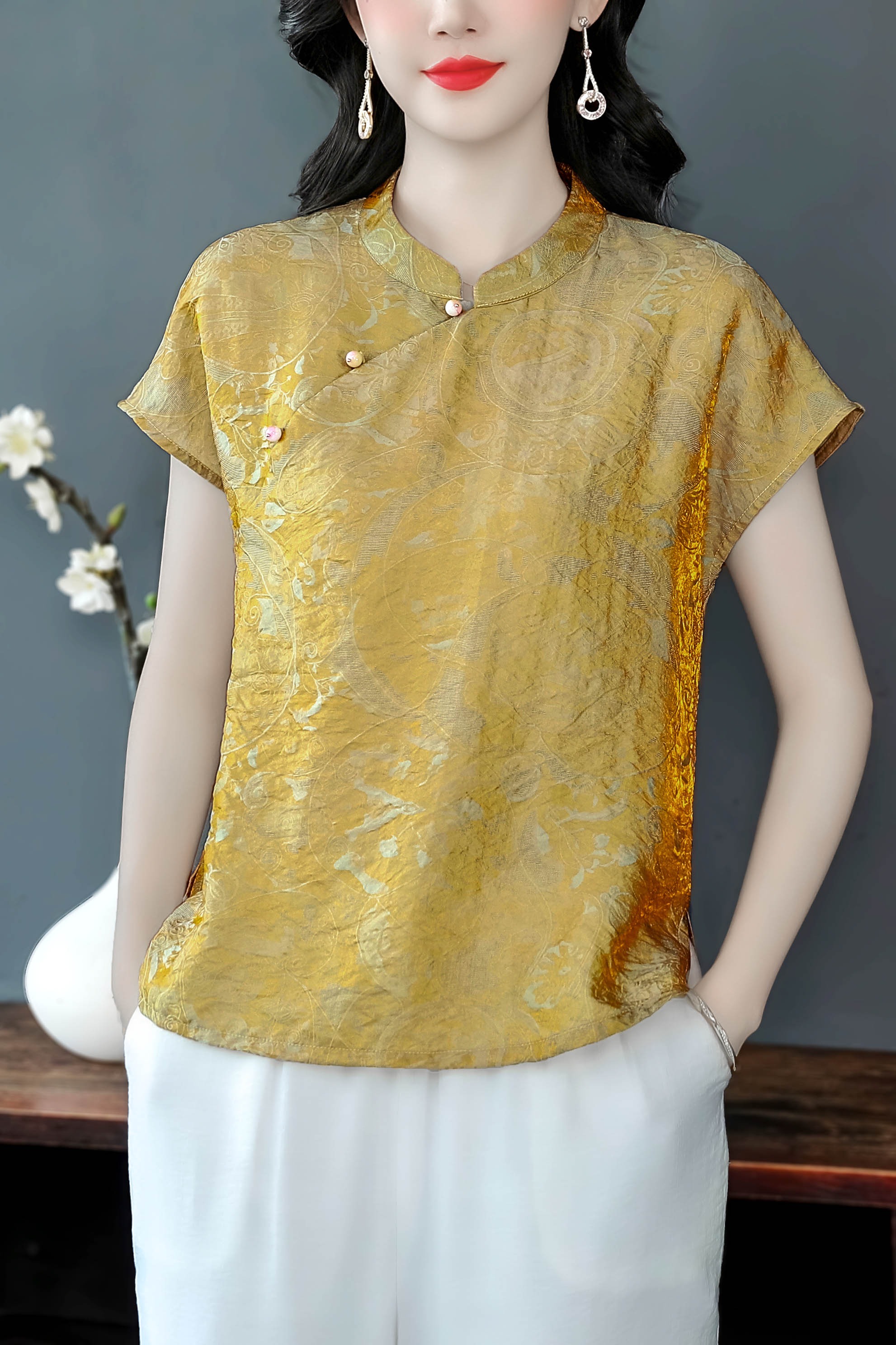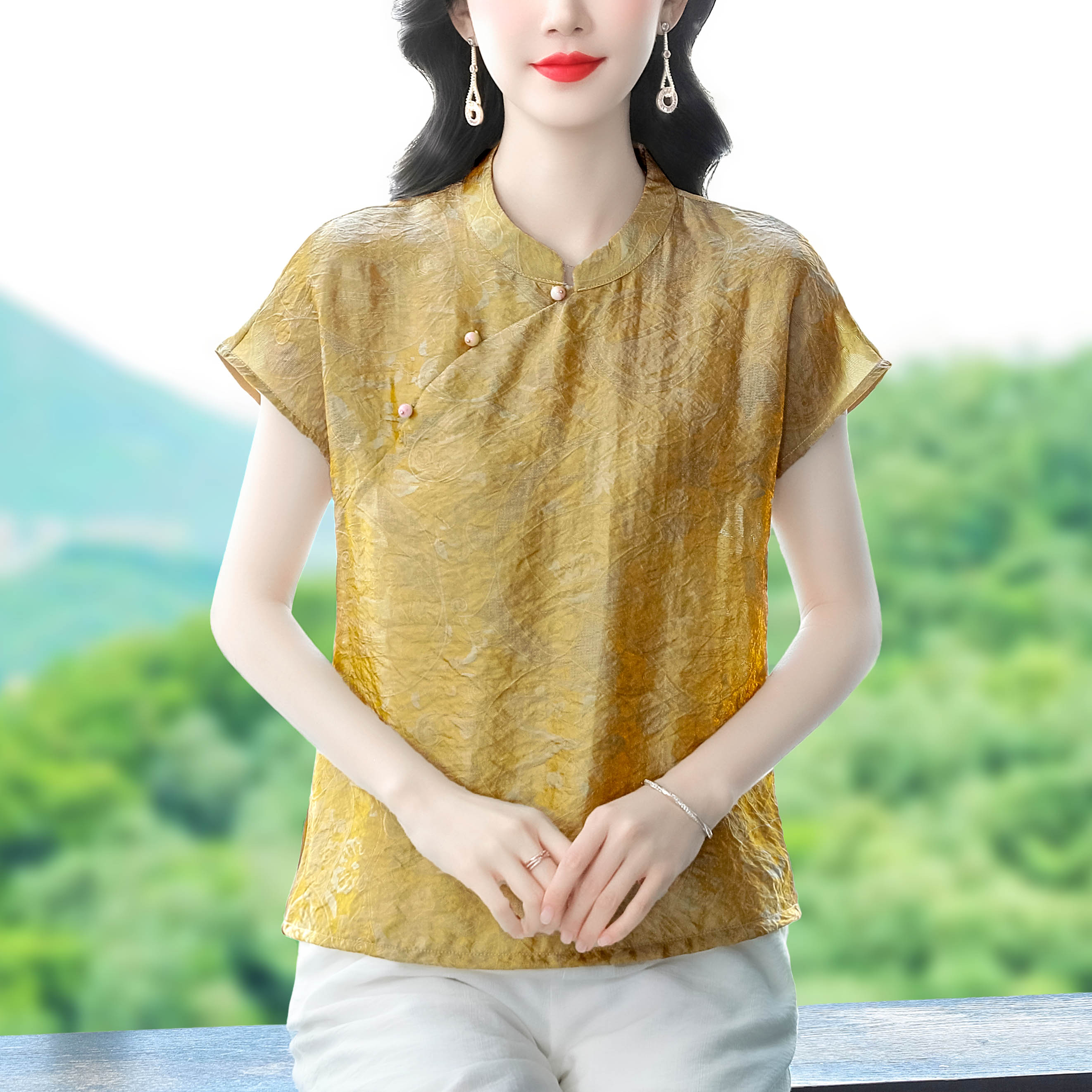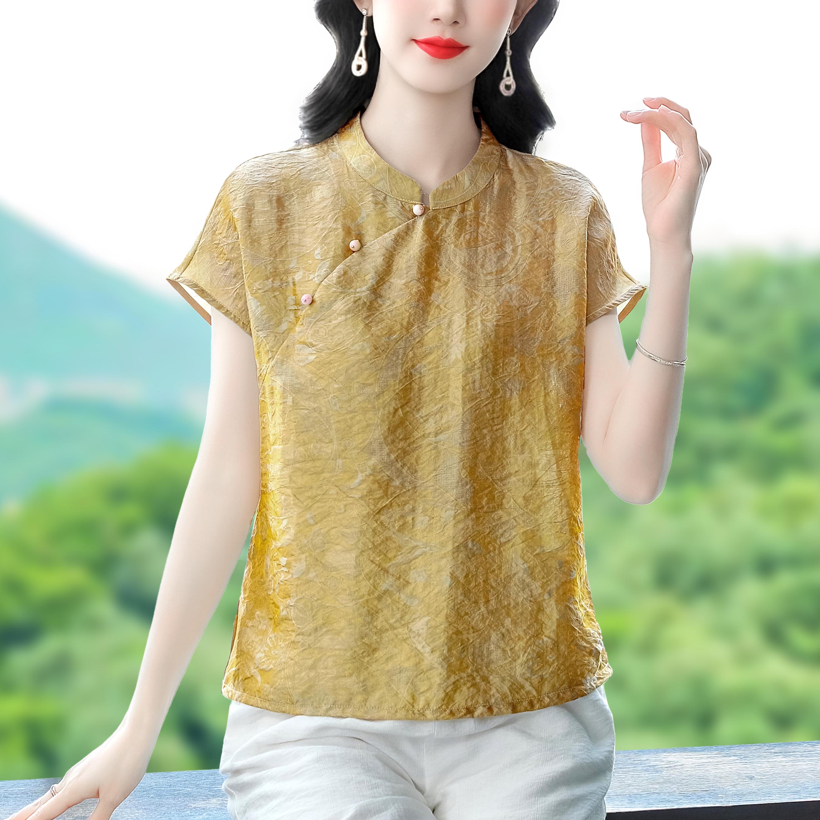 RY3532# 国风盘扣新中式提花香云纱立领盘扣衬衫洋气人丝上衣冰凉宽松舒适