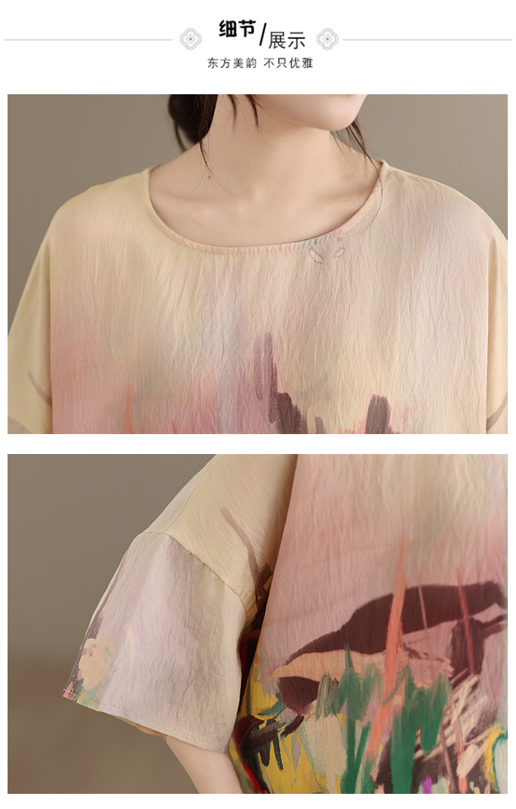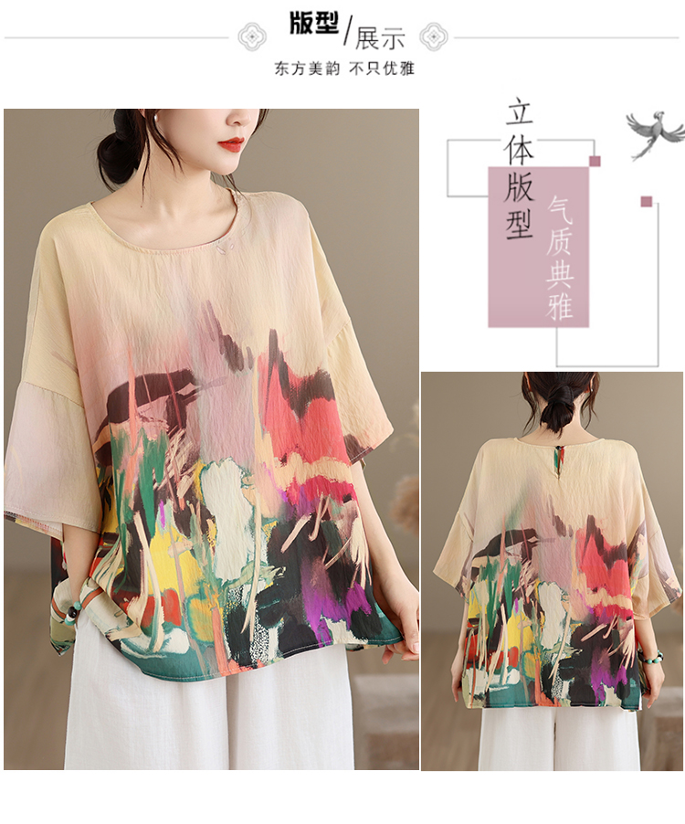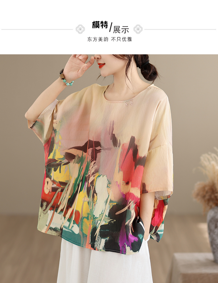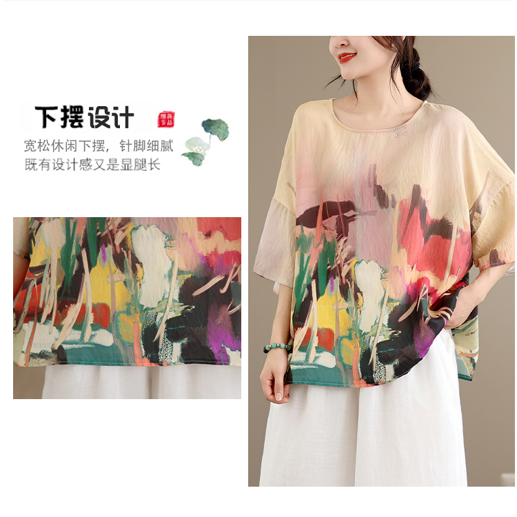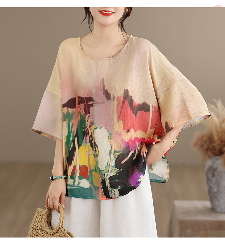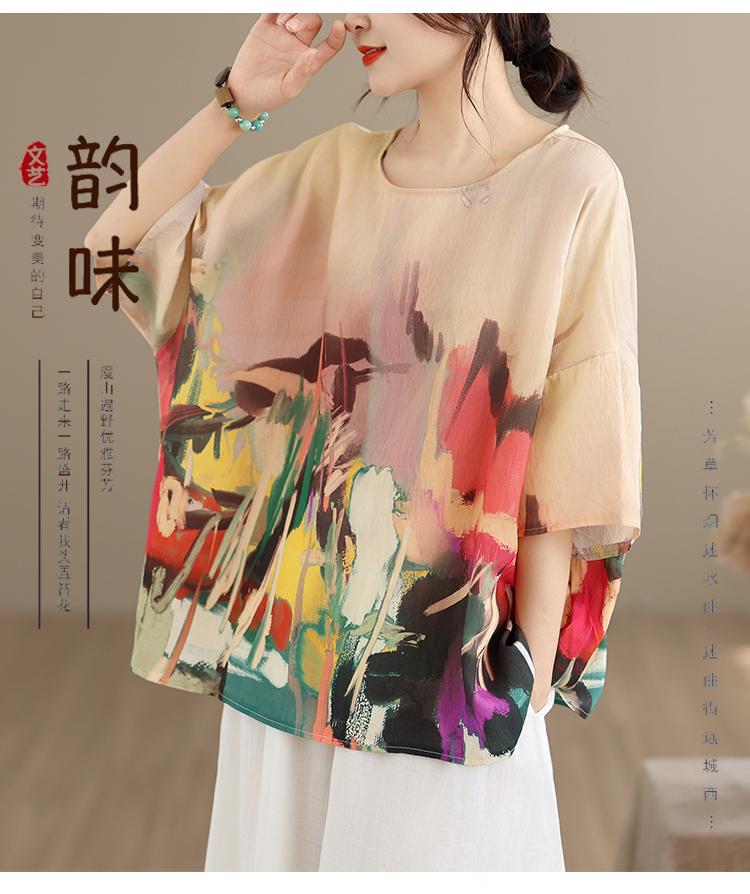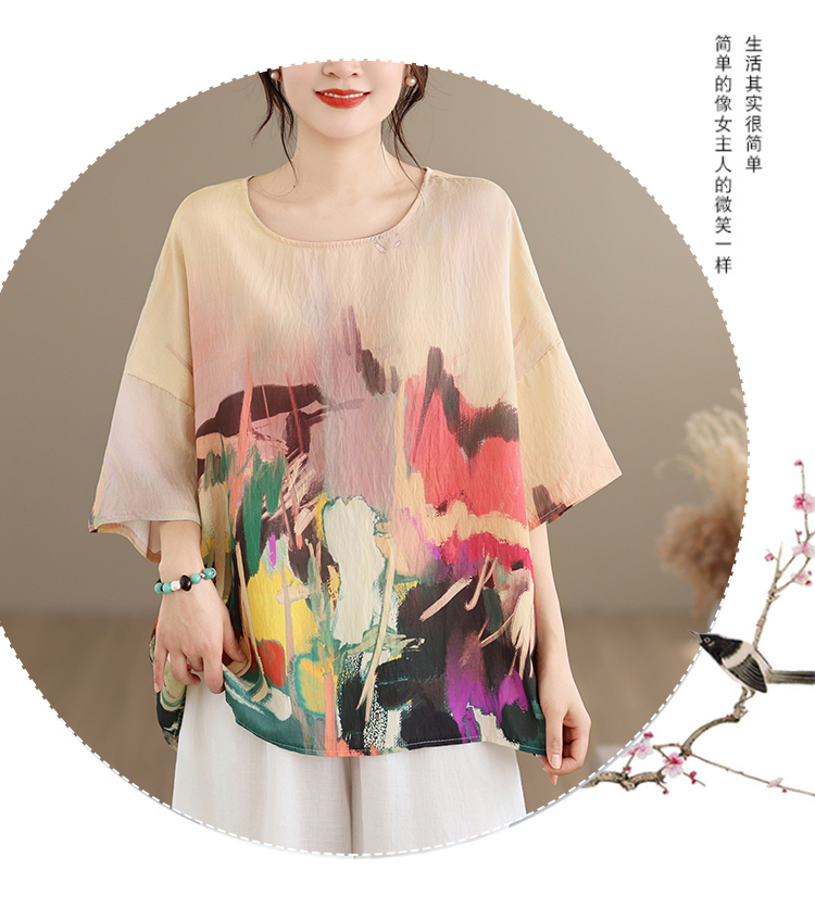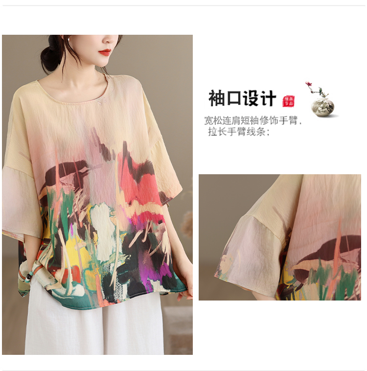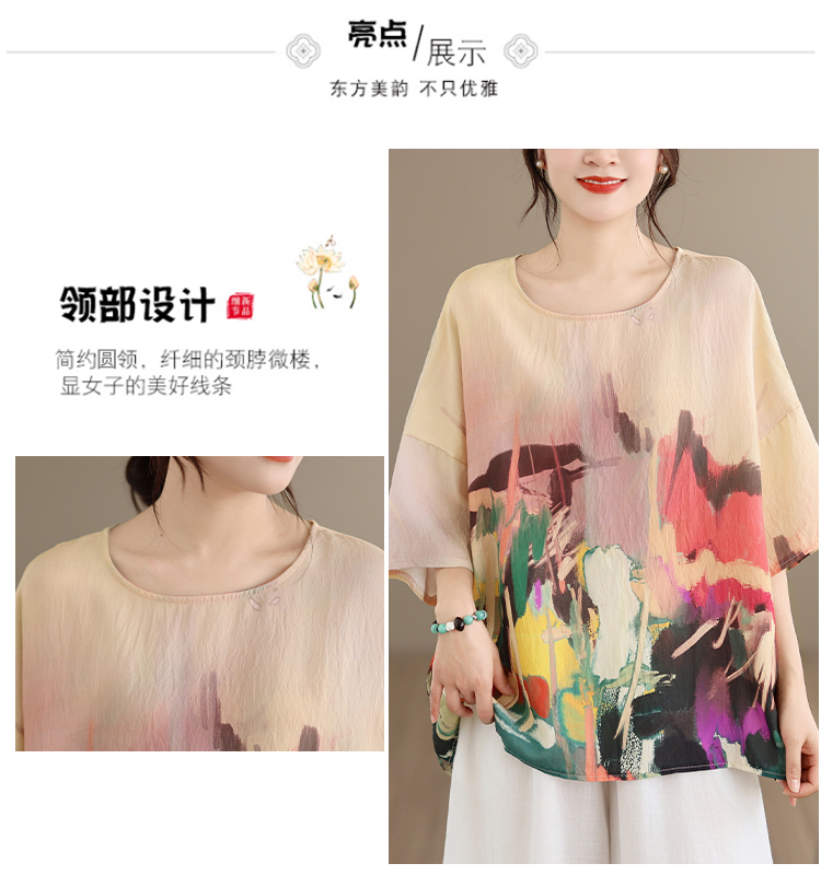 RY3566# 实拍2026夏季新品麻棉民族风蝙蝠袖宽松大码圆领T恤女