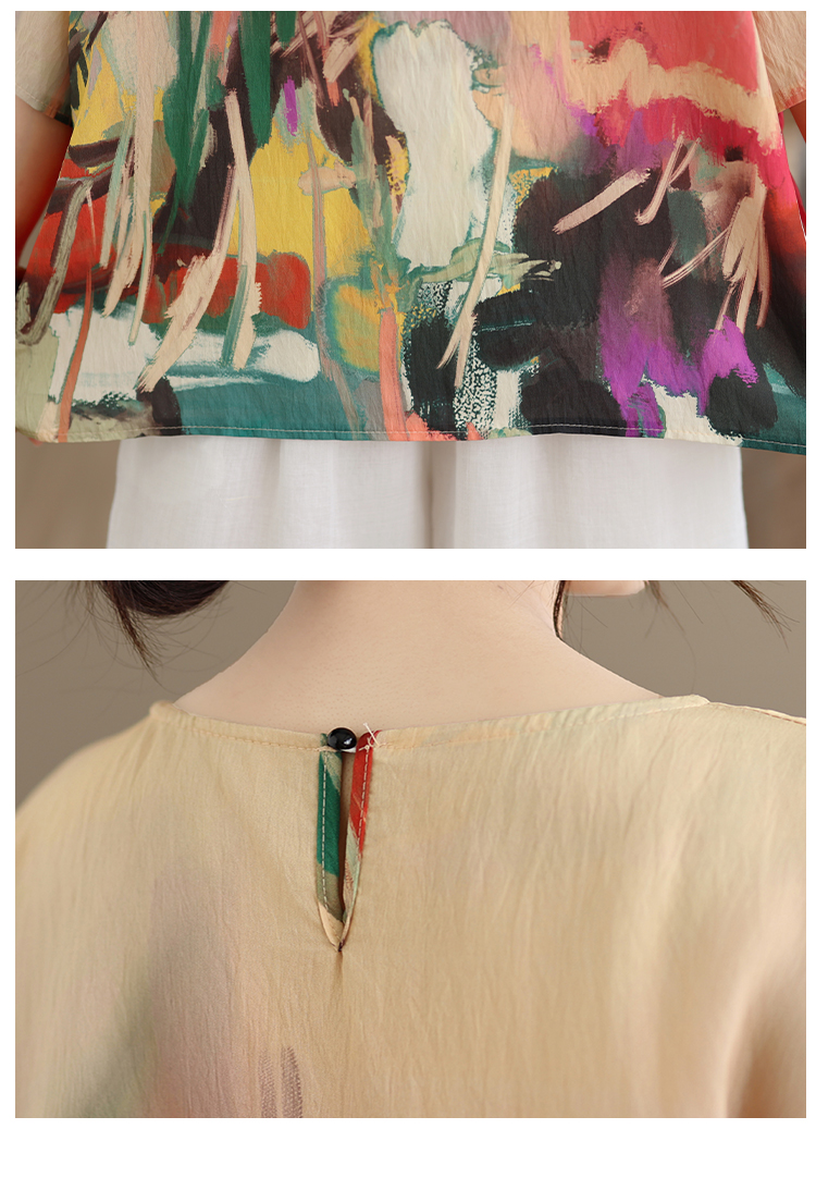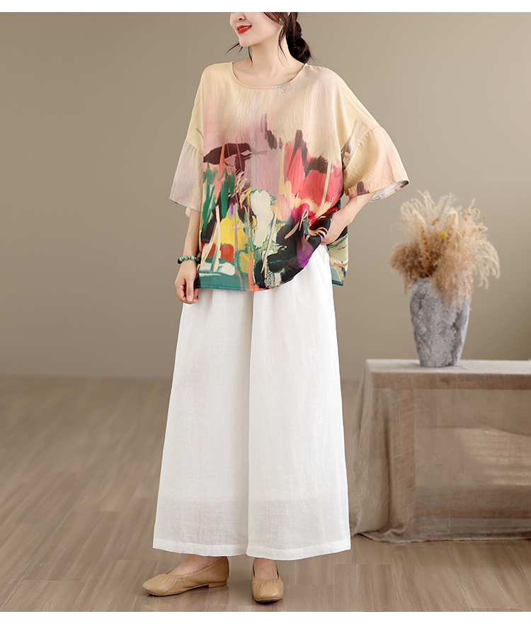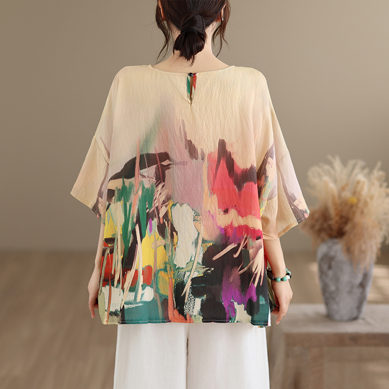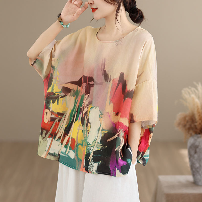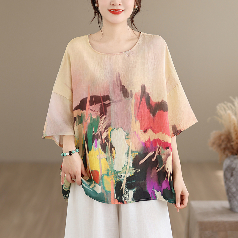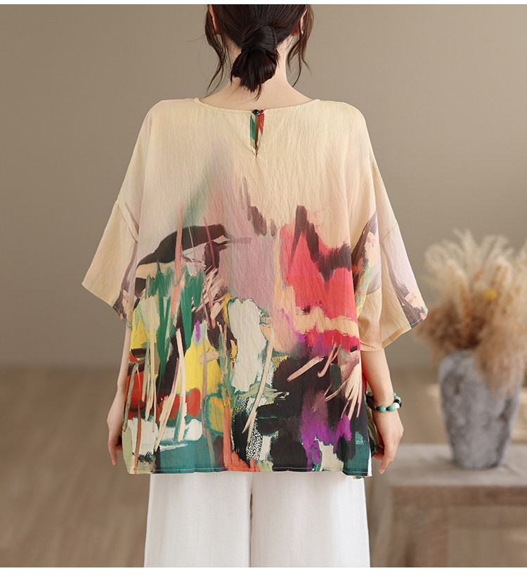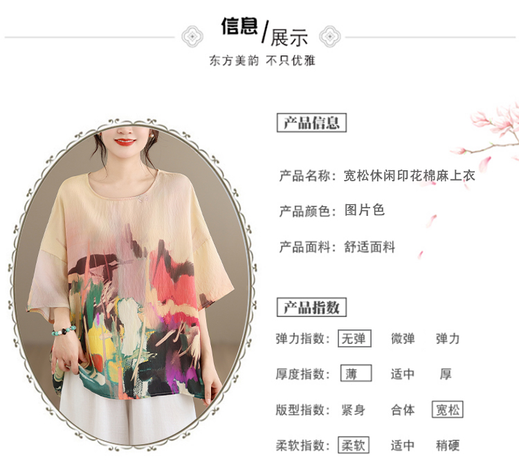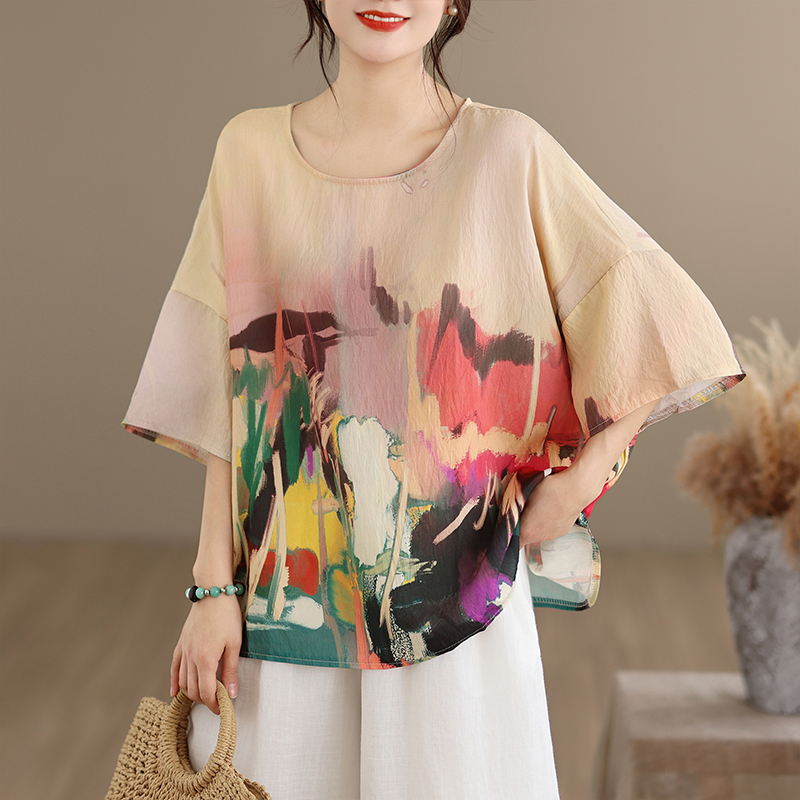 RY3566# 实拍2026夏季新品麻棉民族风蝙蝠袖宽松大码圆领T恤女