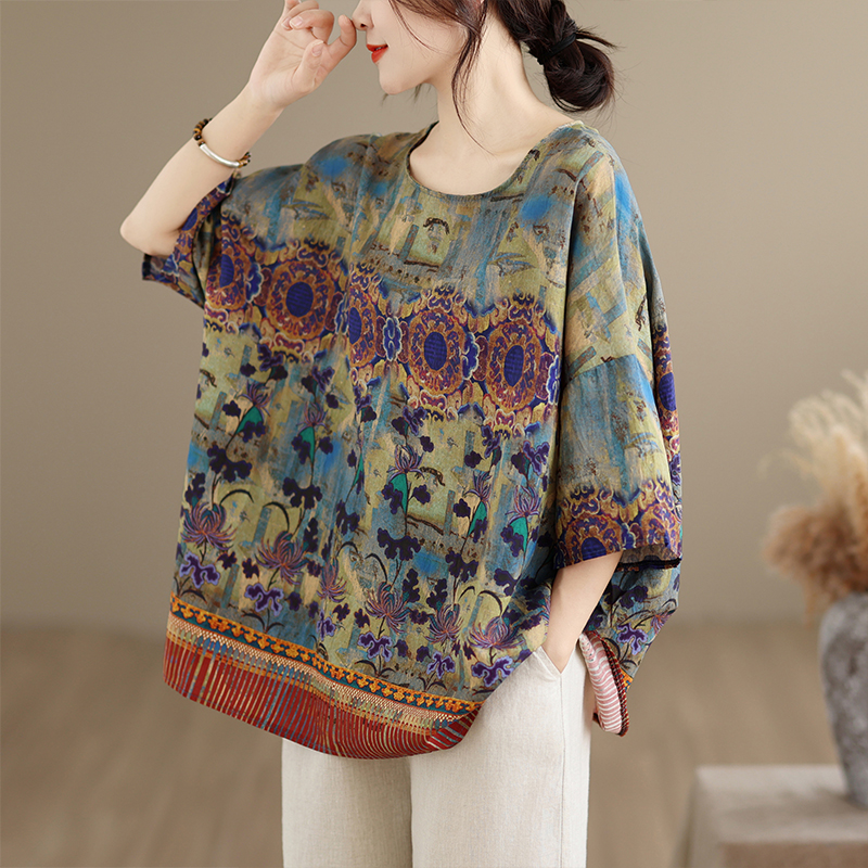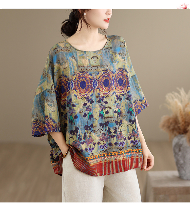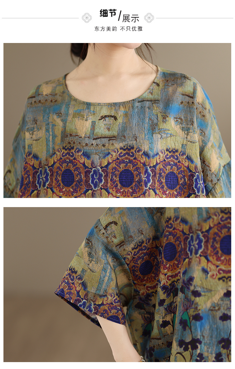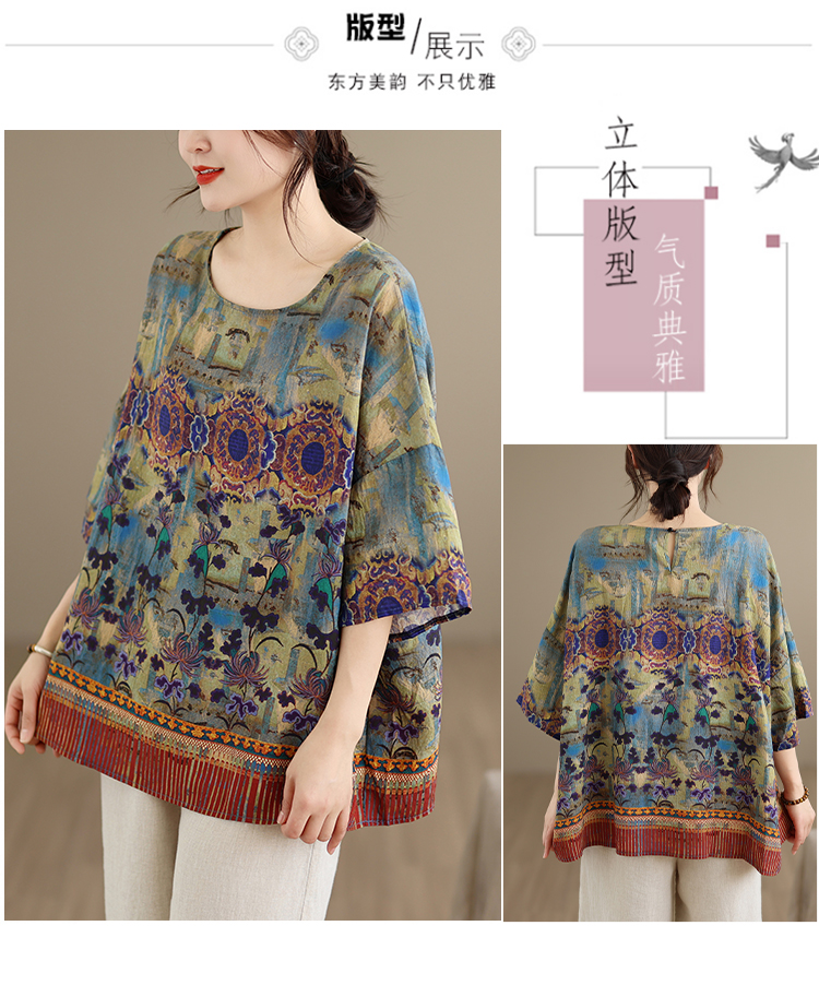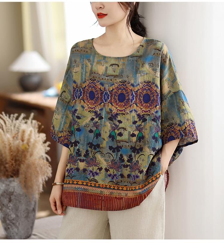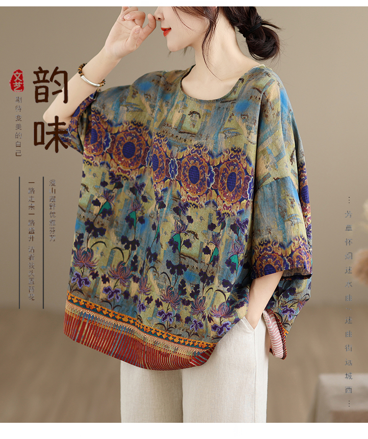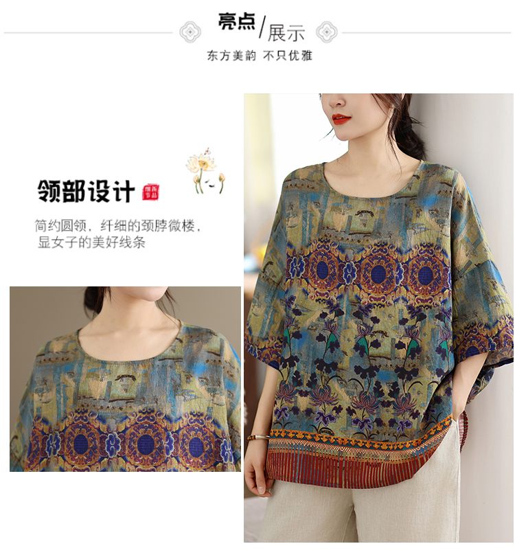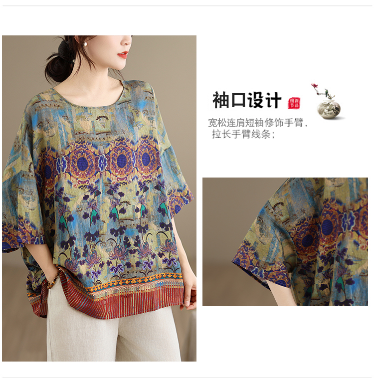 RY3570# 实拍2026夏季新品麻棉民族风蝙蝠袖宽松大码圆领T恤女