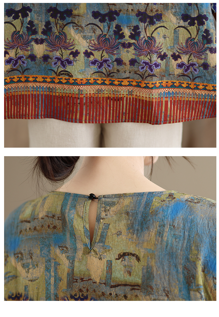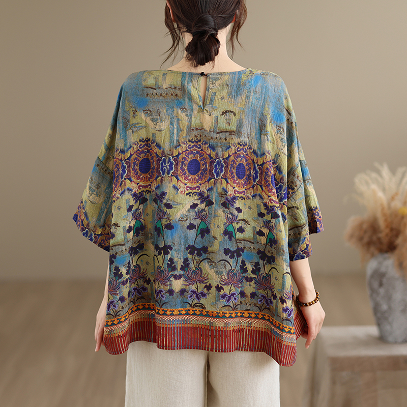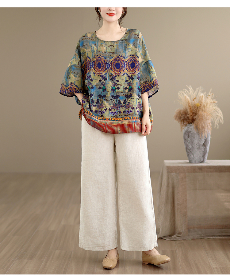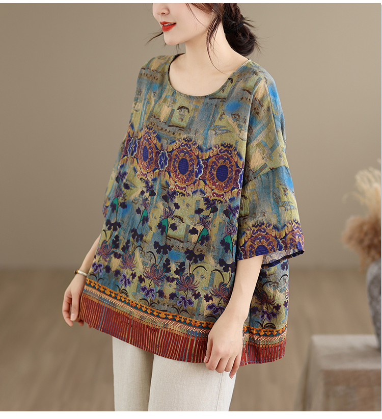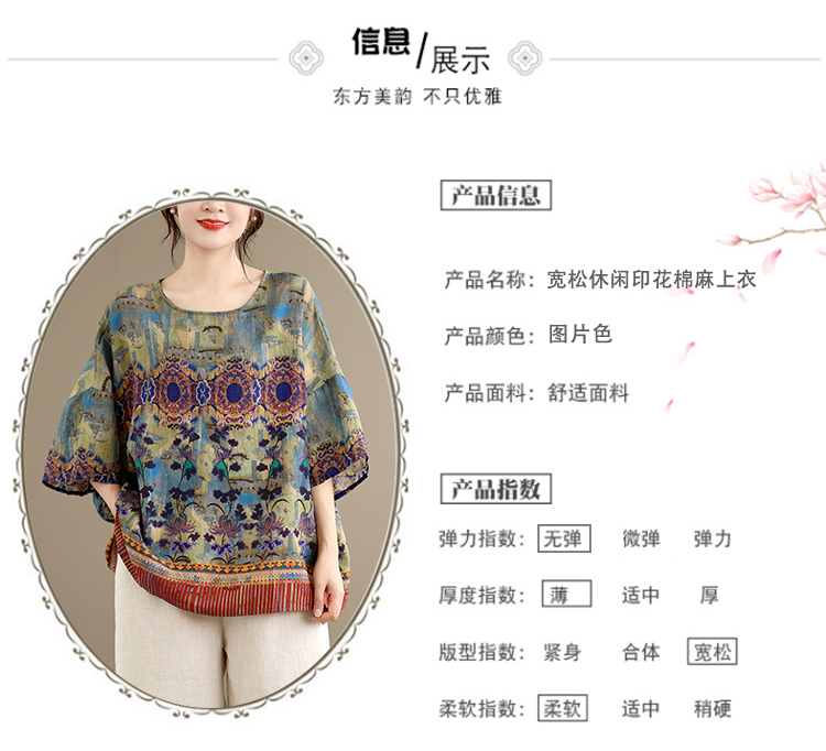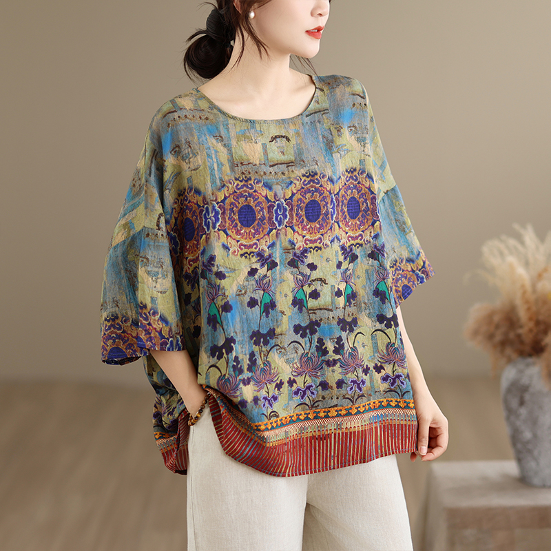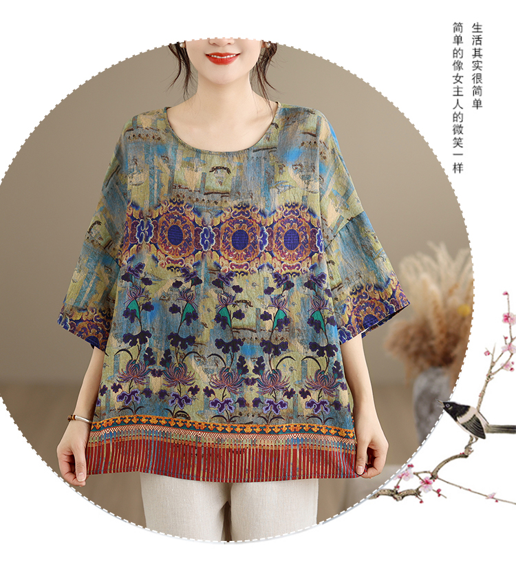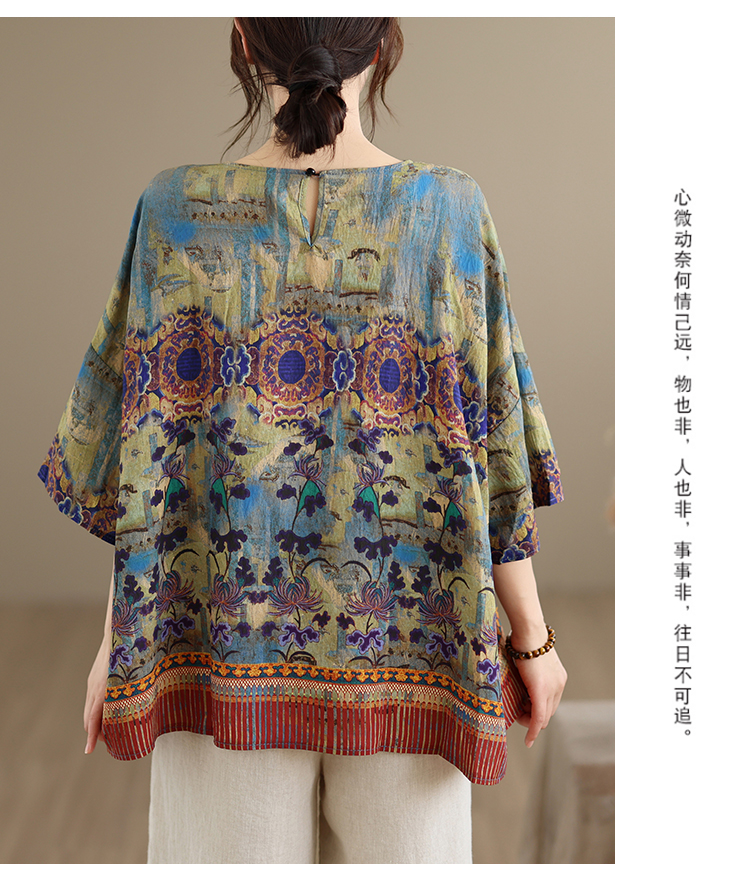 RY3570# 实拍2026夏季新品麻棉民族风蝙蝠袖宽松大码圆领T恤女