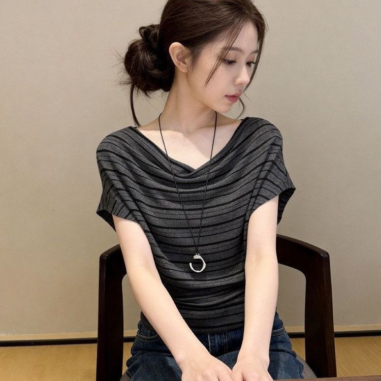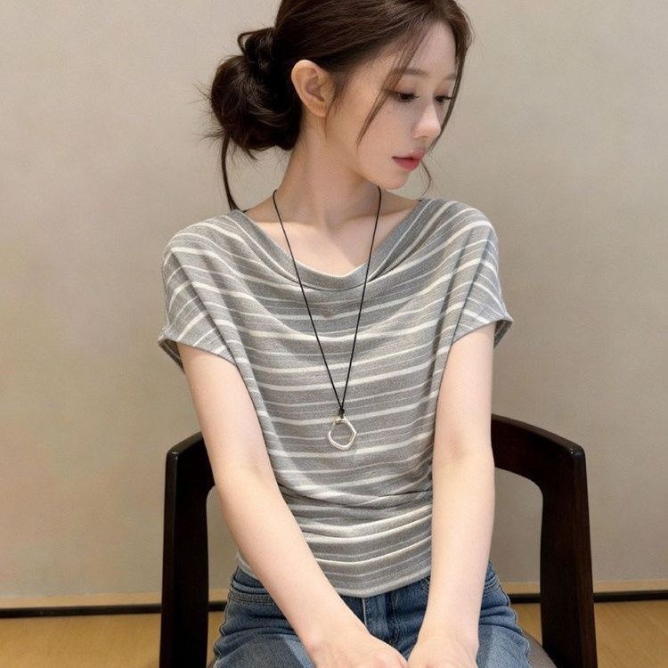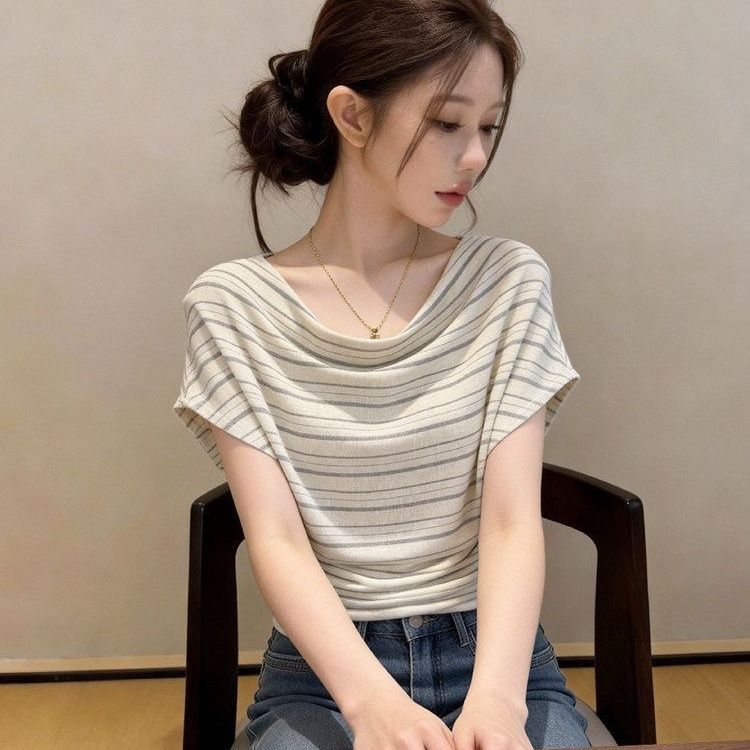 RY3589# 设计感荡领条纹短袖t恤女夏时尚洋气减龄百搭体恤韩系漂亮小上衣