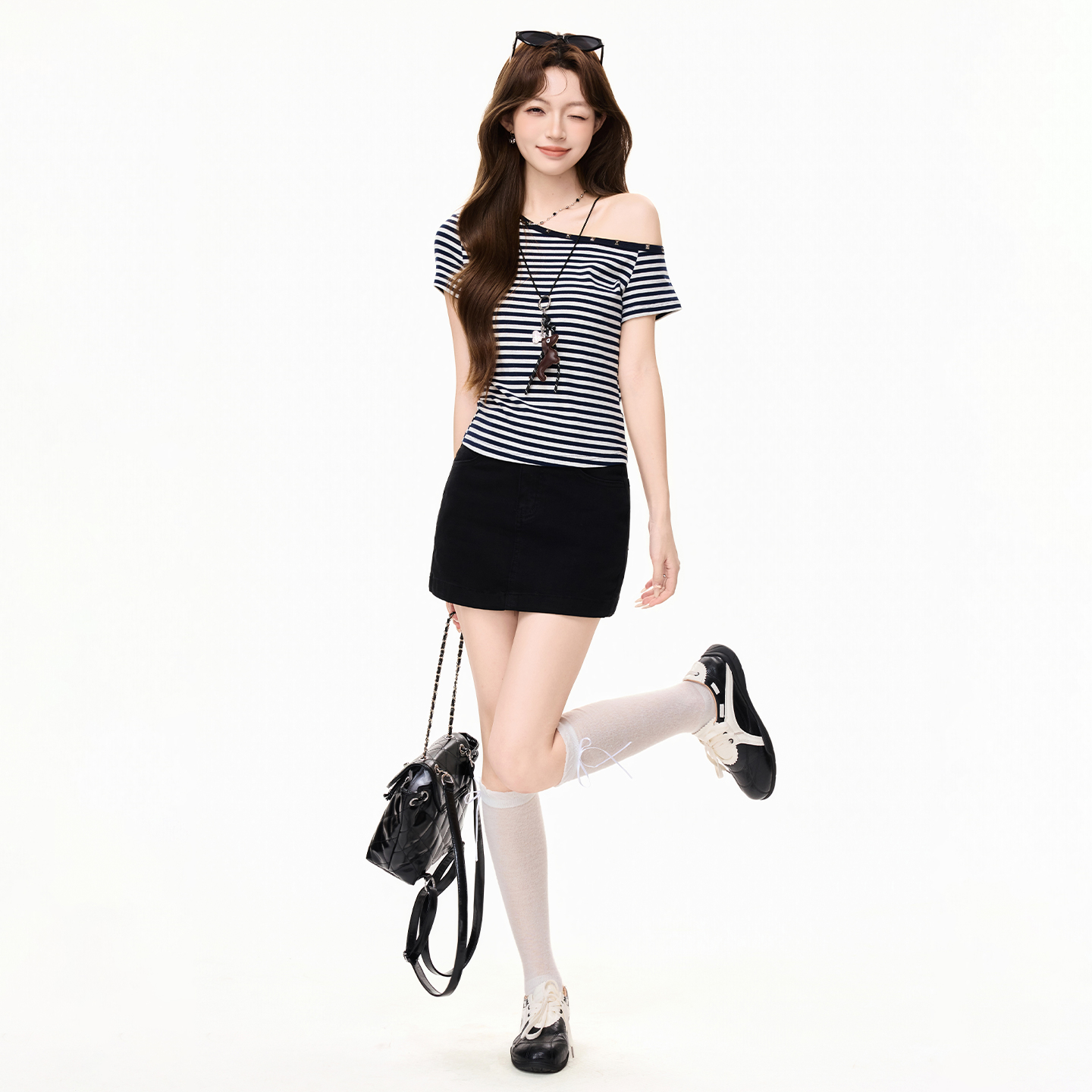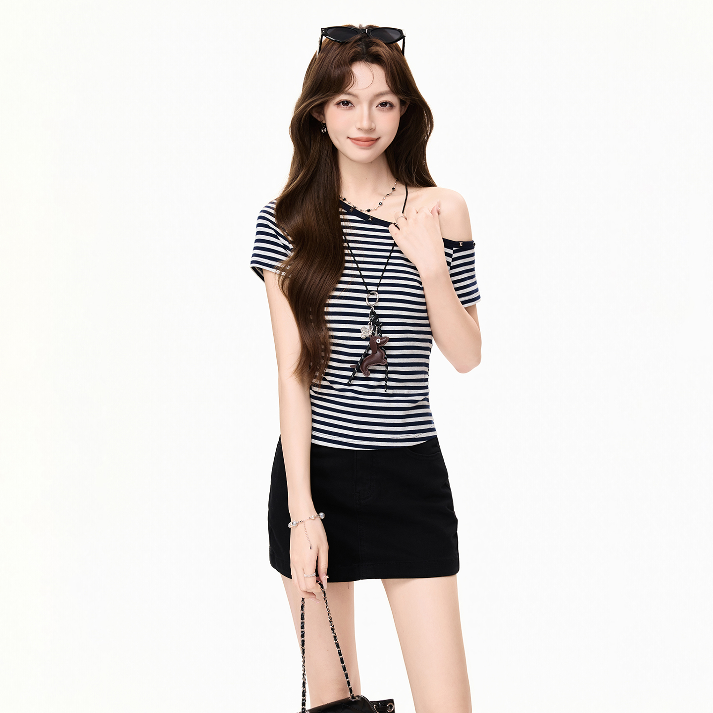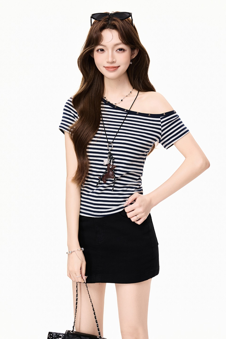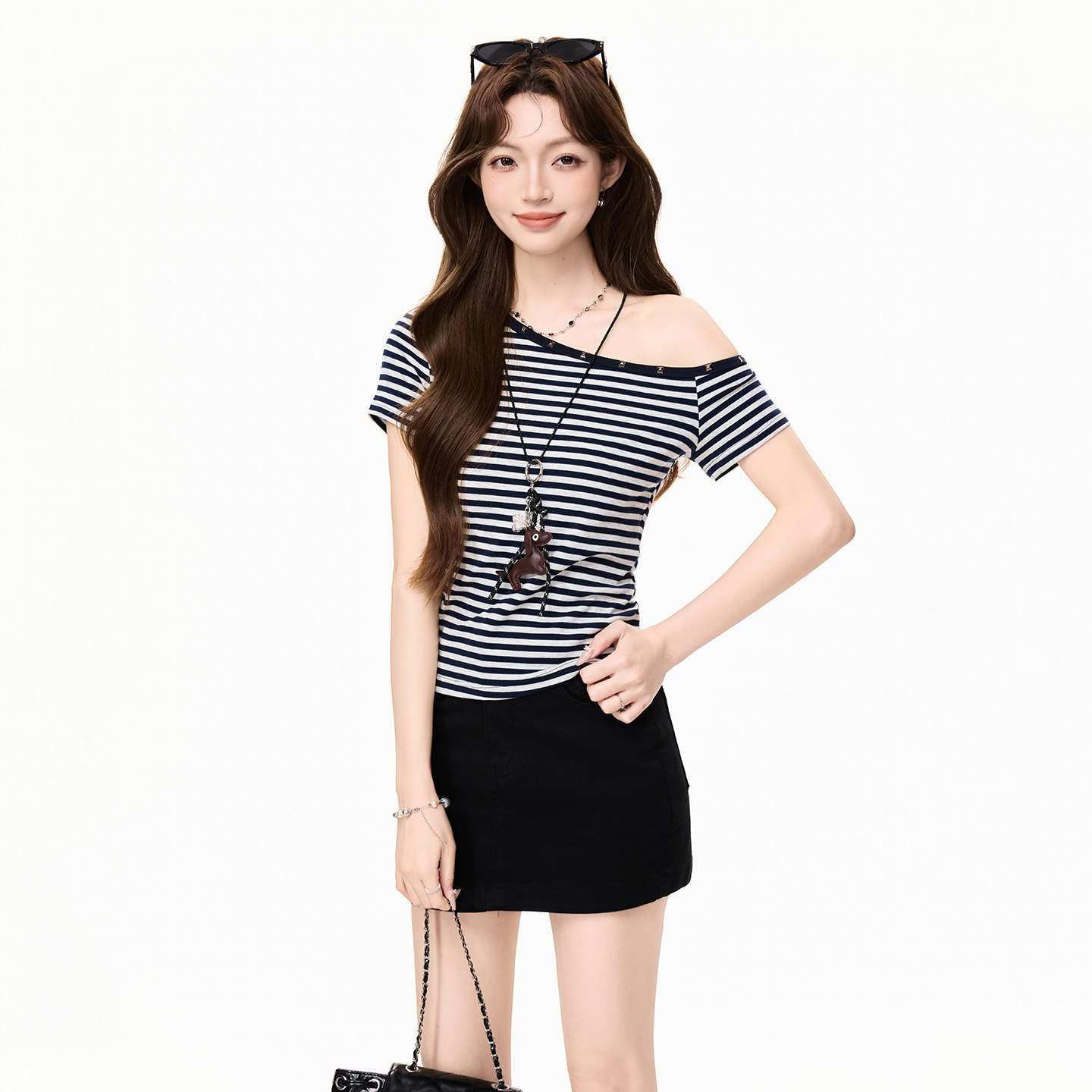 RY3591# 实拍实价韩系藏蓝条纹斜领露肩短袖T恤女夏季修身斜角肩铆钉上衣