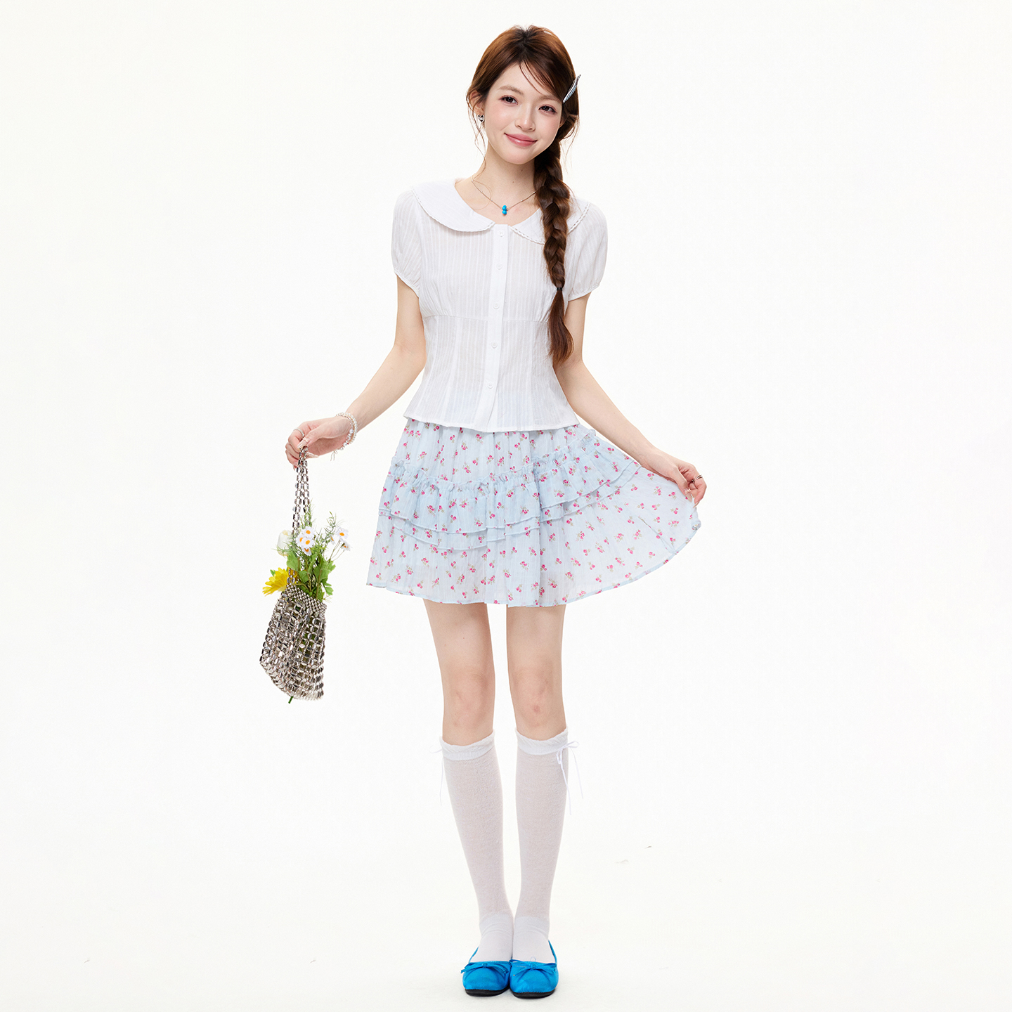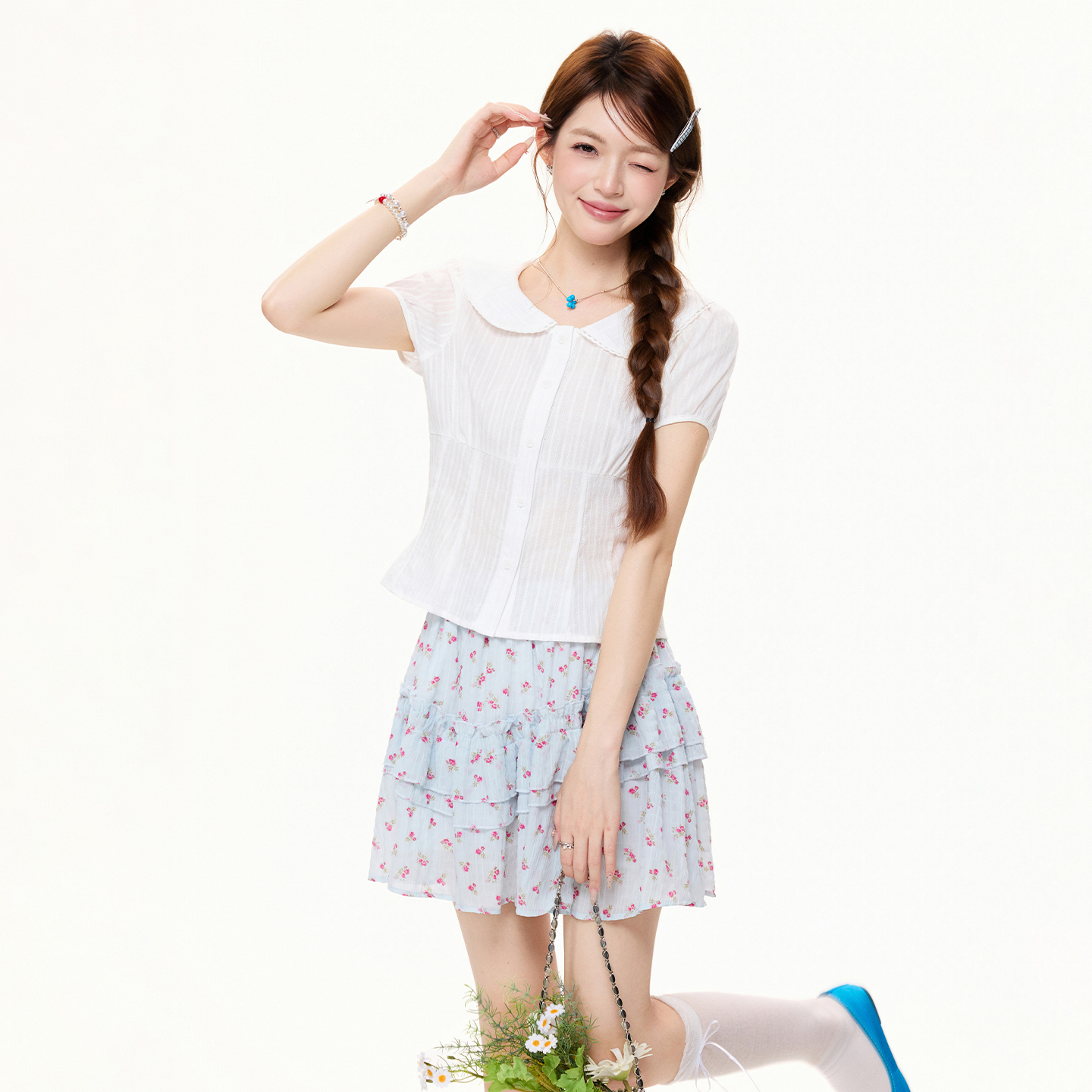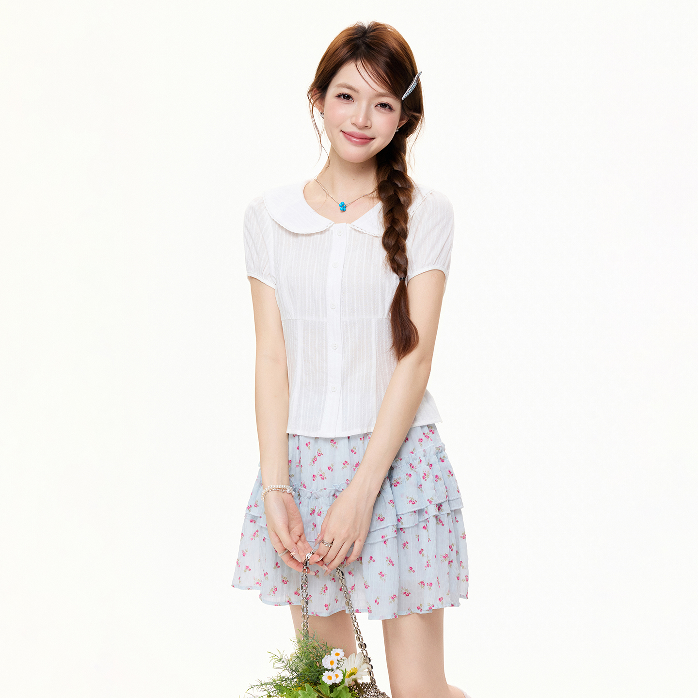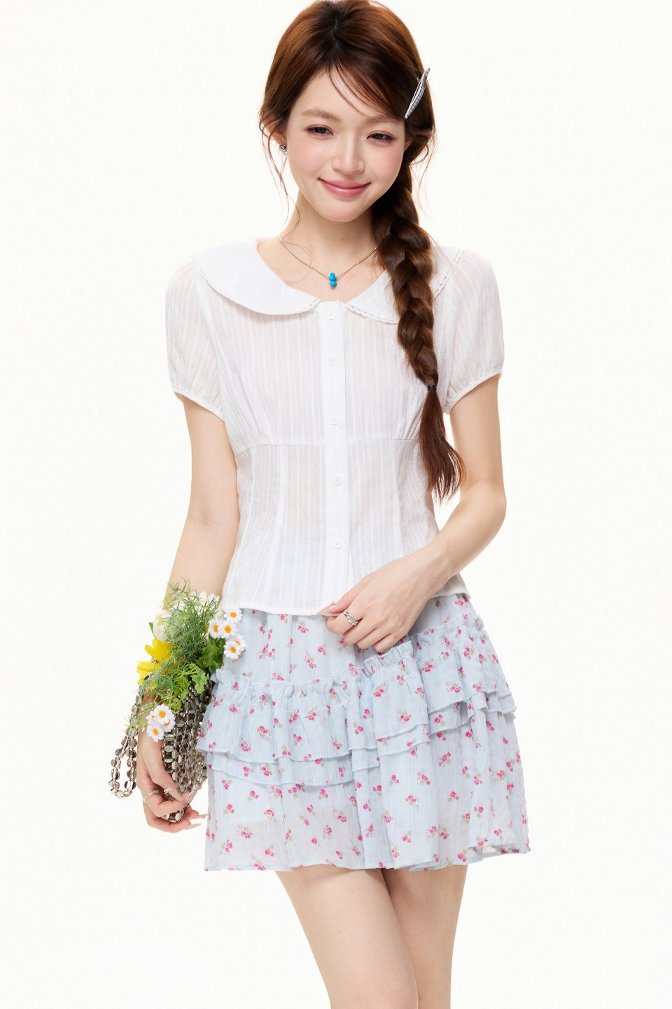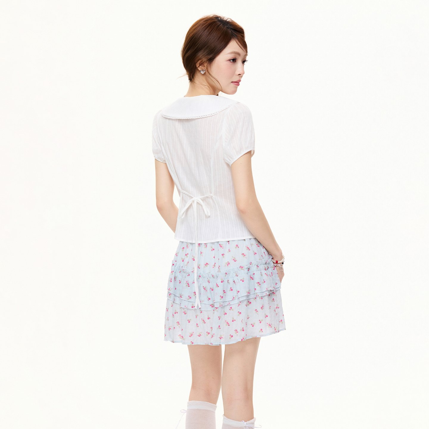 RY3592# 实拍实价学院风白色娃娃领短袖衬衫女夏季设计感收腰显瘦短款上衣