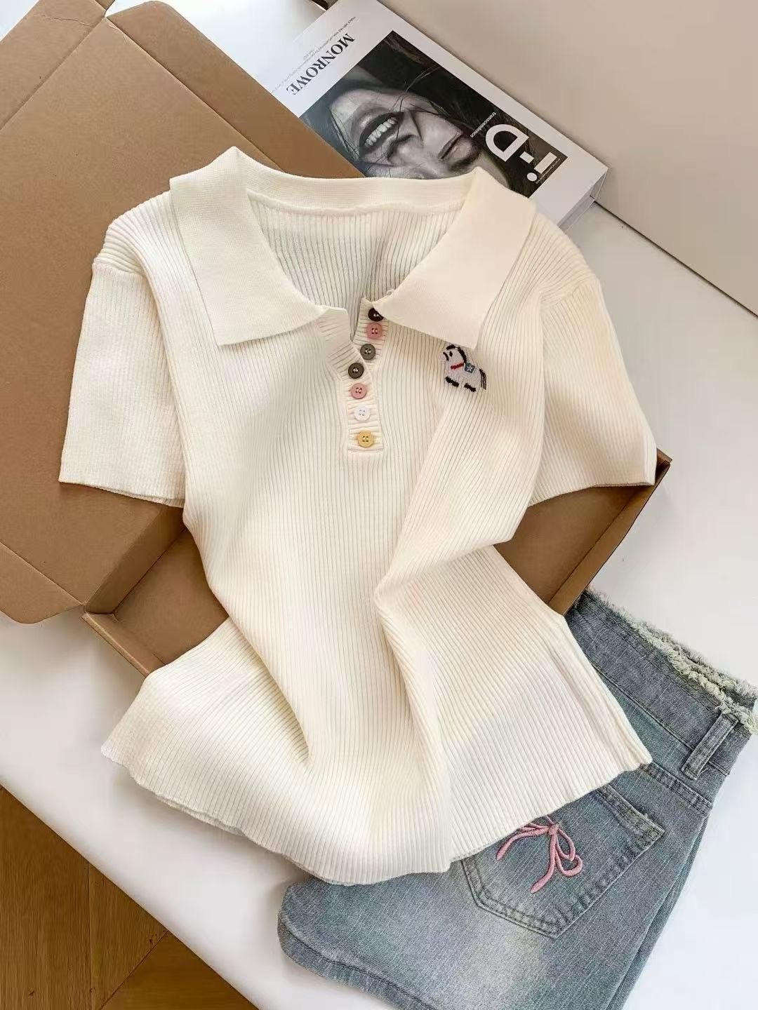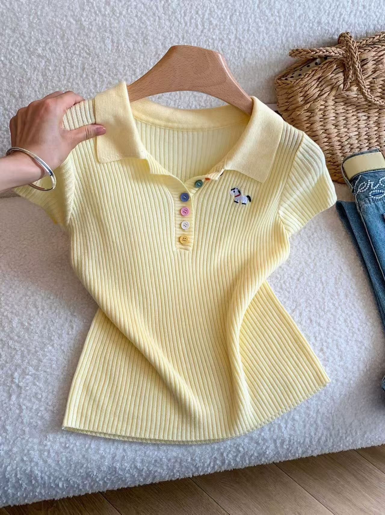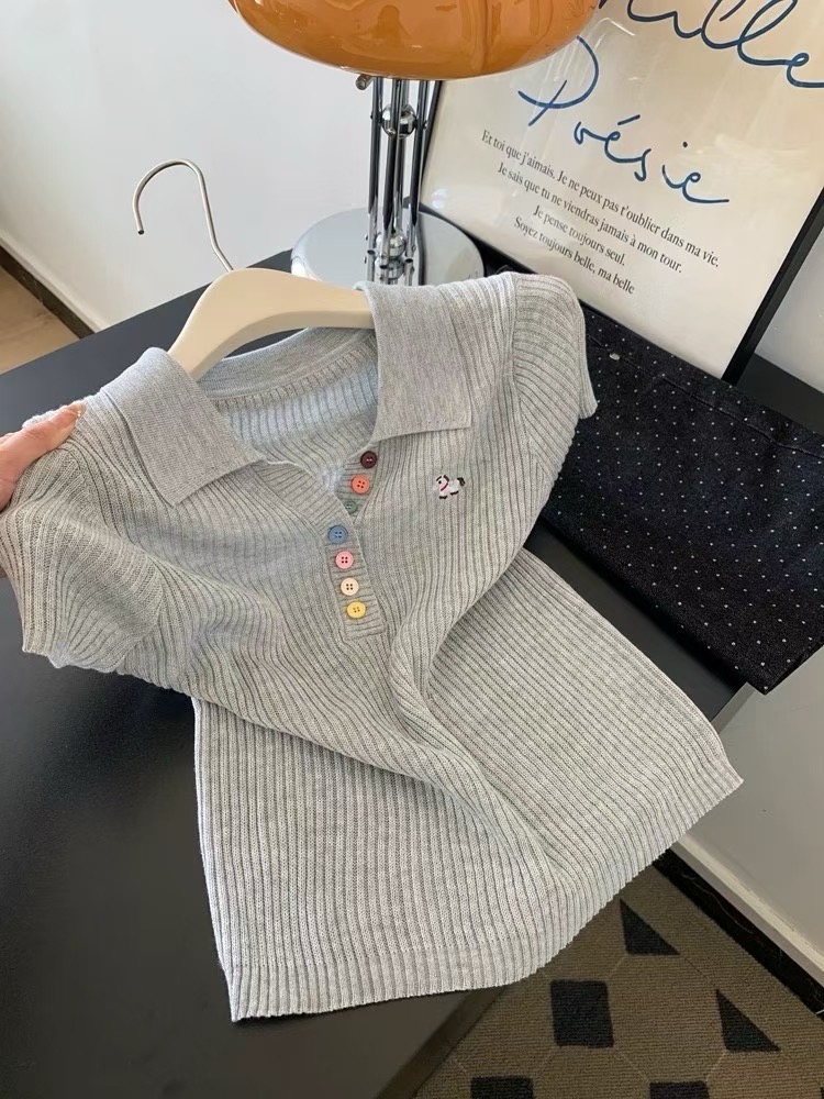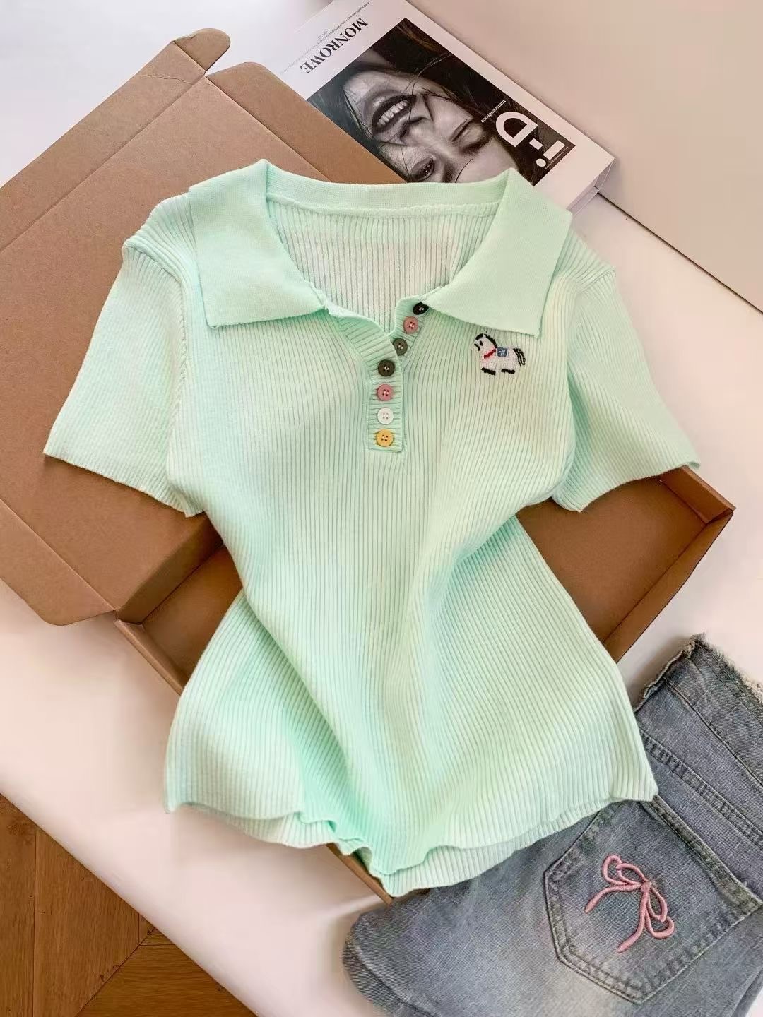 RY3595# 绿色polo领刺绣小马彩扣针织短袖t恤女宽松短款正肩小上衣2026夏