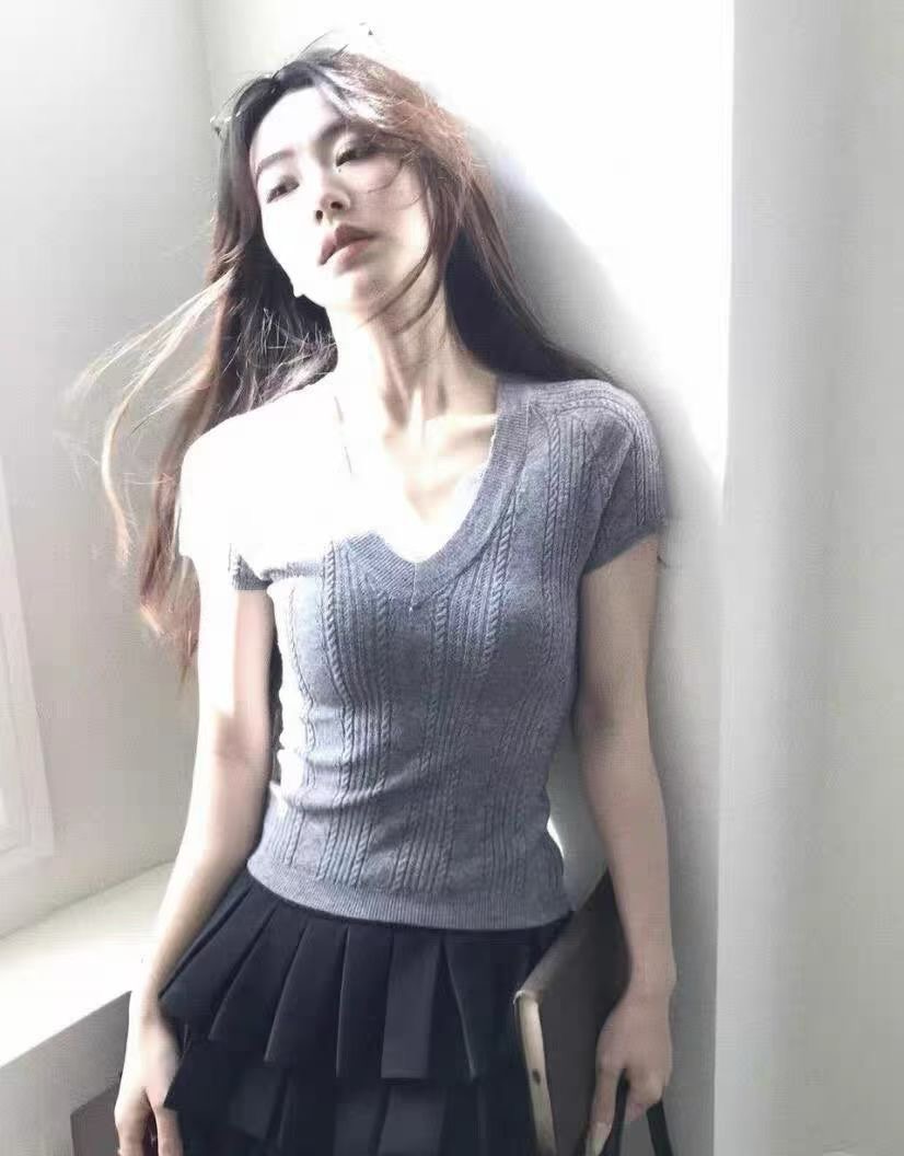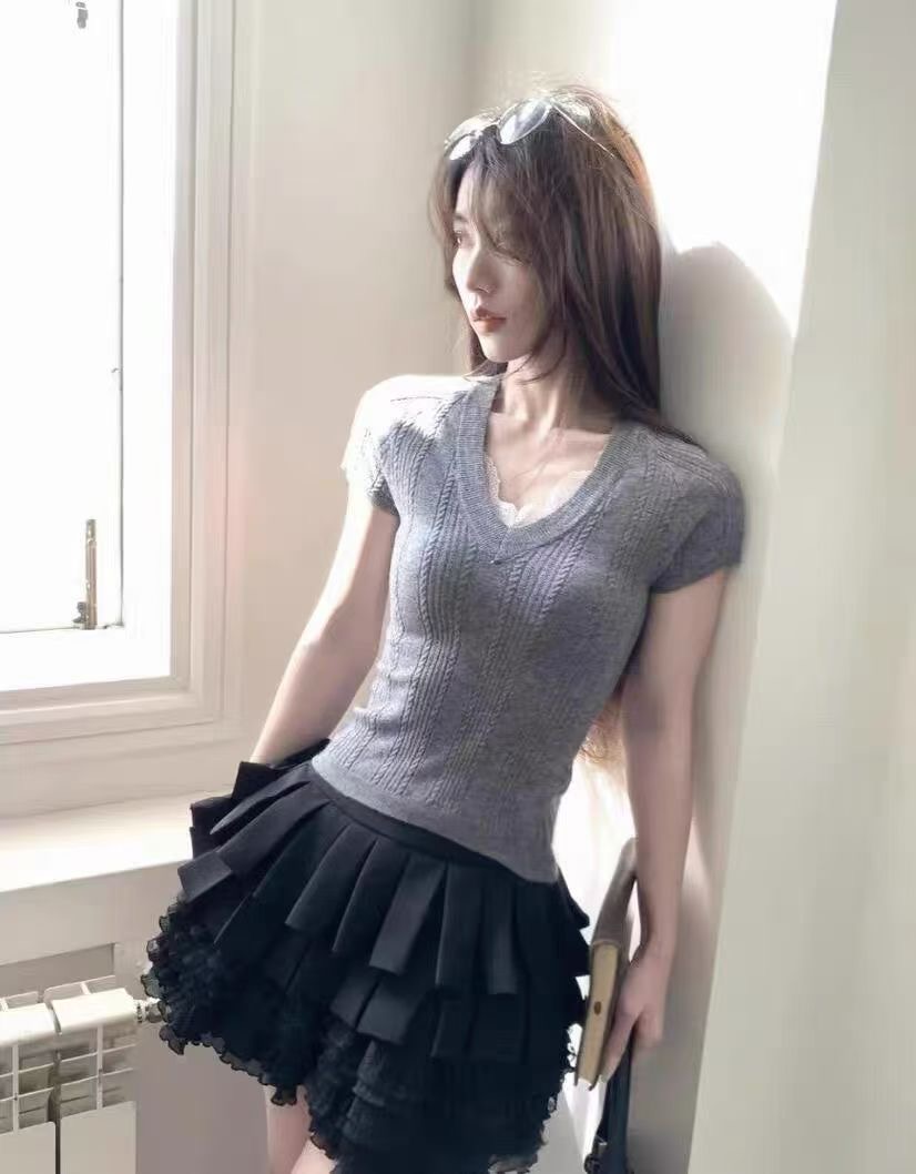 RY3596# 韩系灰色蕾丝V领针织短袖女夏季2026新款修身显瘦设计感气质上衣
