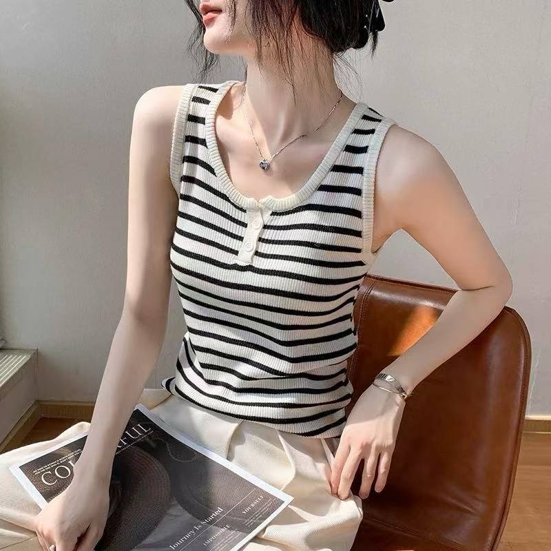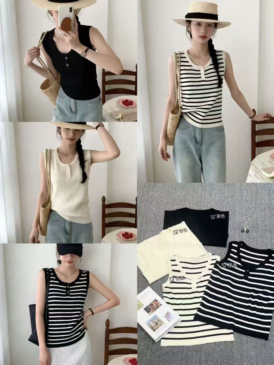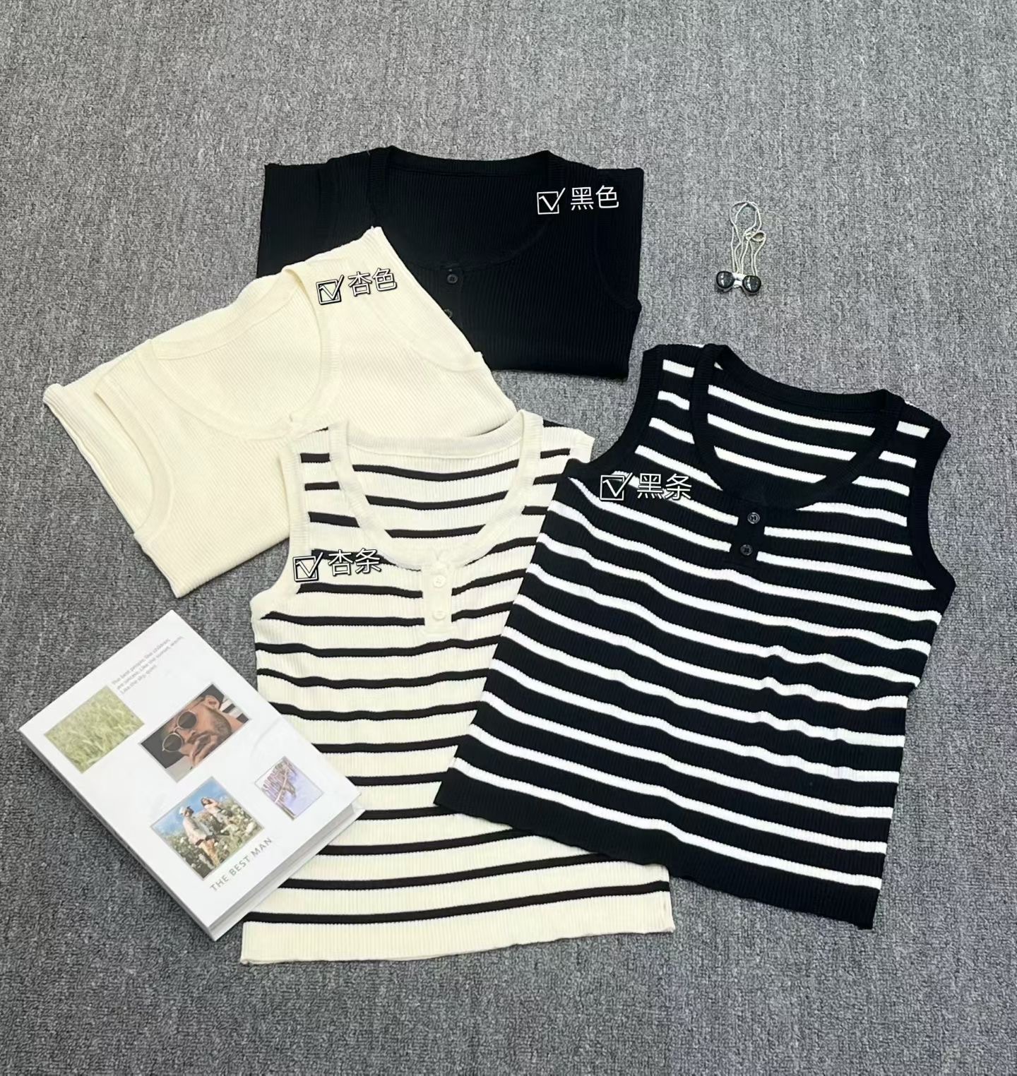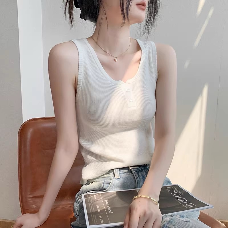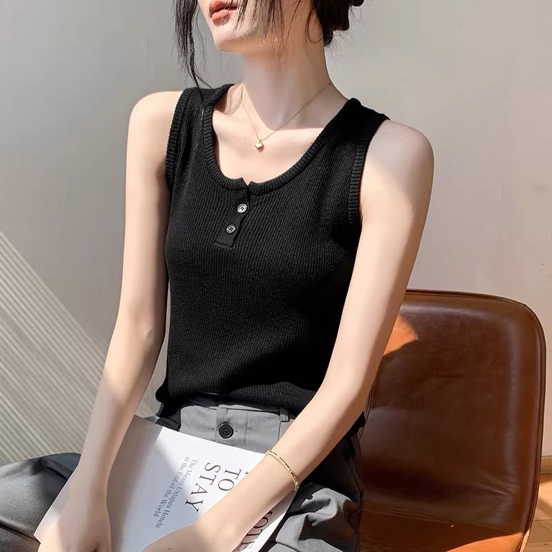 RY3597# 纽扣圆领无袖针织背心女2026春夏新款别致修身纯色衬衫内搭上衣女