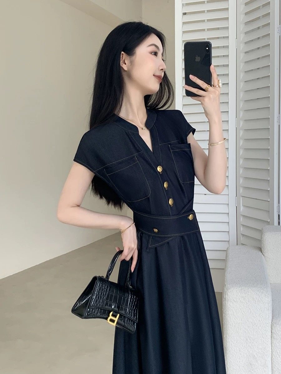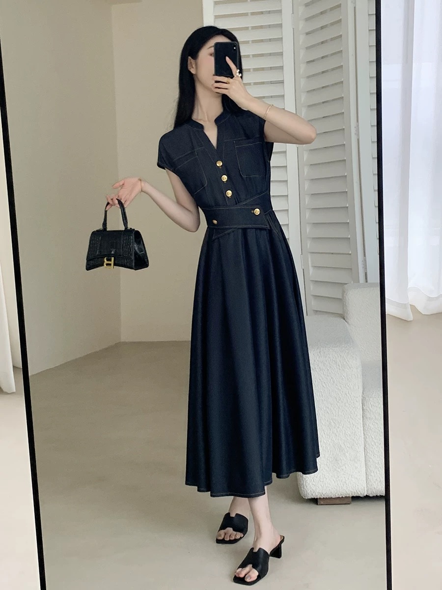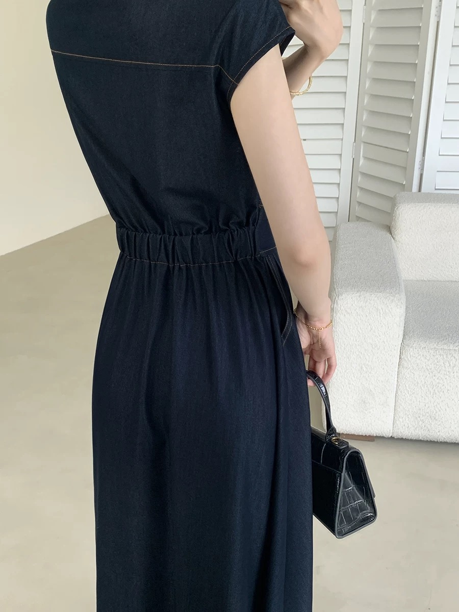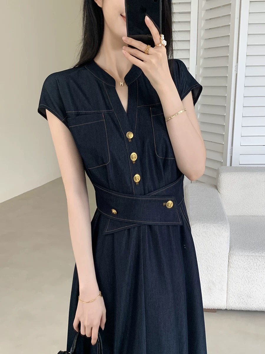 RY3627# FT GUOGE果哥家仿牛仔连衣裙女2026夏新款收腰显瘦气质通勤长裙子