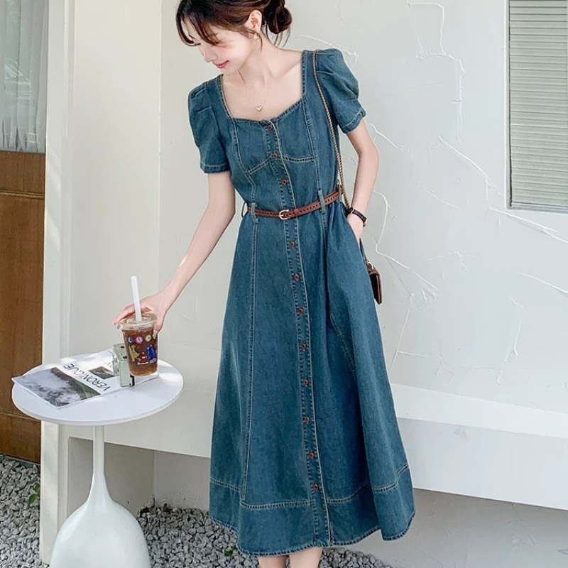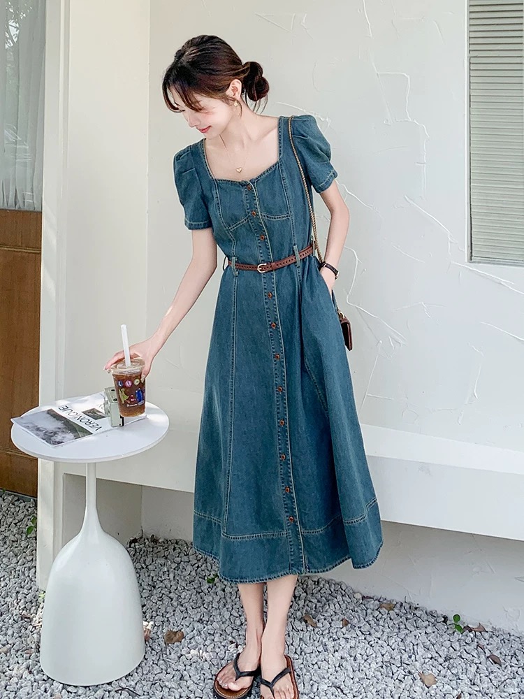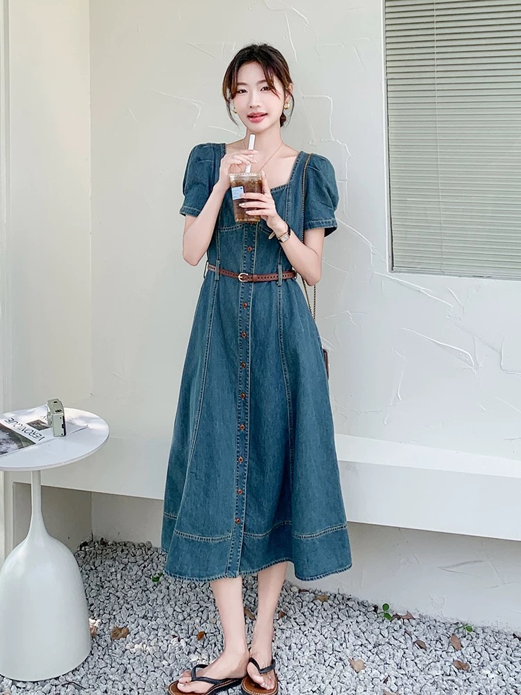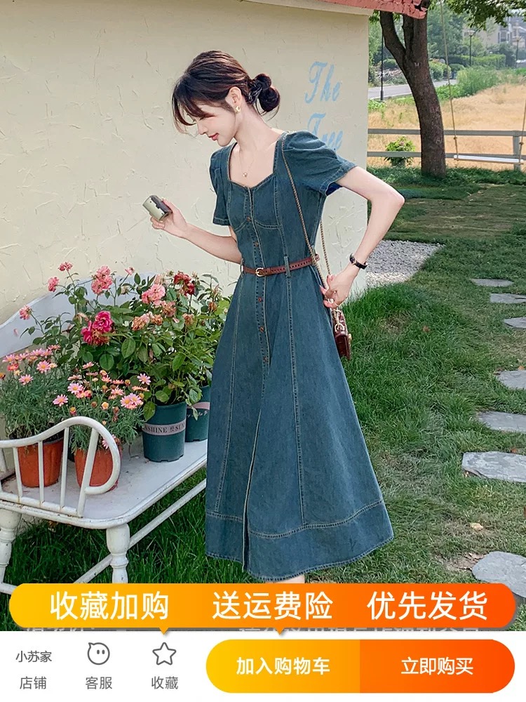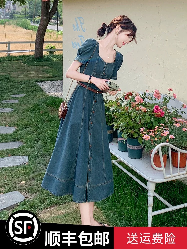 RY3629# 港风复古牛仔连衣裙女夏季2026新款薄款气质方领别致收腰显瘦长裙