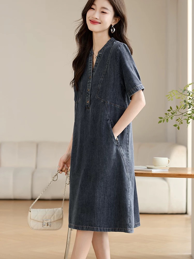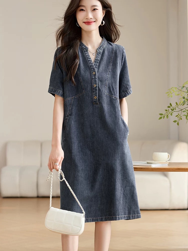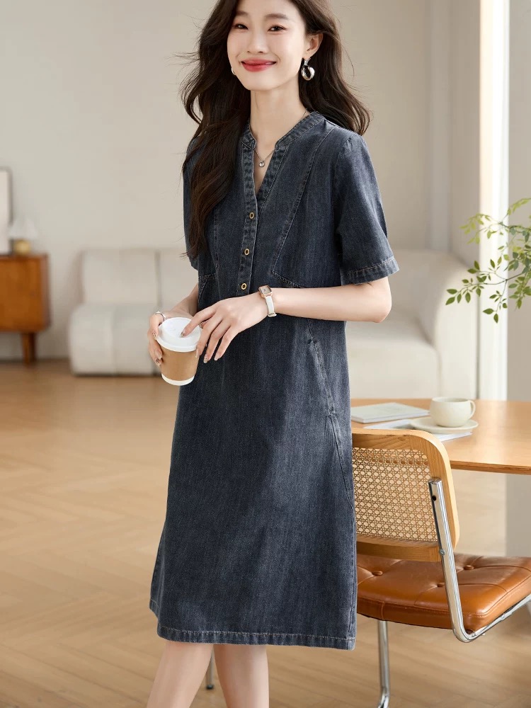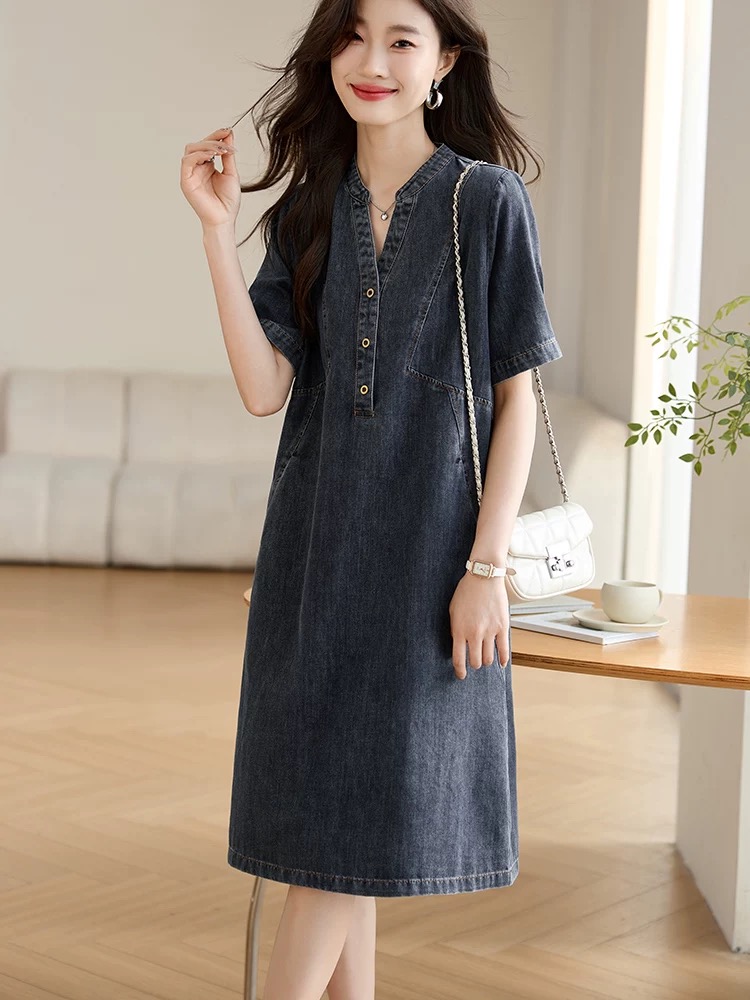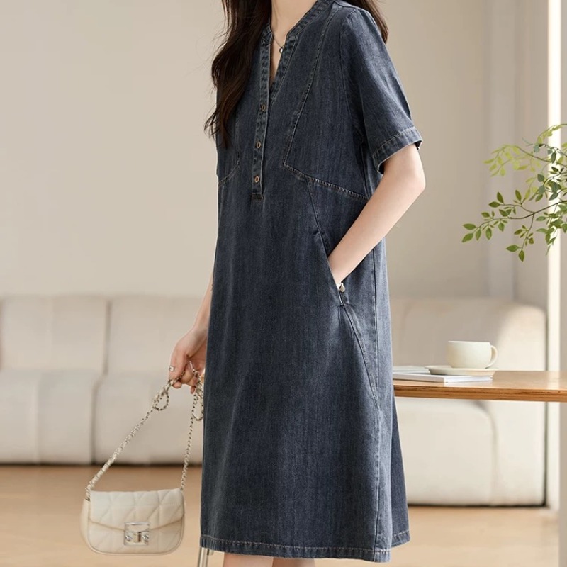 RY3631# 牛仔连衣裙女夏季薄款2026新款爆款宽松遮肚休闲复古气质妈妈裙子