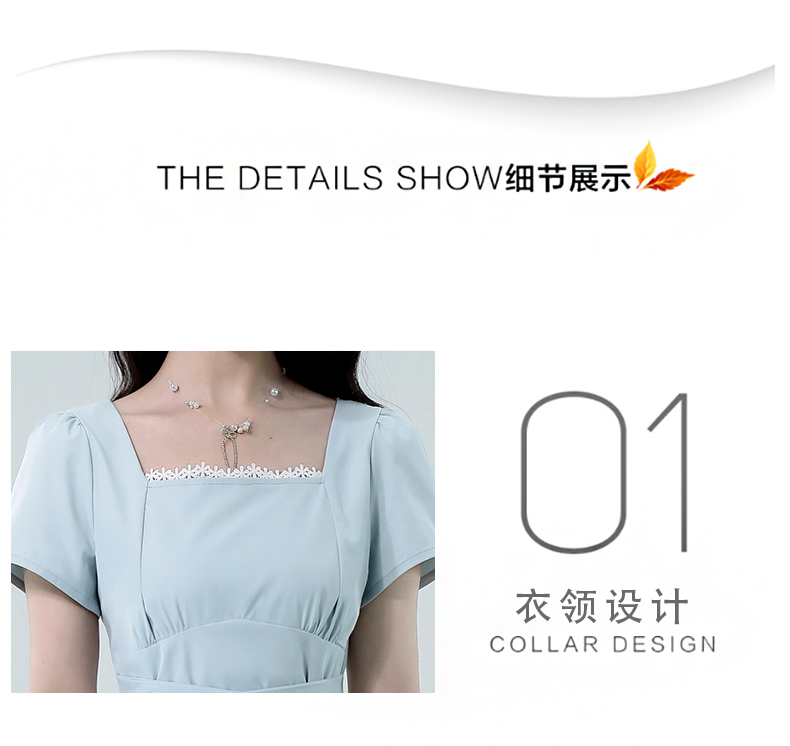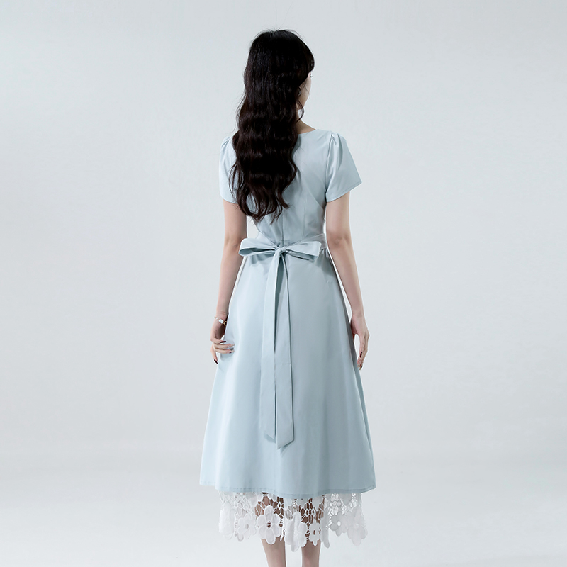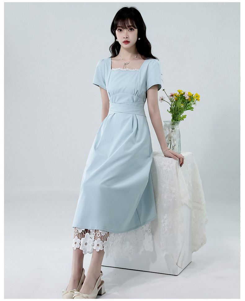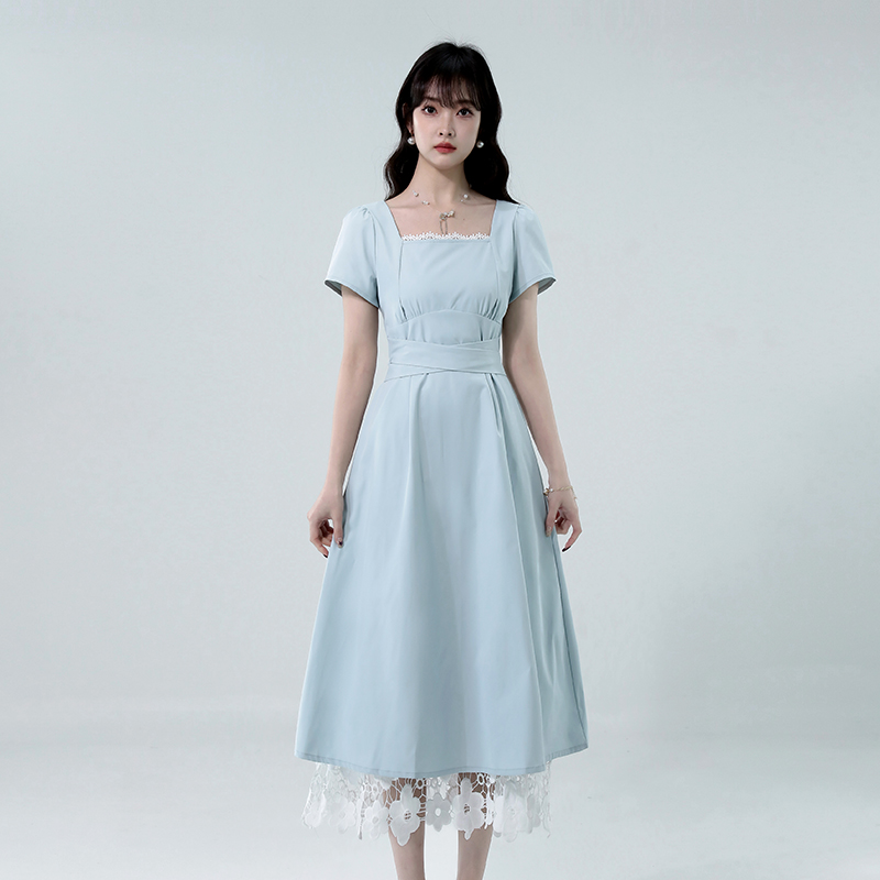 RY3639# 夏日海盐法式气质女夏季收腰拼接蕾丝连衣裙子