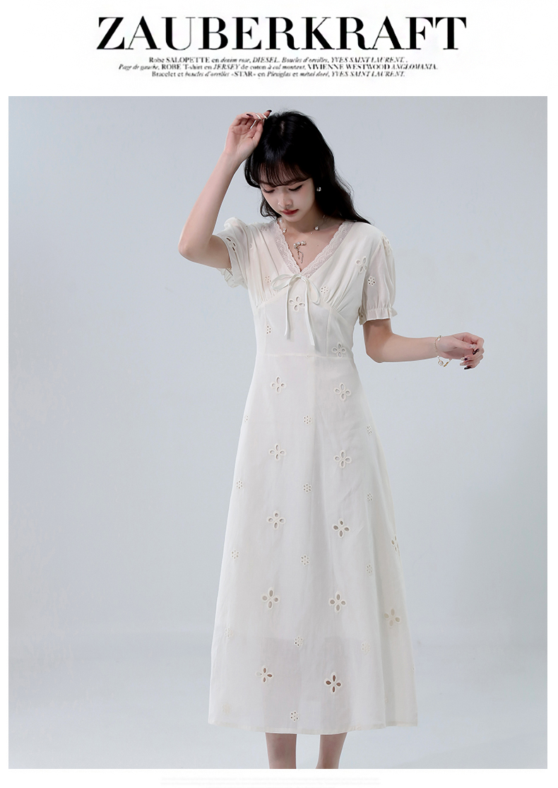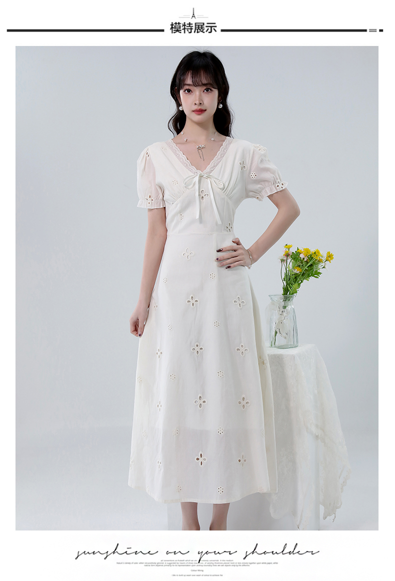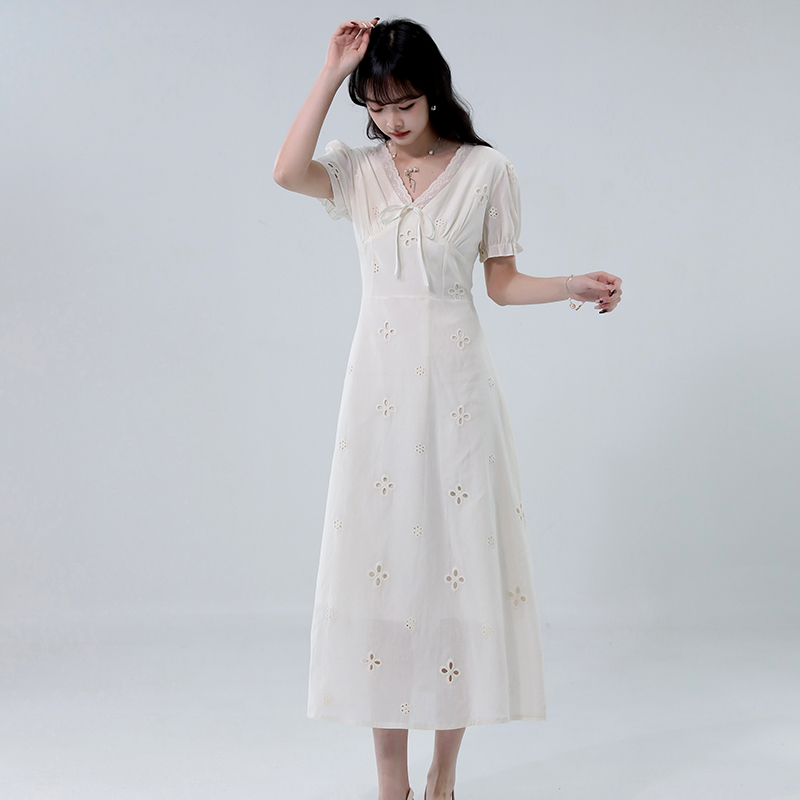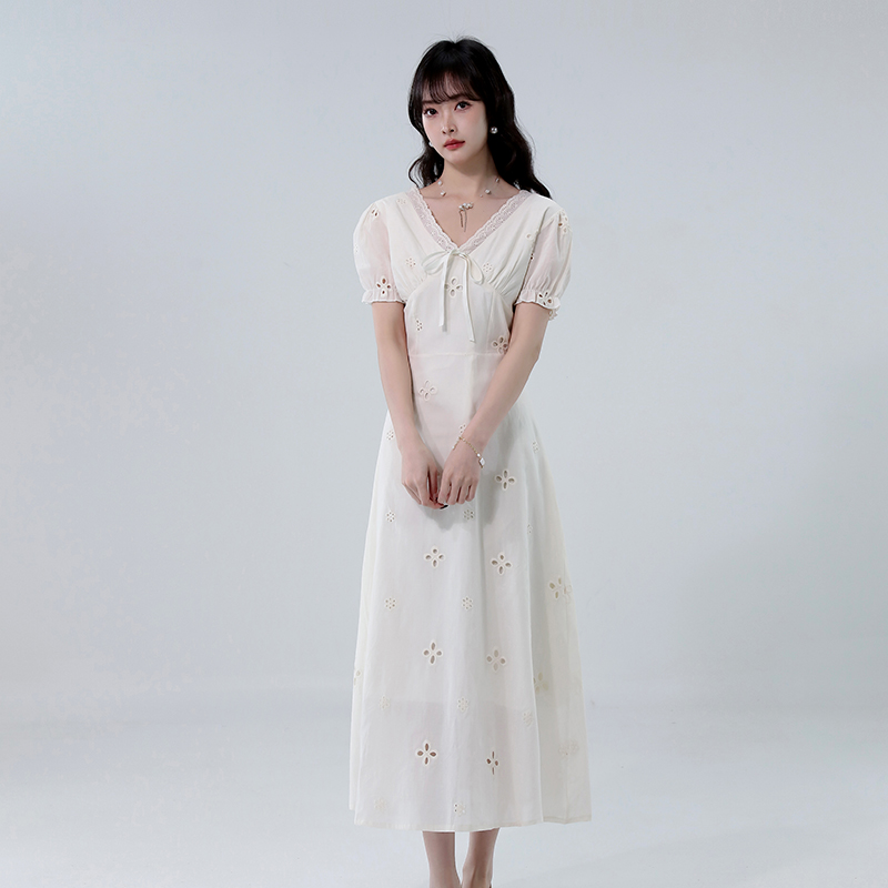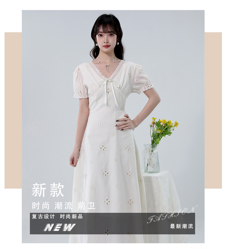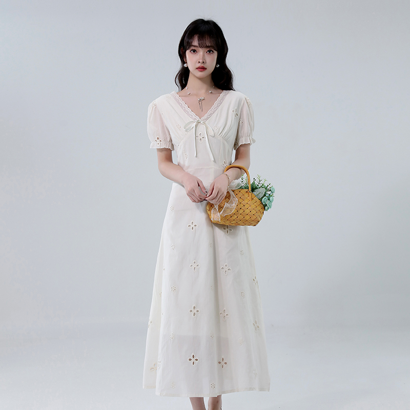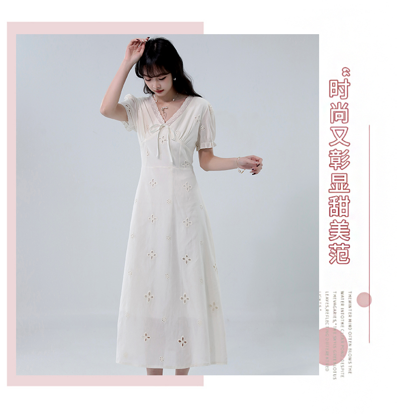 RY3642# 2026夏季新款法式桔梗温柔风v领刺绣甜美连衣裙女气质设计感长裙