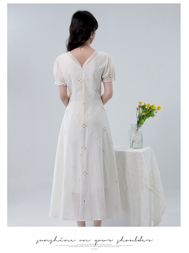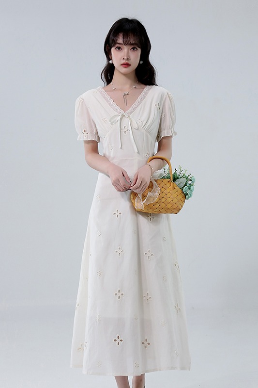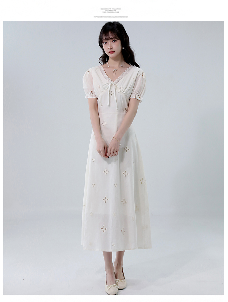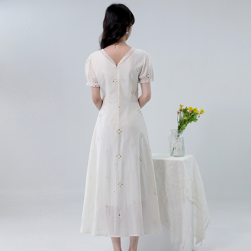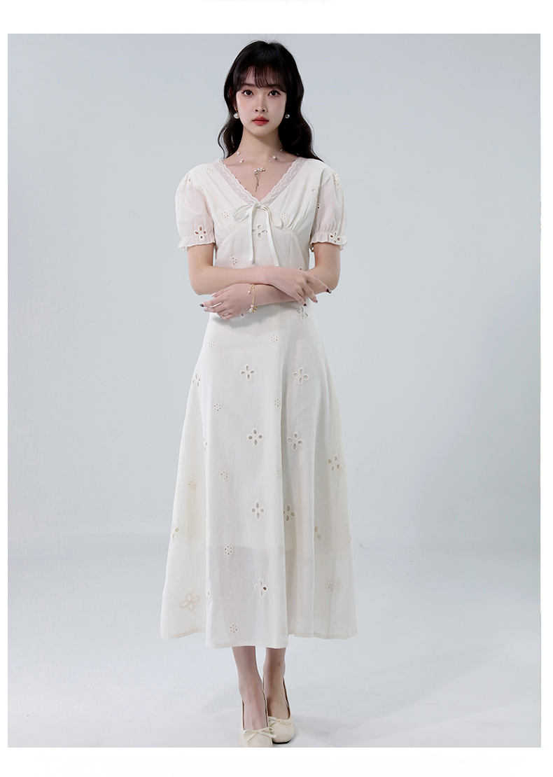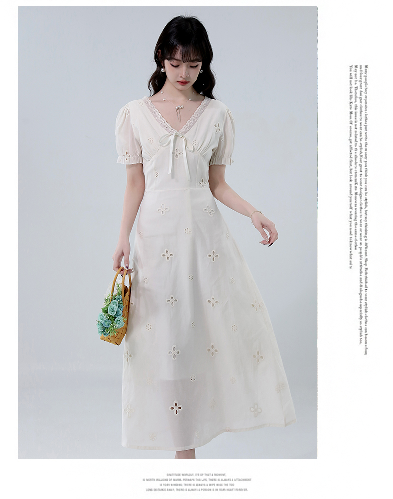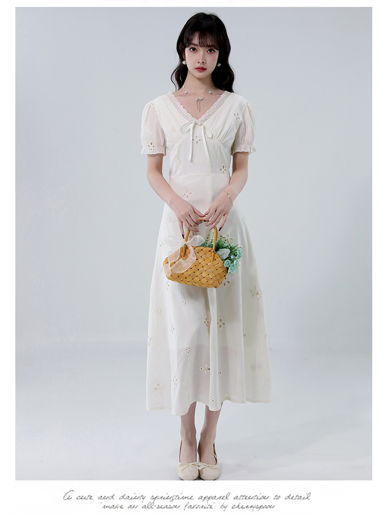 RY3642# 2026夏季新款法式桔梗温柔风v领刺绣甜美连衣裙女气质设计感长裙