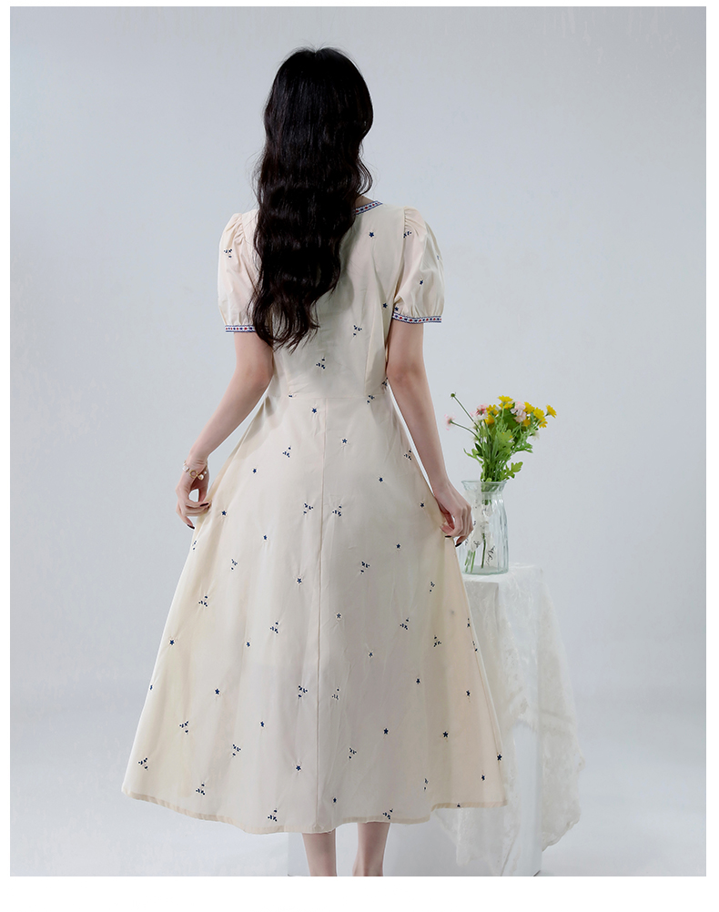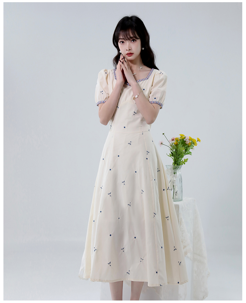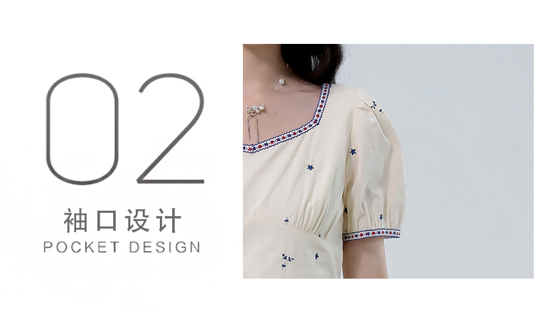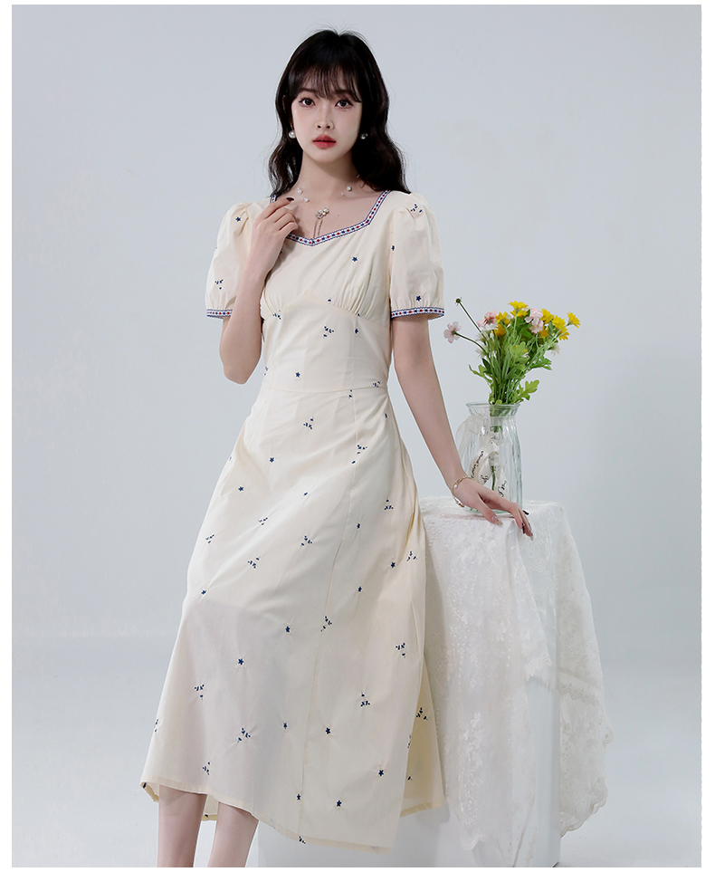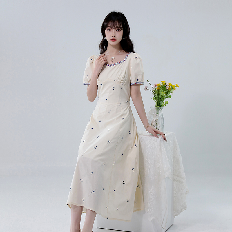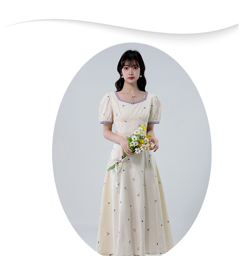 RY3643# 方领刺绣连衣裙女2026夏季新款收腰显瘦气质长裙