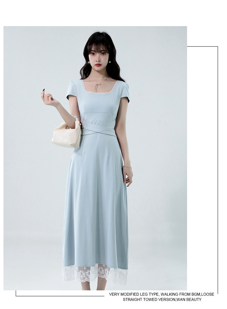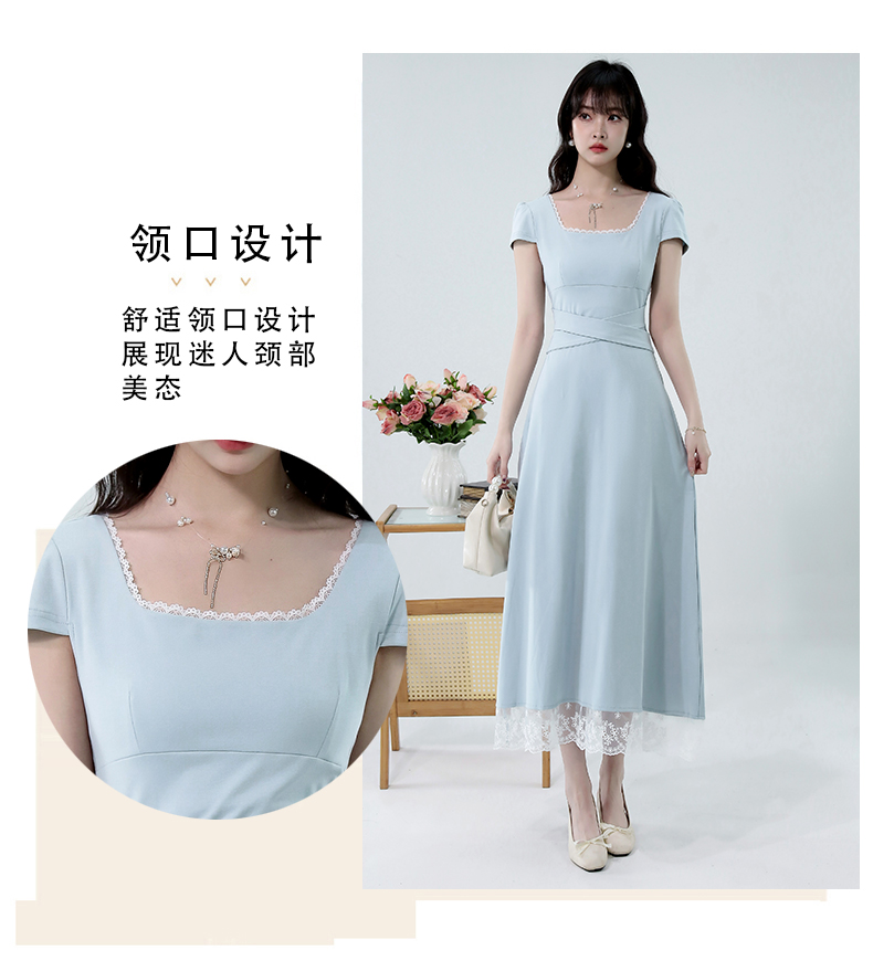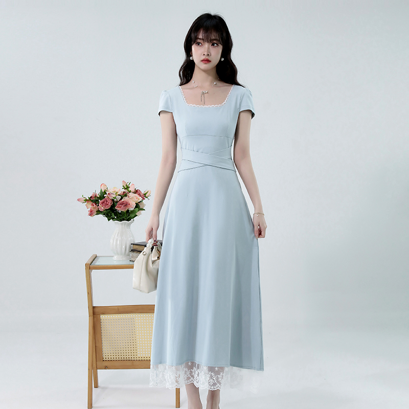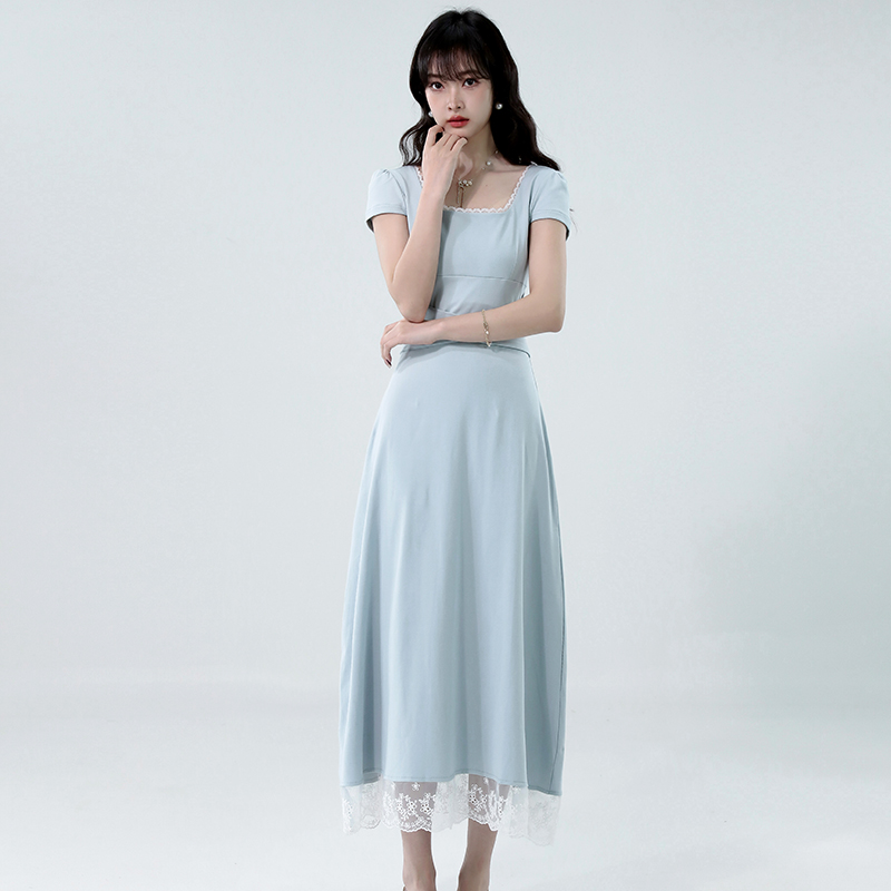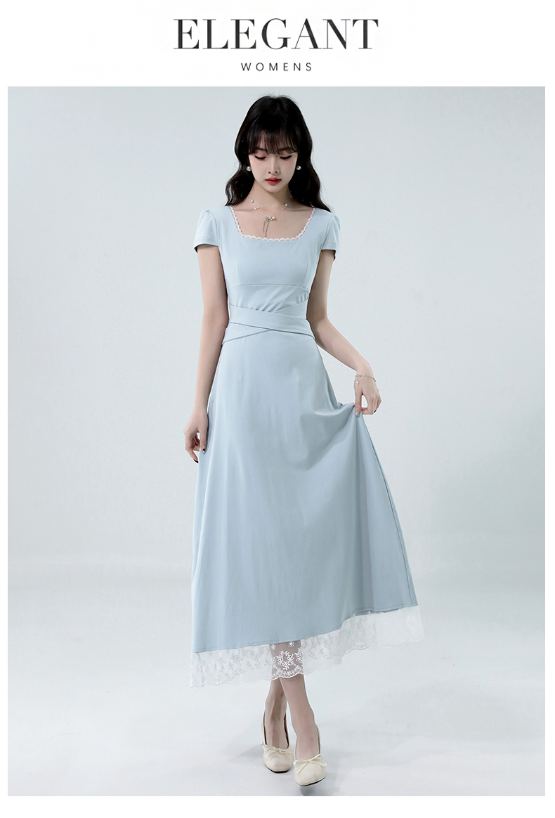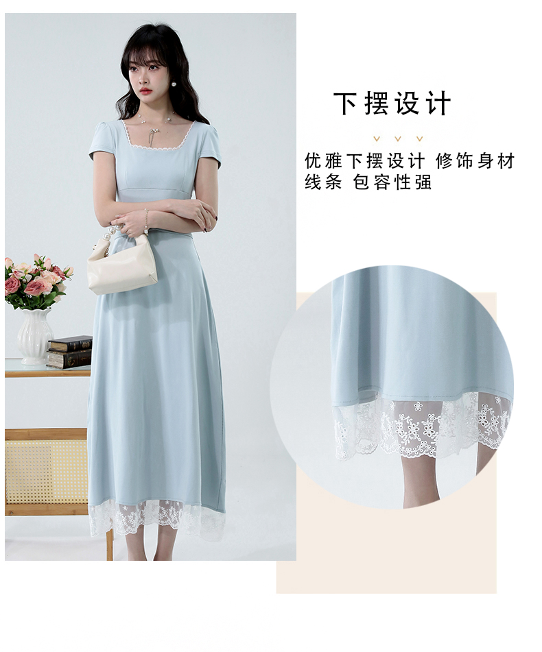 RY3644# 2026夏季新款法式方领蓝色气质连衣裙女蕾丝拼接设计感甜美长裙子