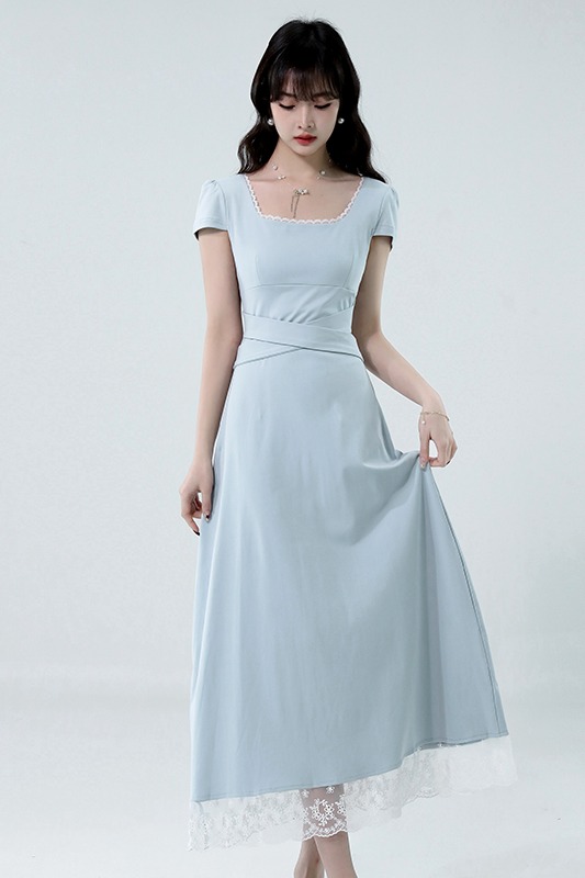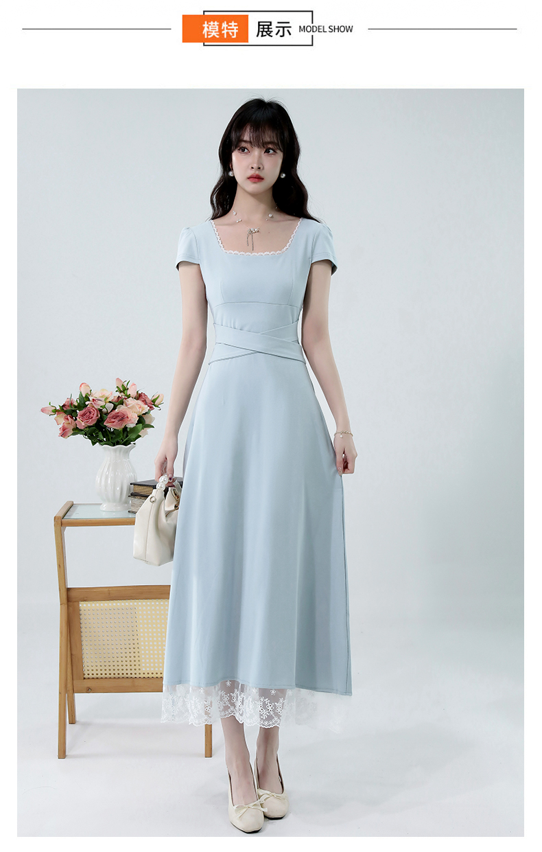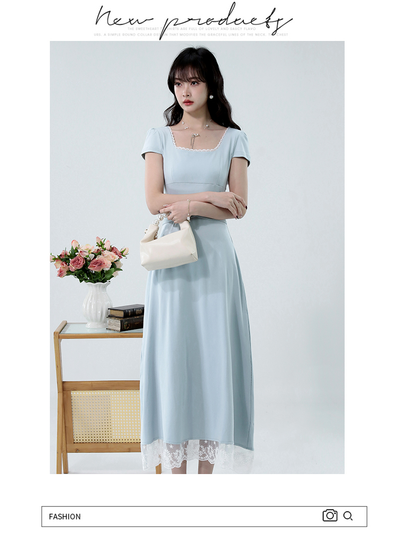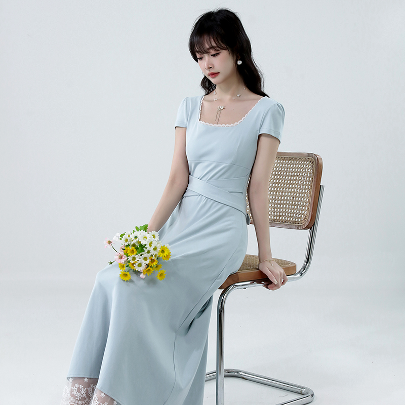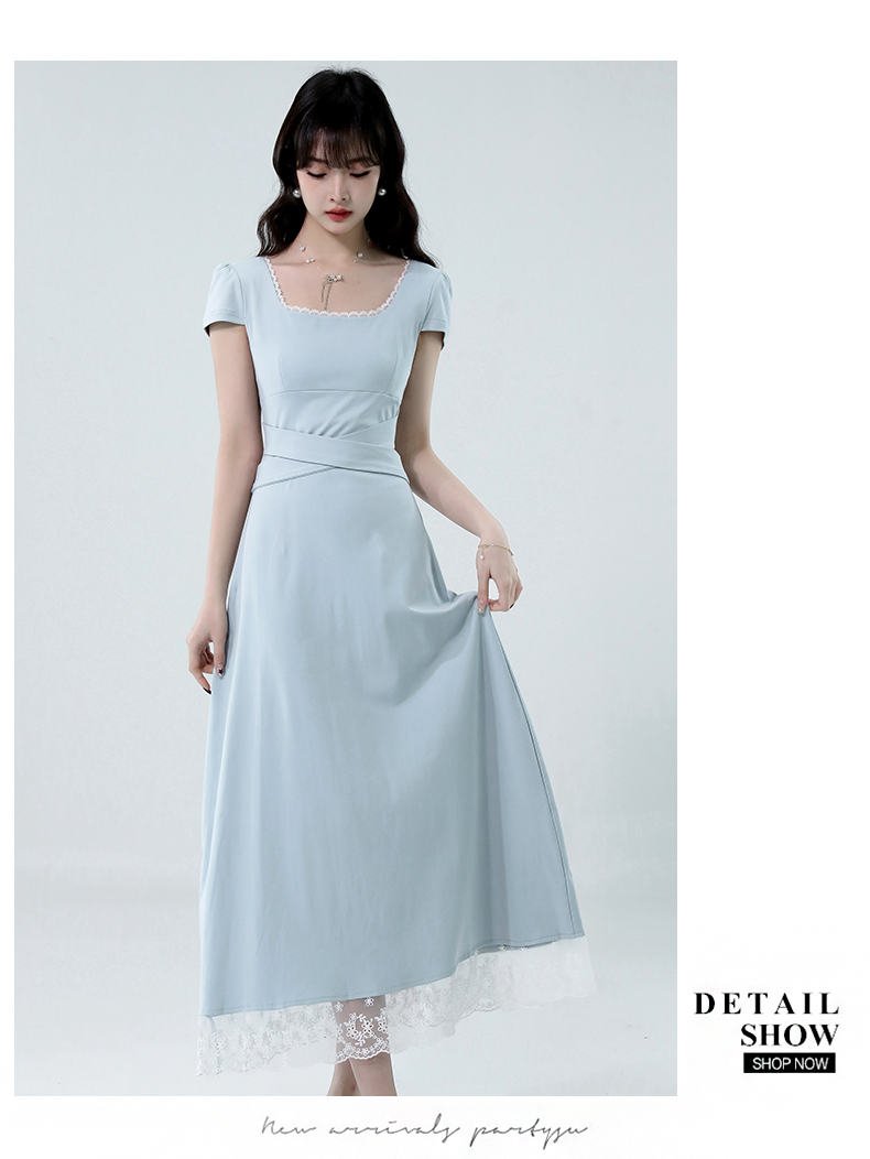 RY3644# 2026夏季新款法式方领蓝色气质连衣裙女蕾丝拼接设计感甜美长裙子