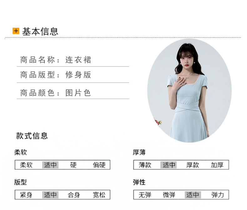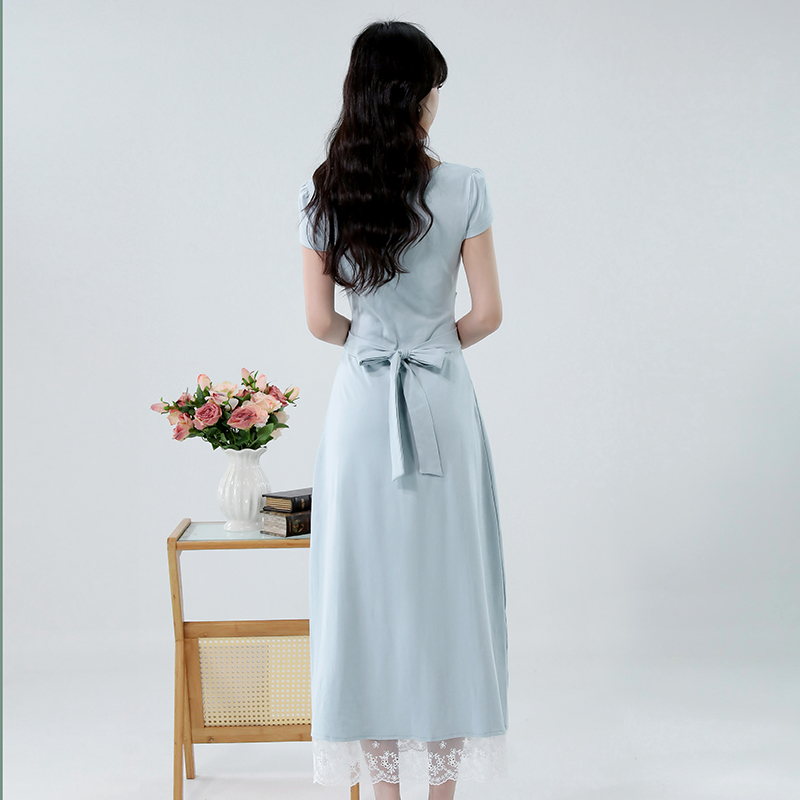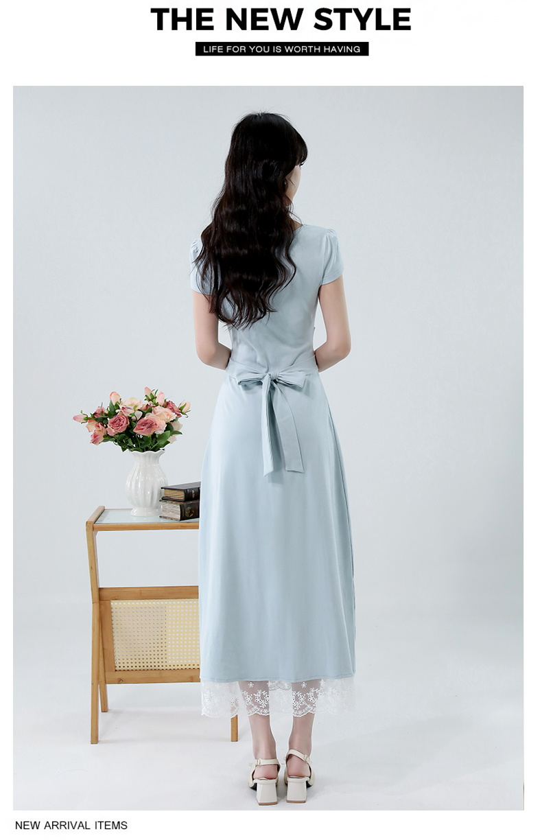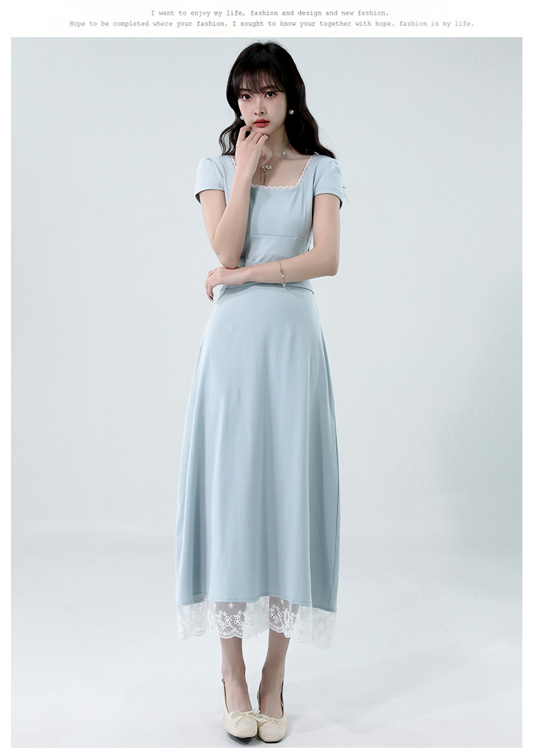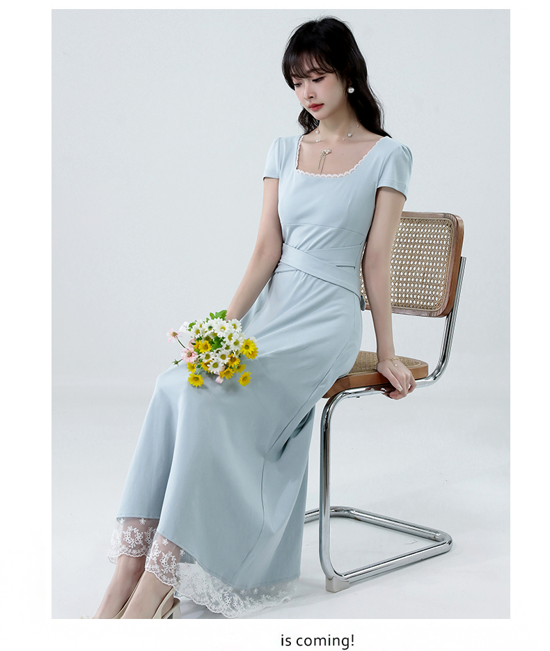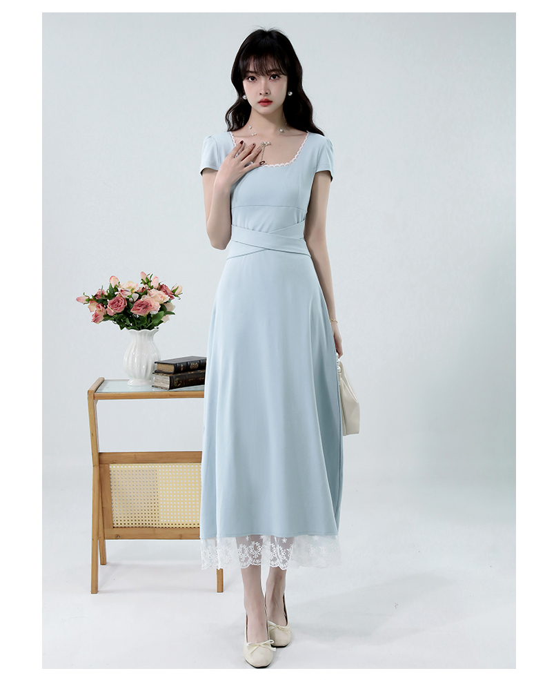 RY3644# 2026夏季新款法式方领蓝色气质连衣裙女蕾丝拼接设计感甜美长裙子