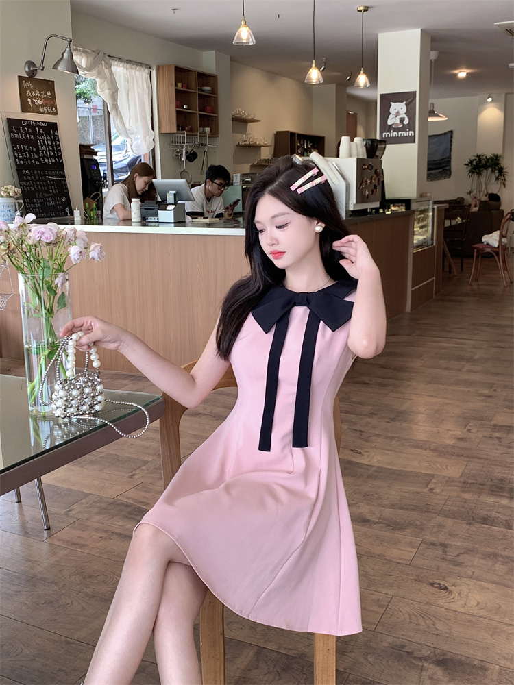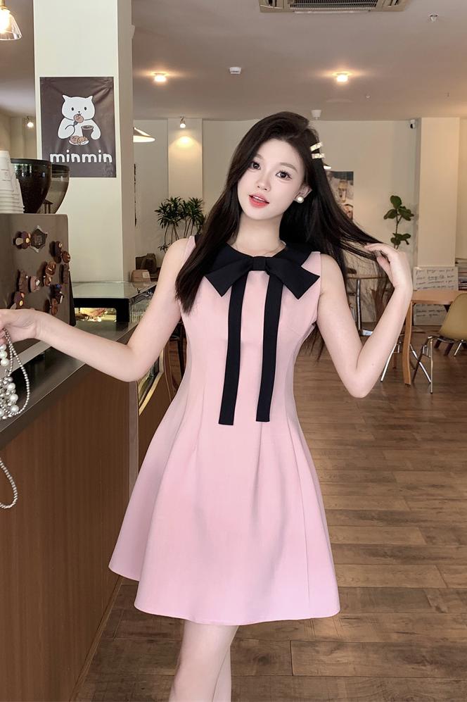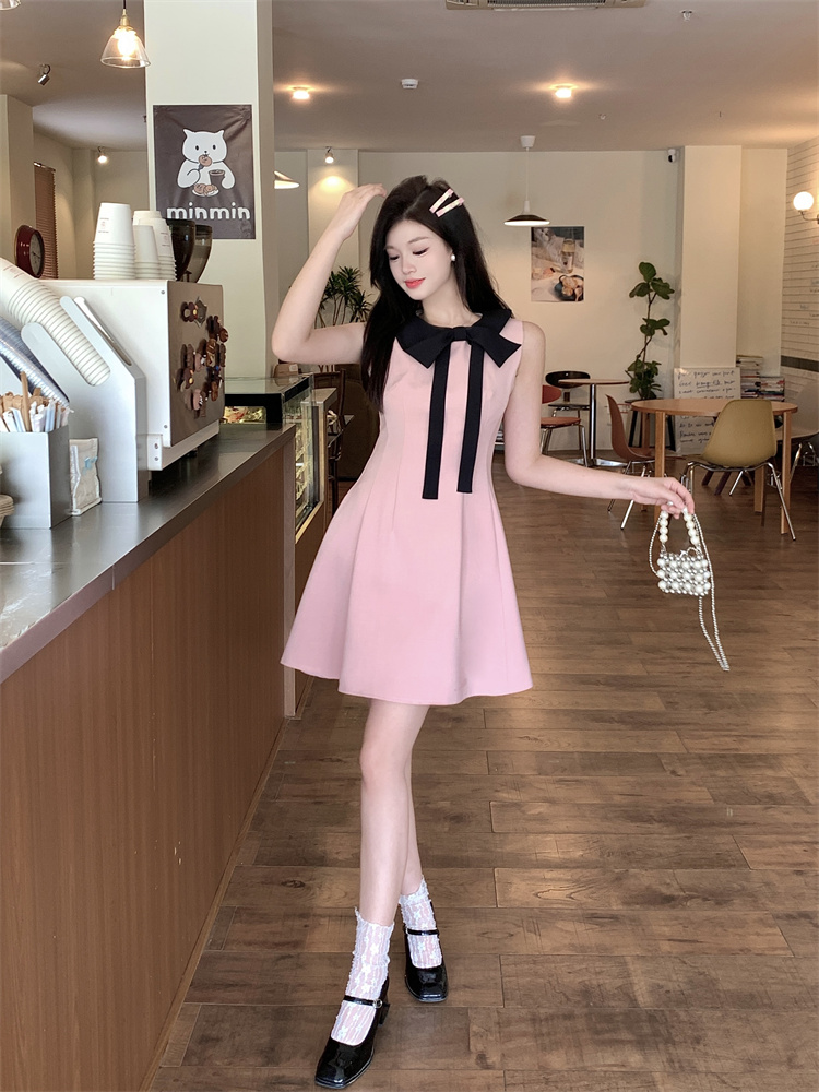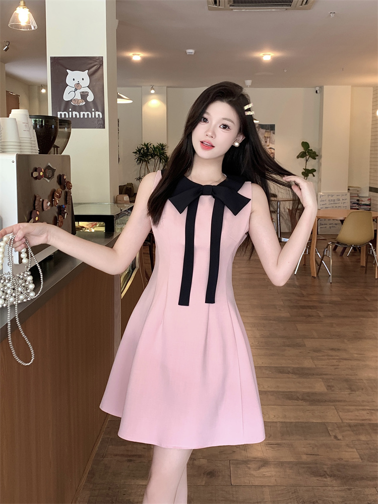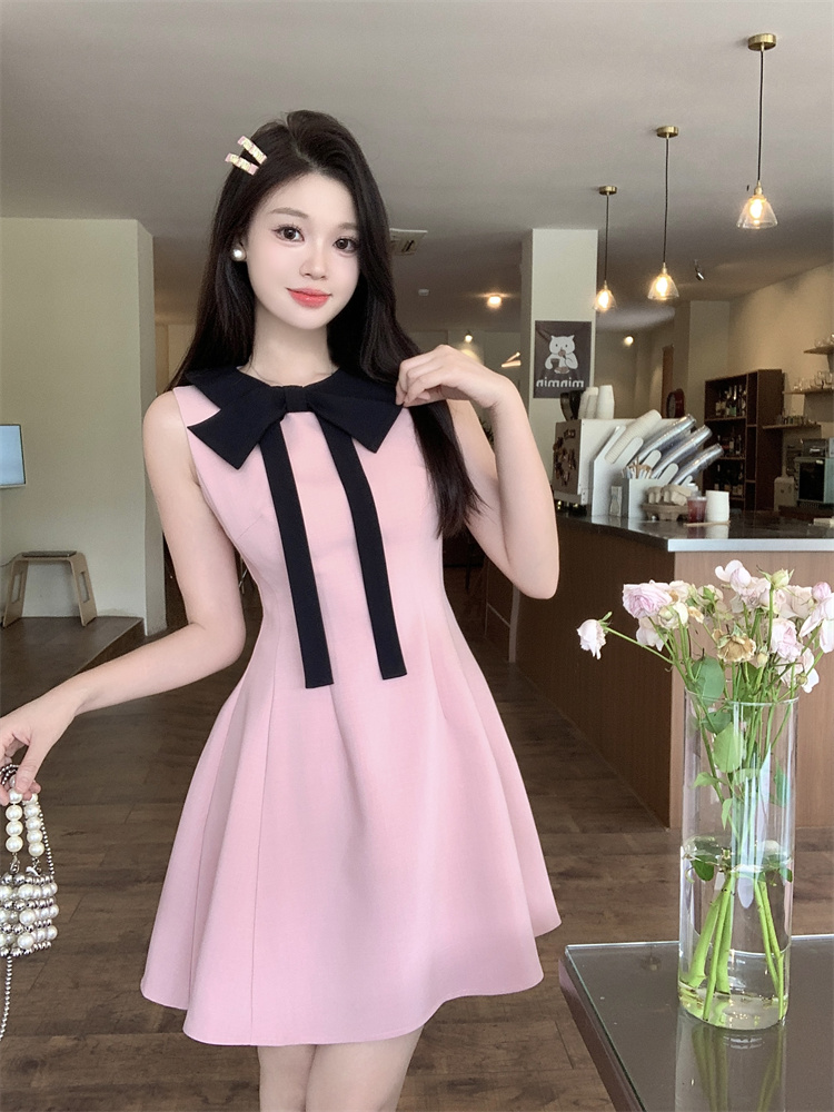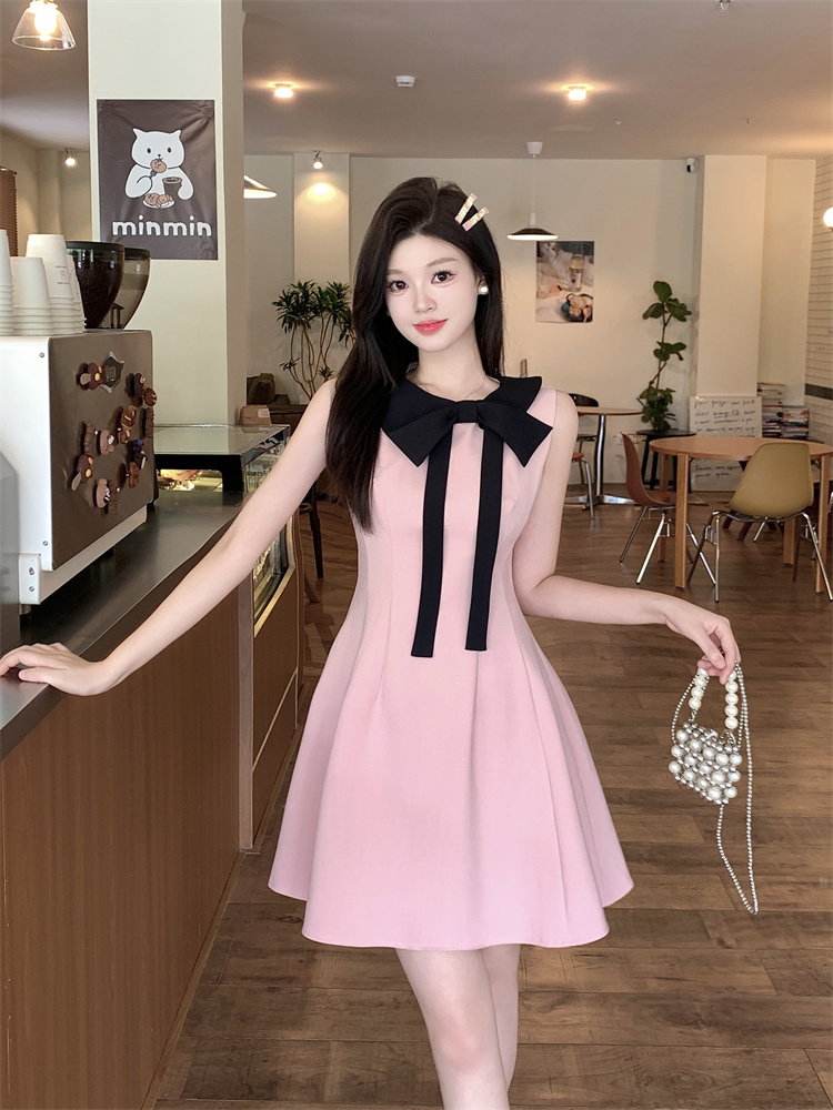 RY3648# 小香风粉色蝴蝶结挂脖连衣裙女夏季法式收腰千金风荷叶边a字裙子