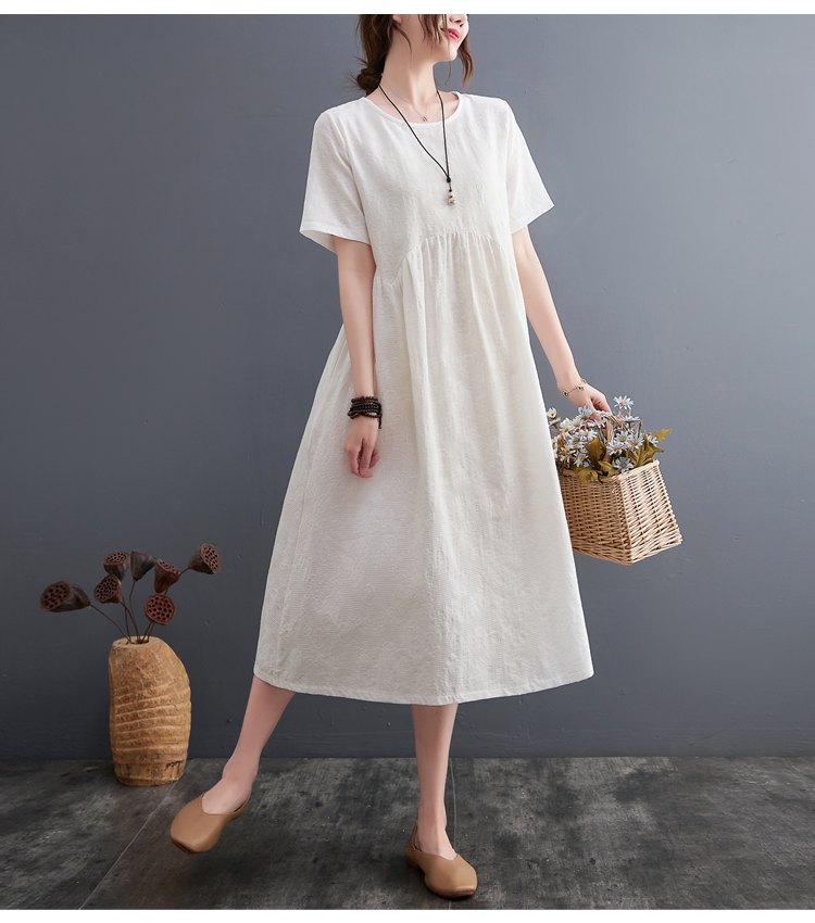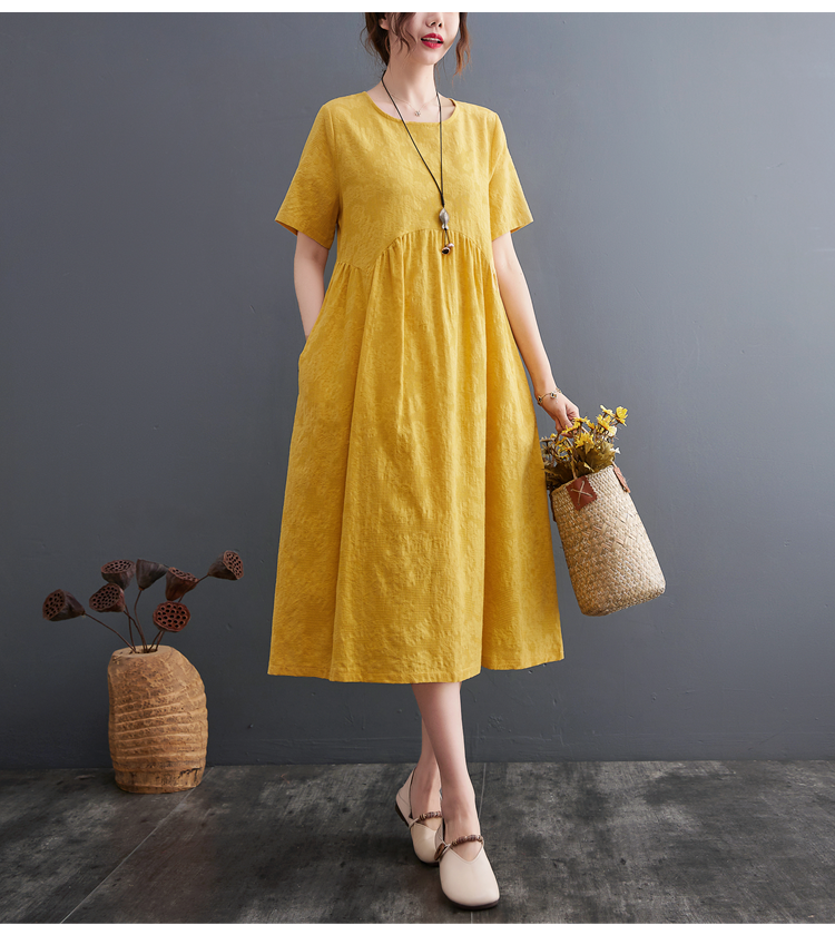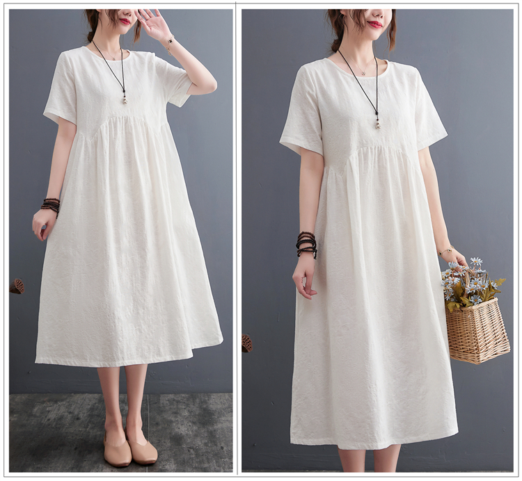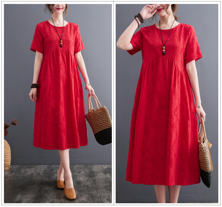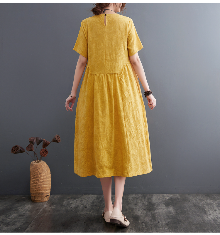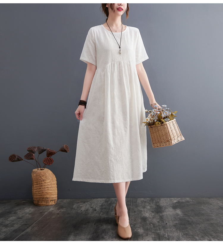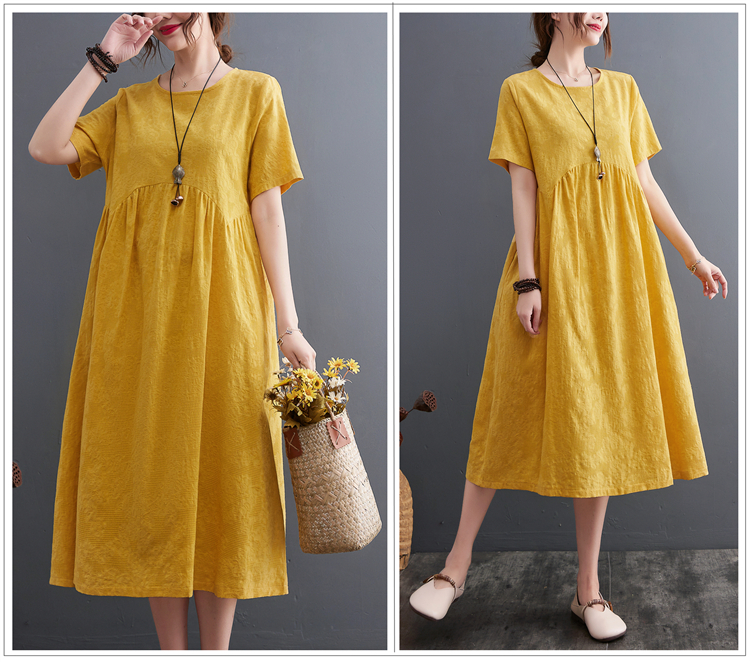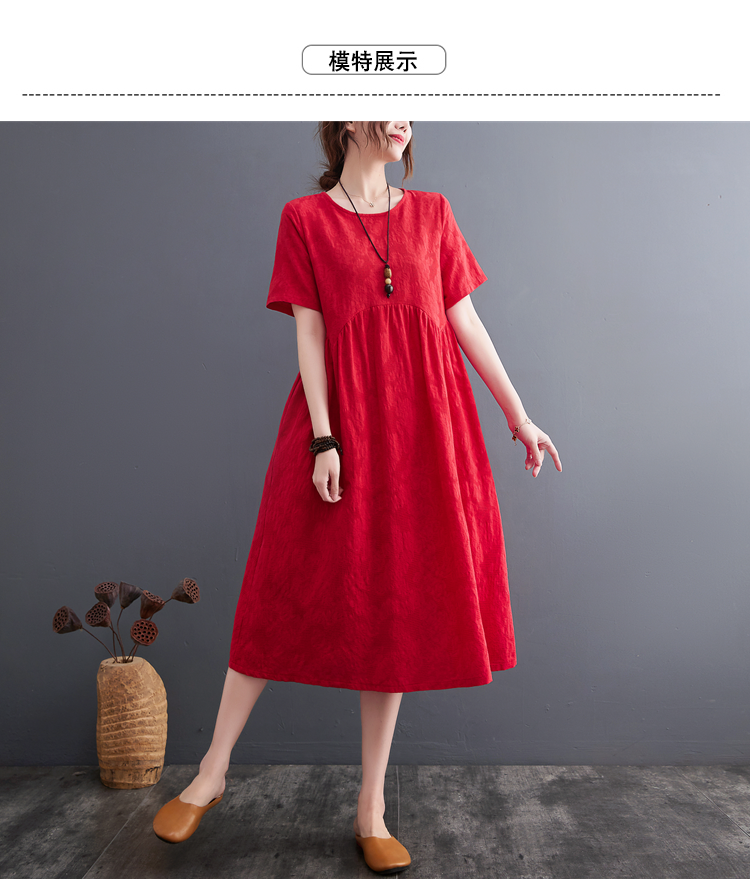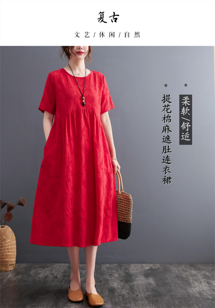 RY3659# 实拍 2025年夏季新款韩版文艺遮肚显瘦提花棉麻短袖连衣裙女
