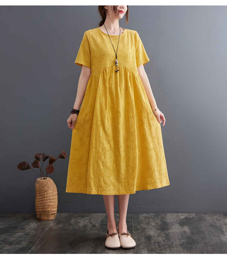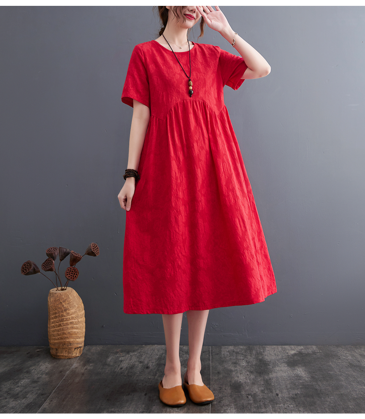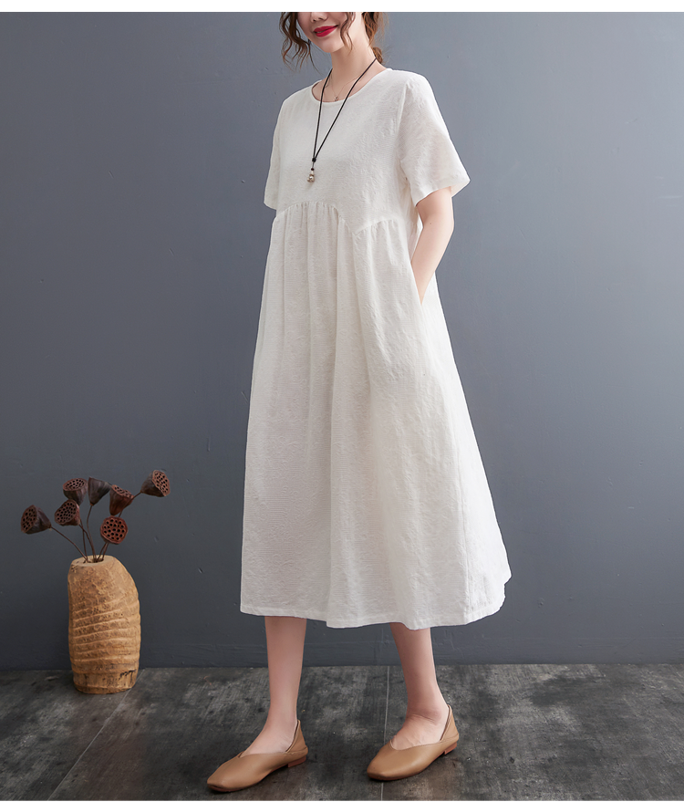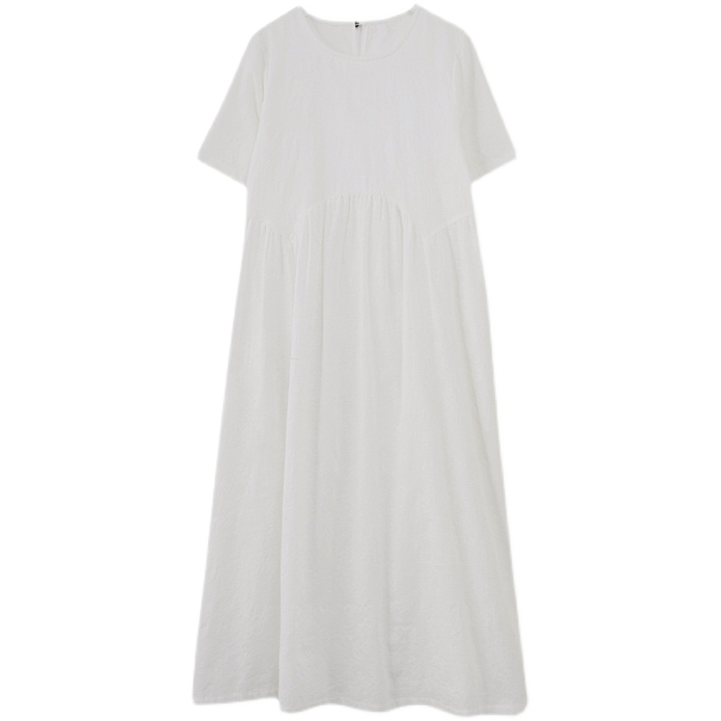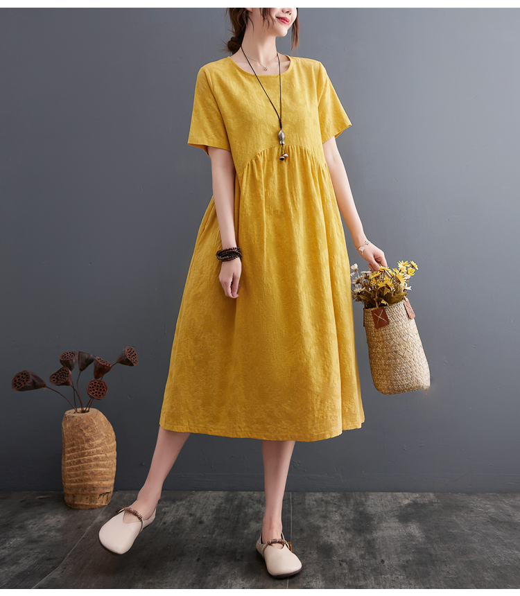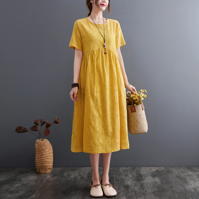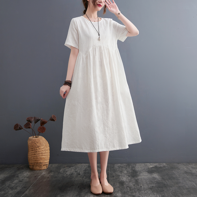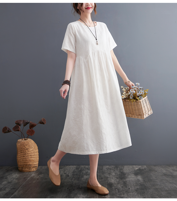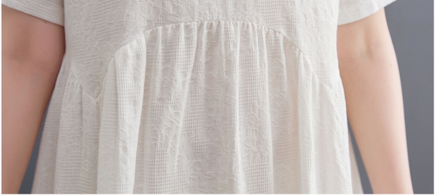 RY3659# 实拍 2025年夏季新款韩版文艺遮肚显瘦提花棉麻短袖连衣裙女