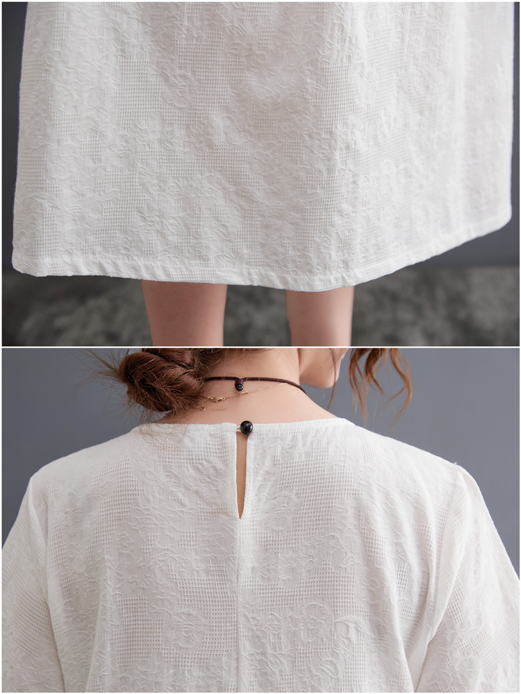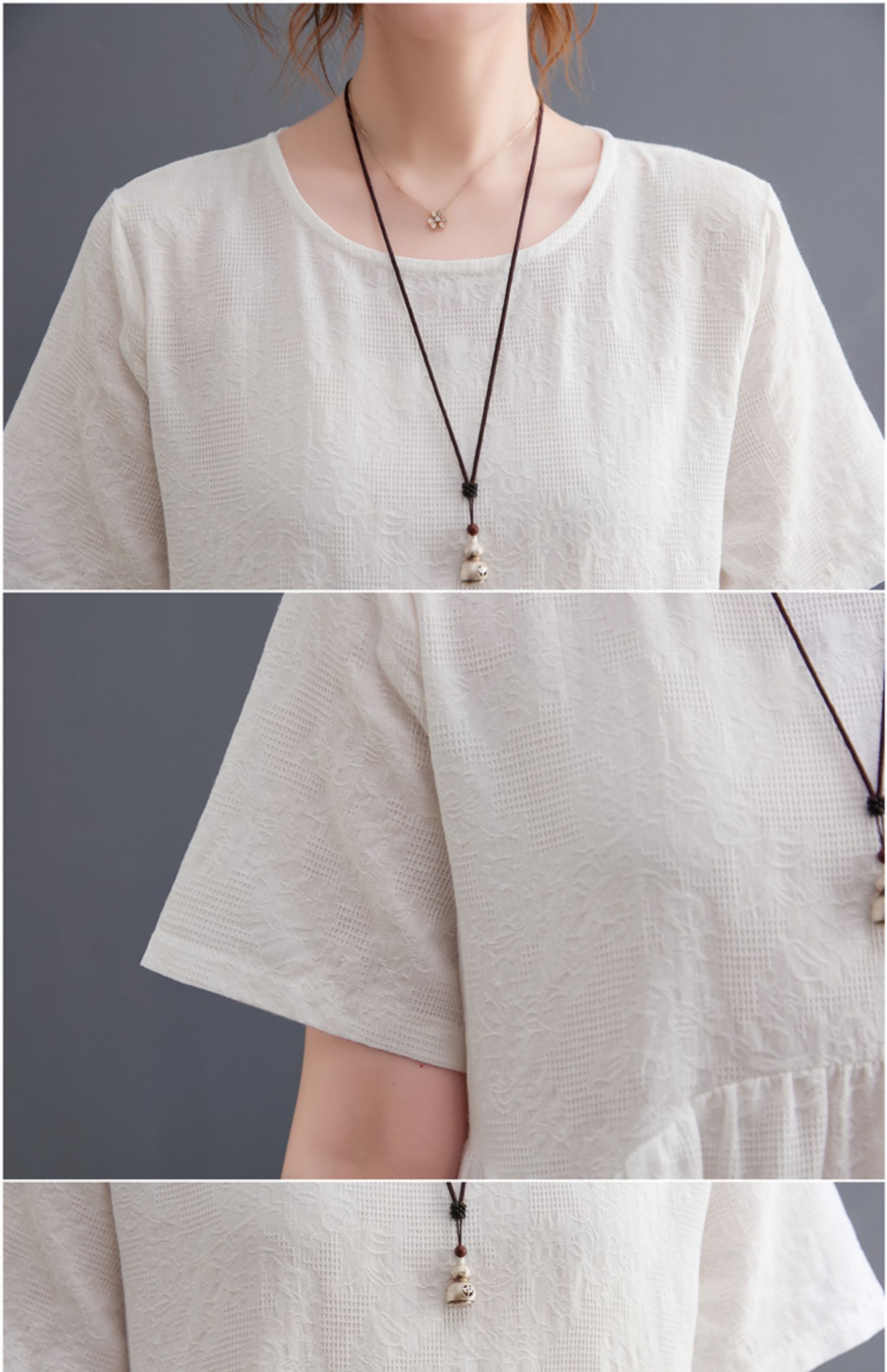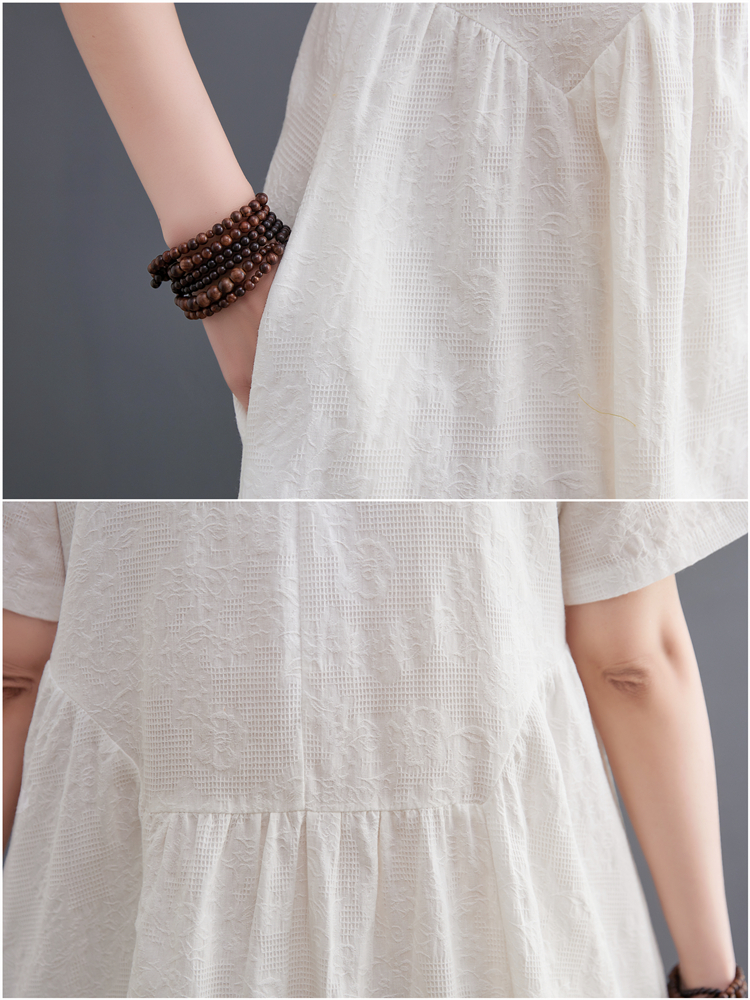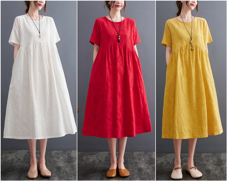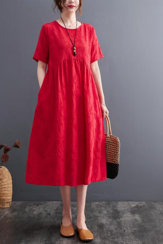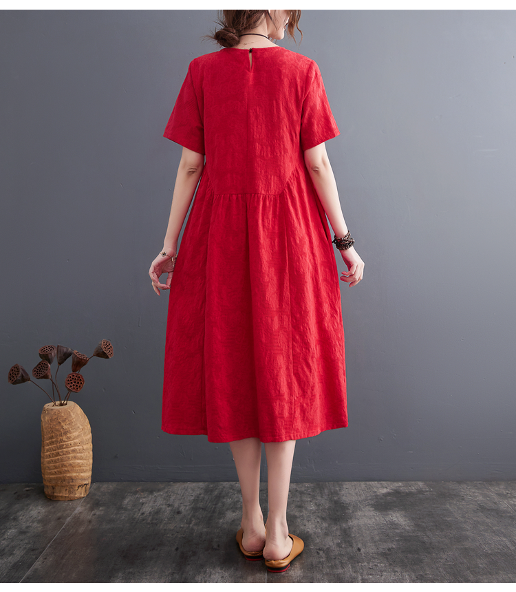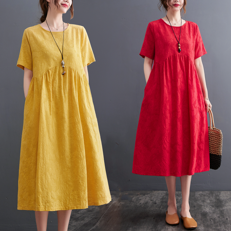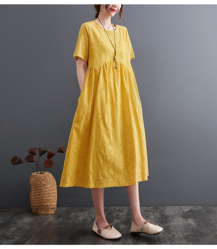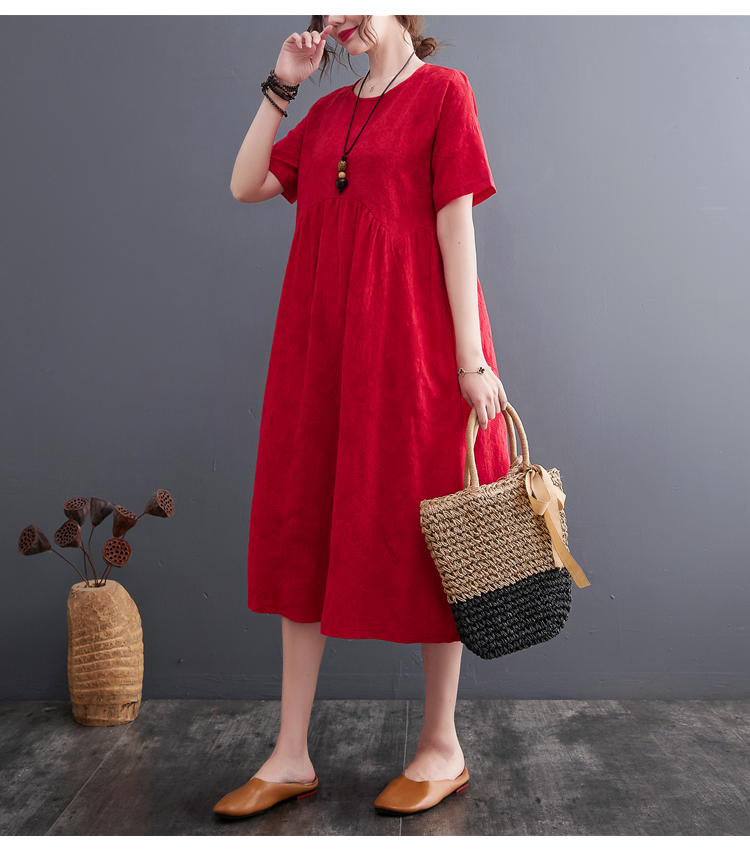 RY3659# 实拍 2025年夏季新款韩版文艺遮肚显瘦提花棉麻短袖连衣裙女