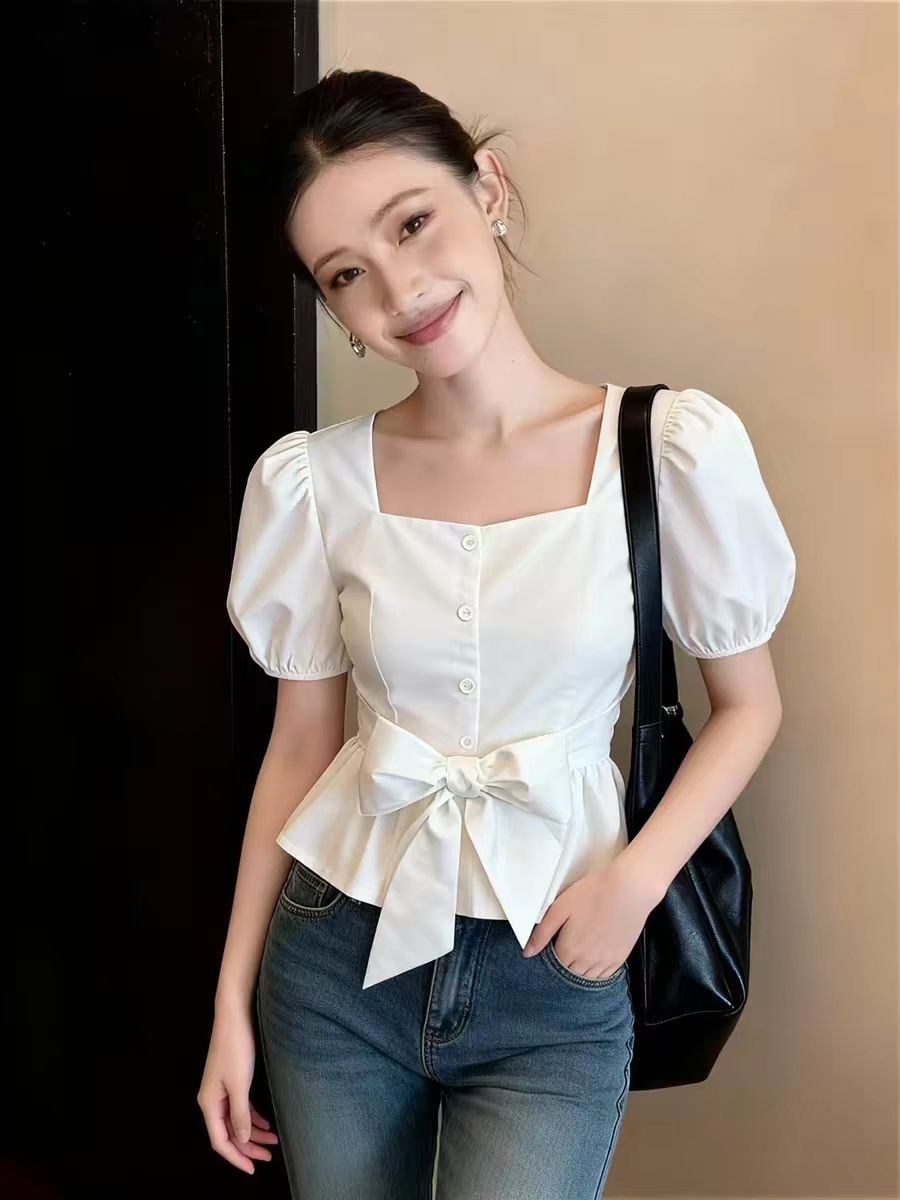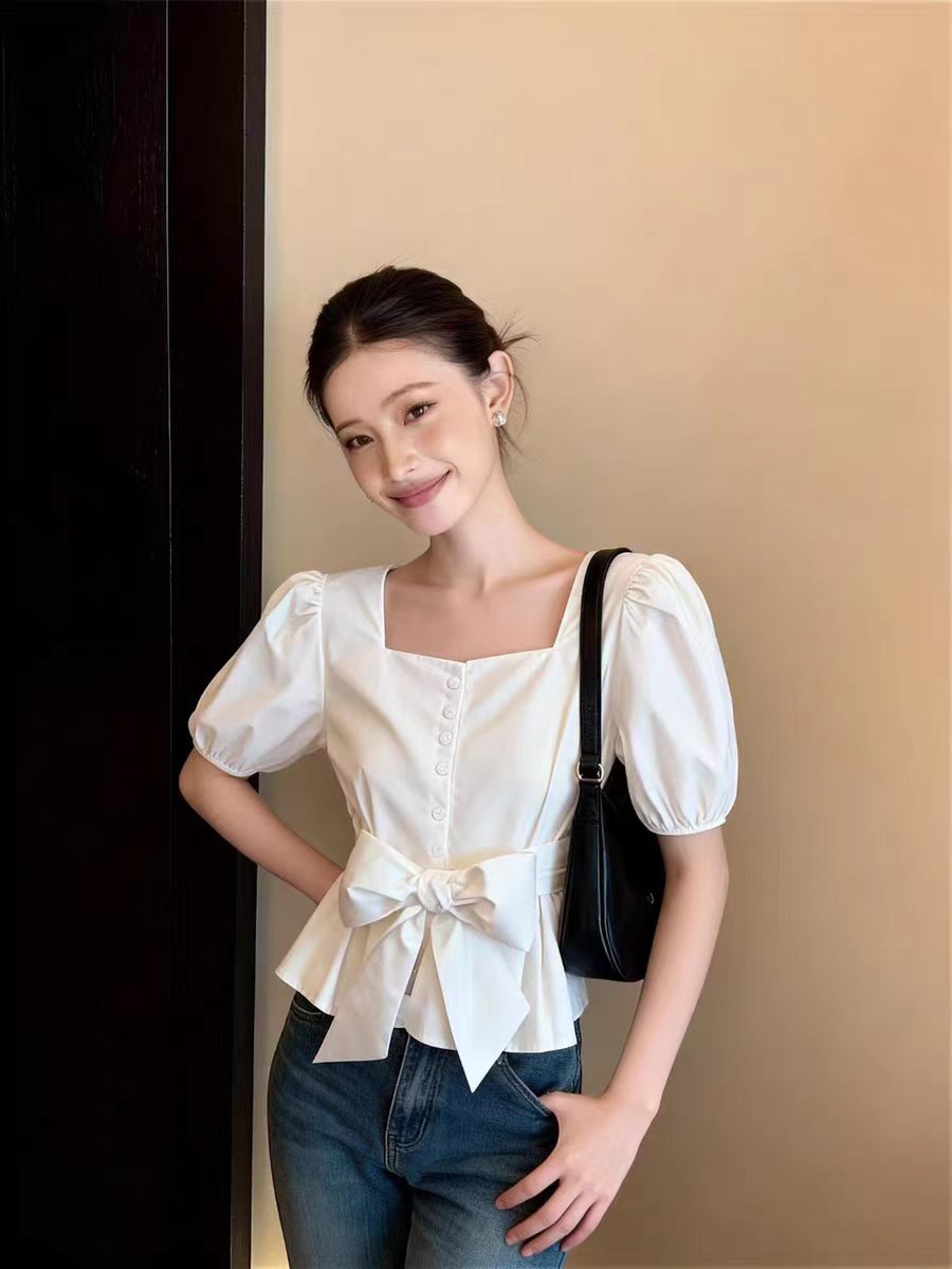 RY3676# 2026夏季新款蝴蝶结收腰设计感泡泡袖方领显瘦百搭衬衫