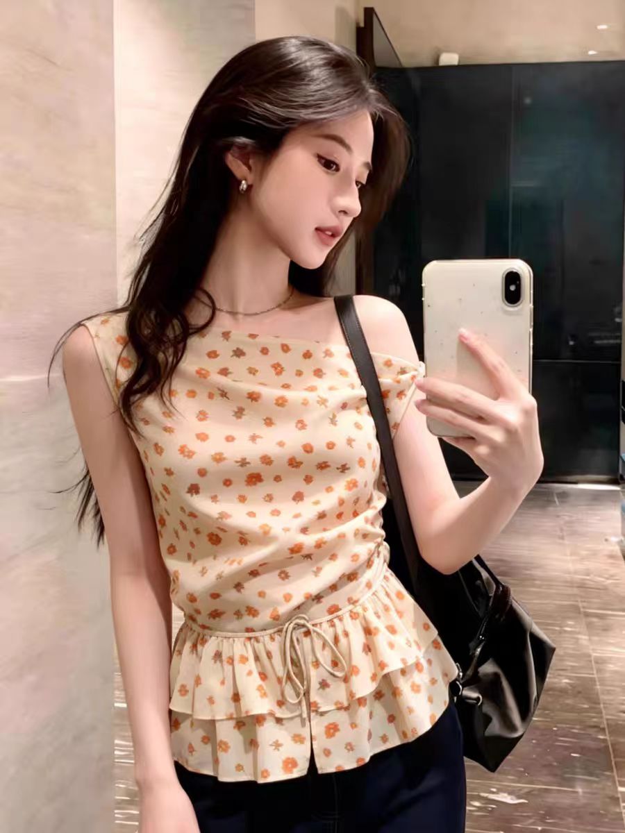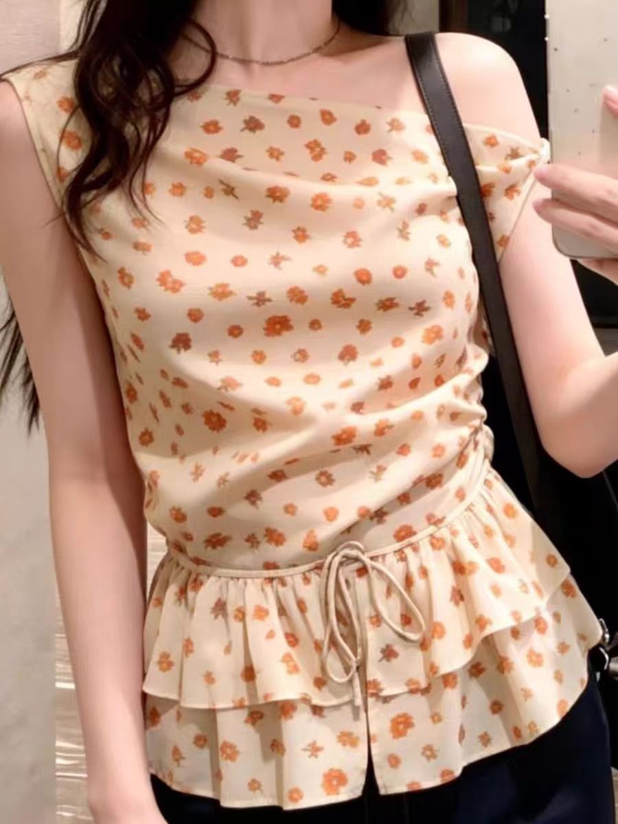 RY3677# 2026夏季新款别致设计感绝美碎花斜肩显瘦无袖衬衫