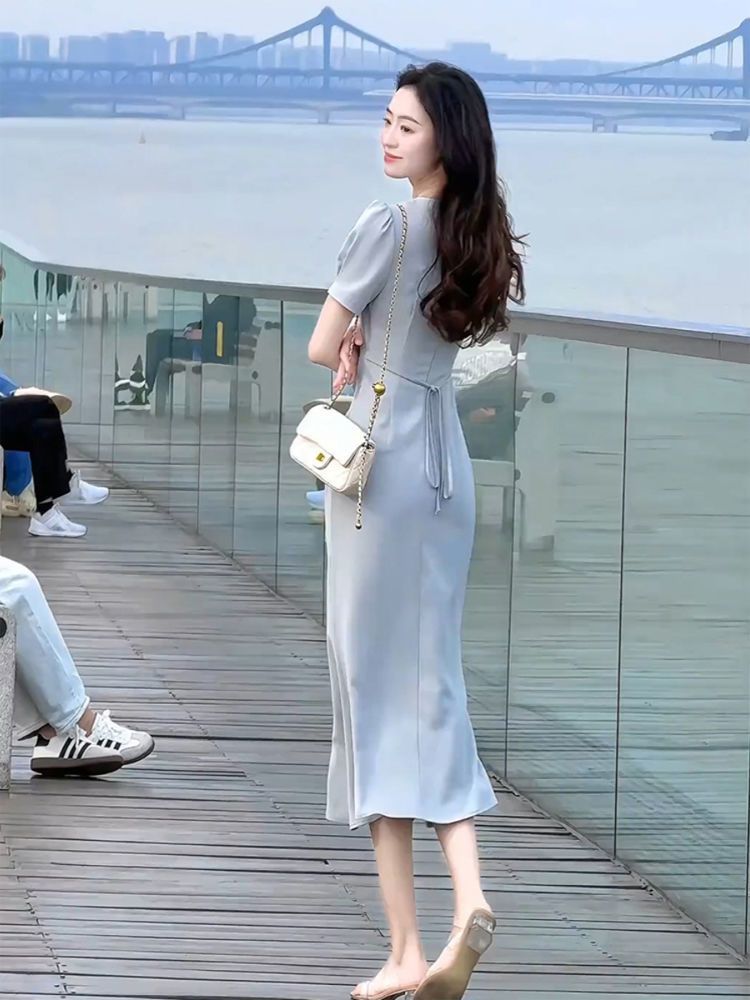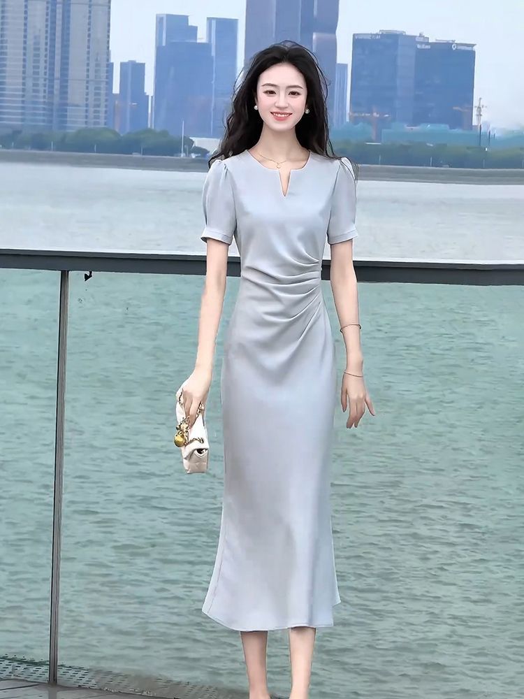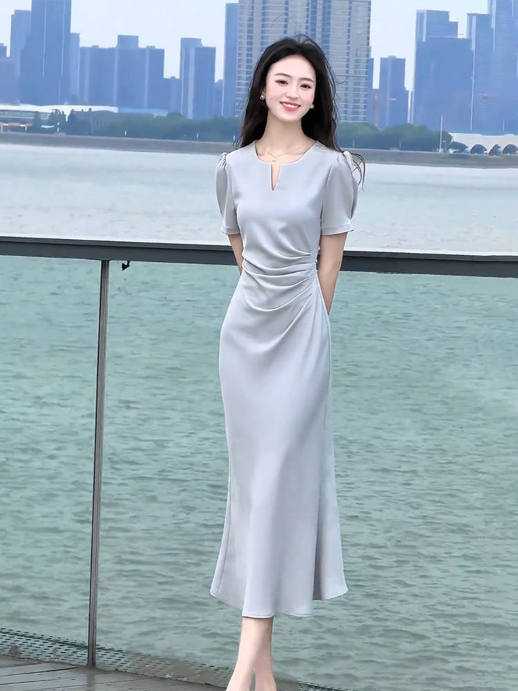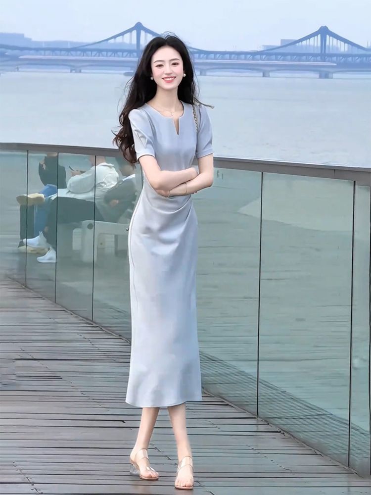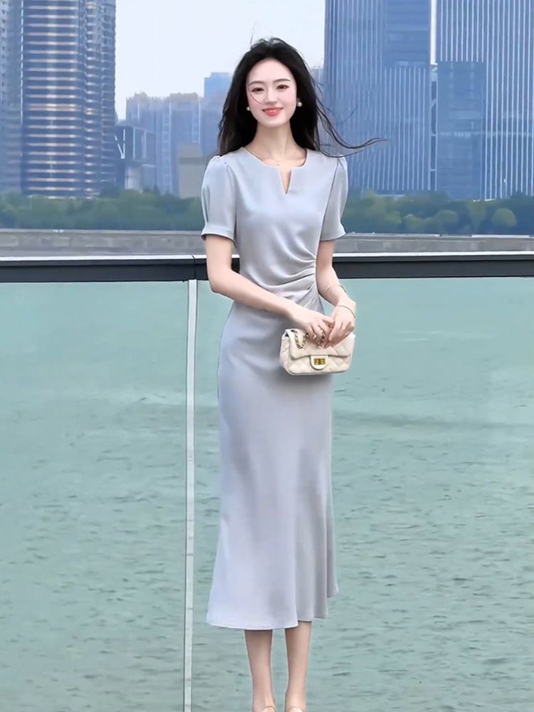 RY3678# 醋酸面料连衣裙女夏季法式气质高端精致上流社会蓝色v领裙子