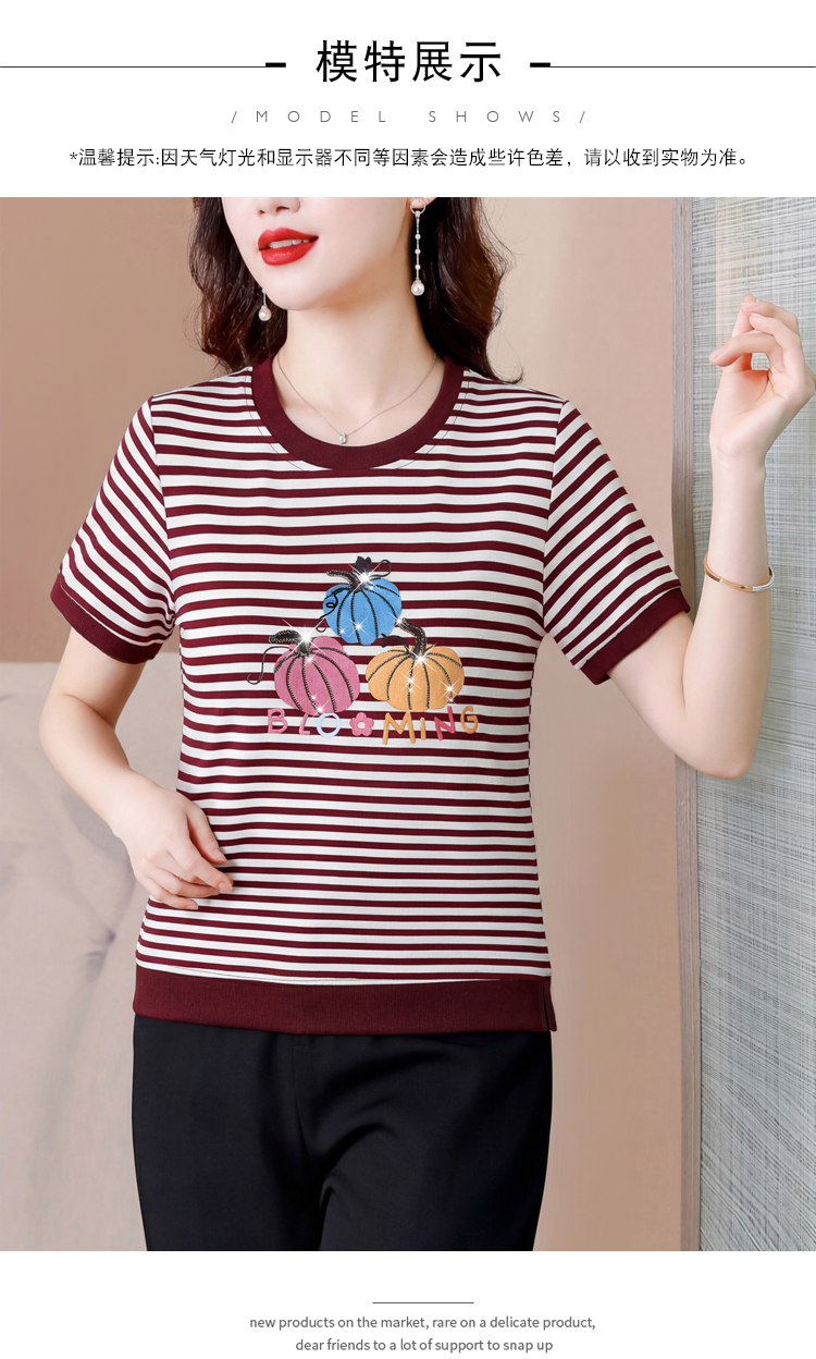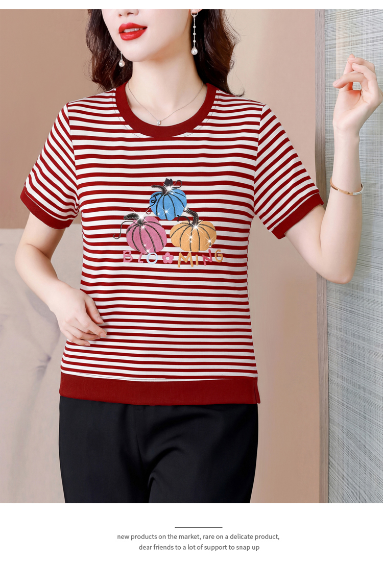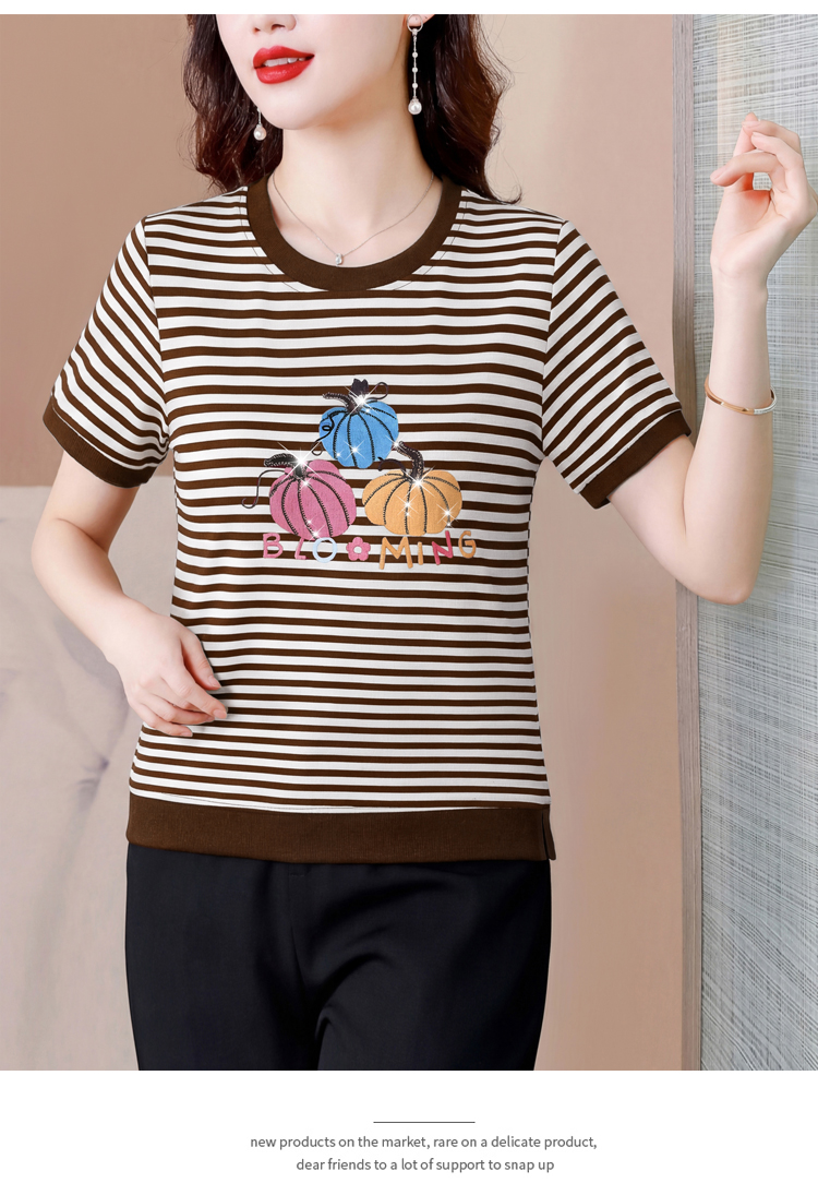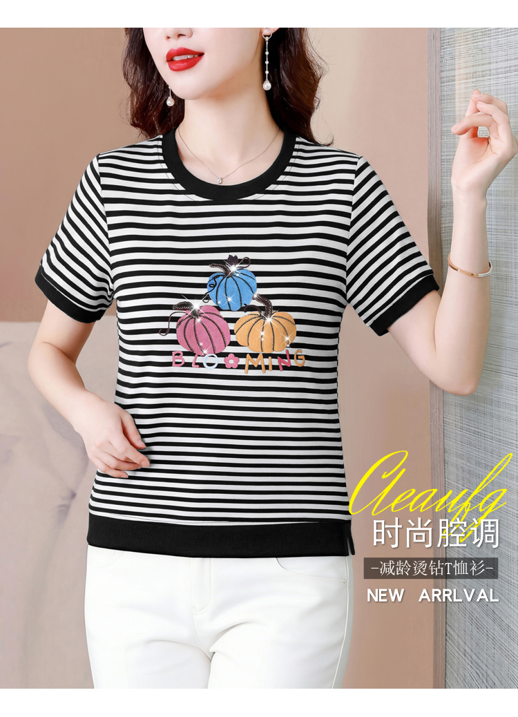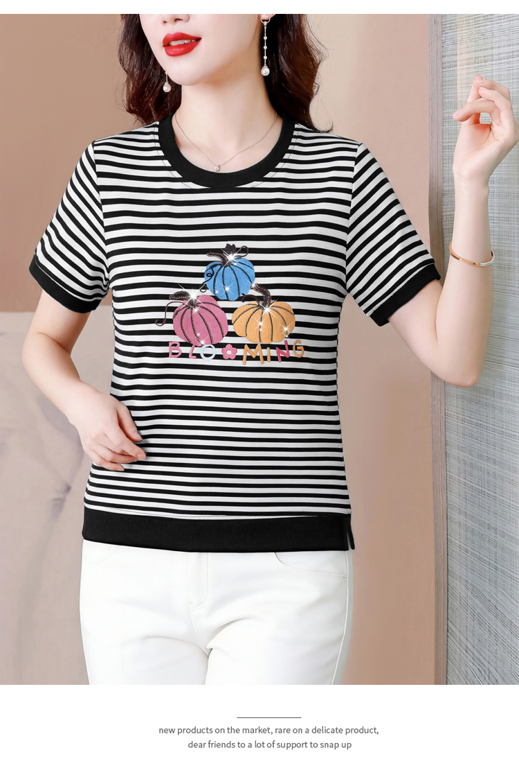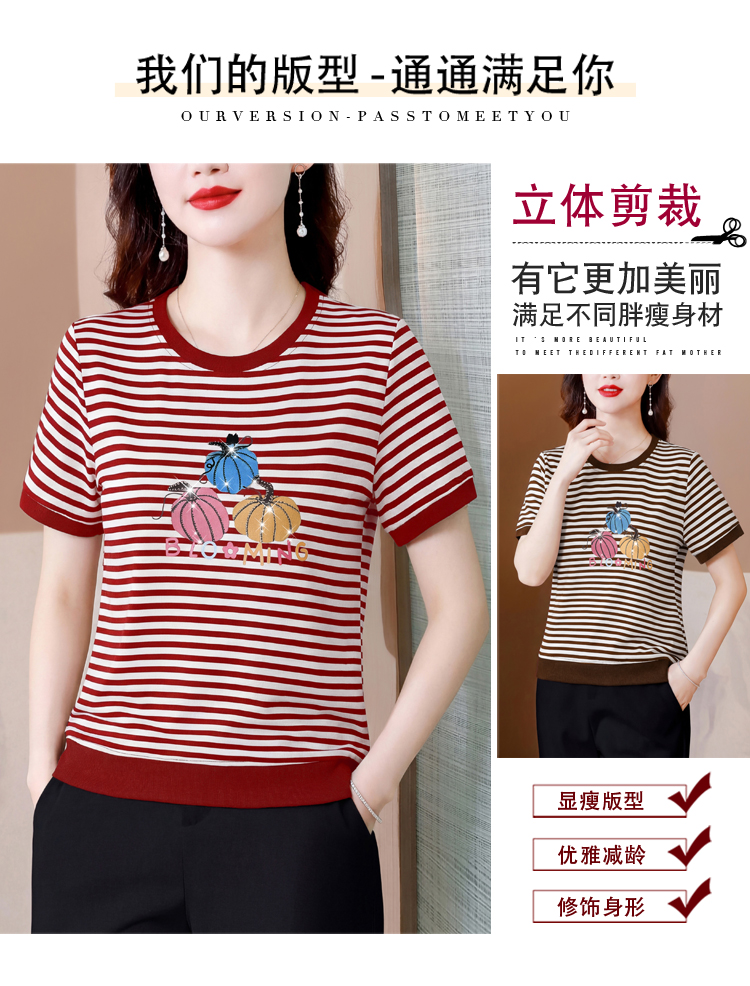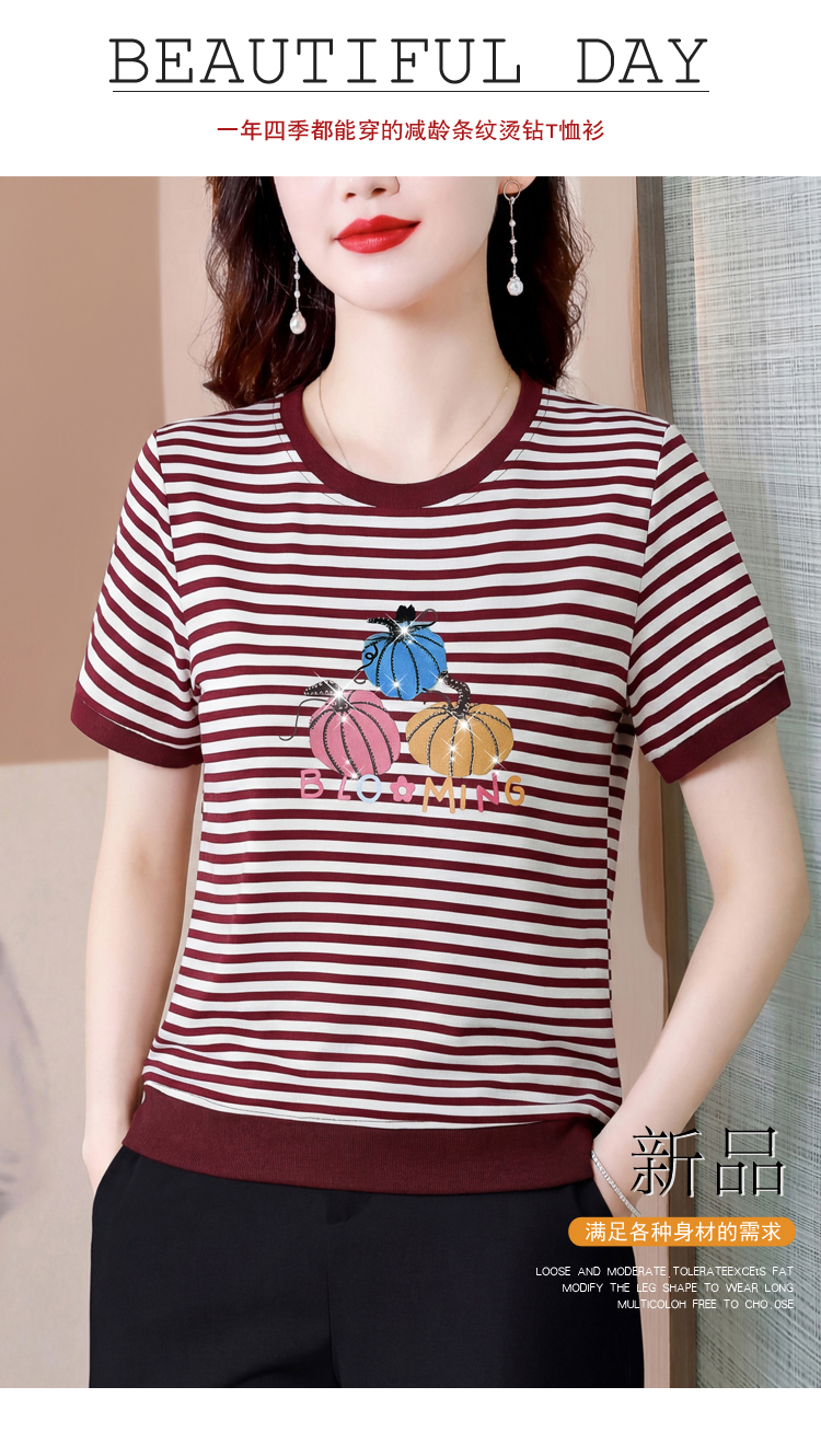 RY3683# 实拍 2026夏季新款条纹短袖妈妈装宽松遮肚南瓜图案印花烫钻T恤女