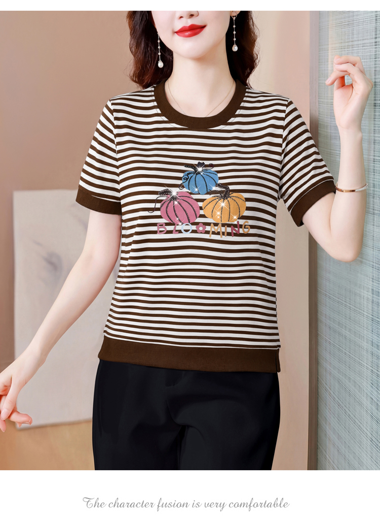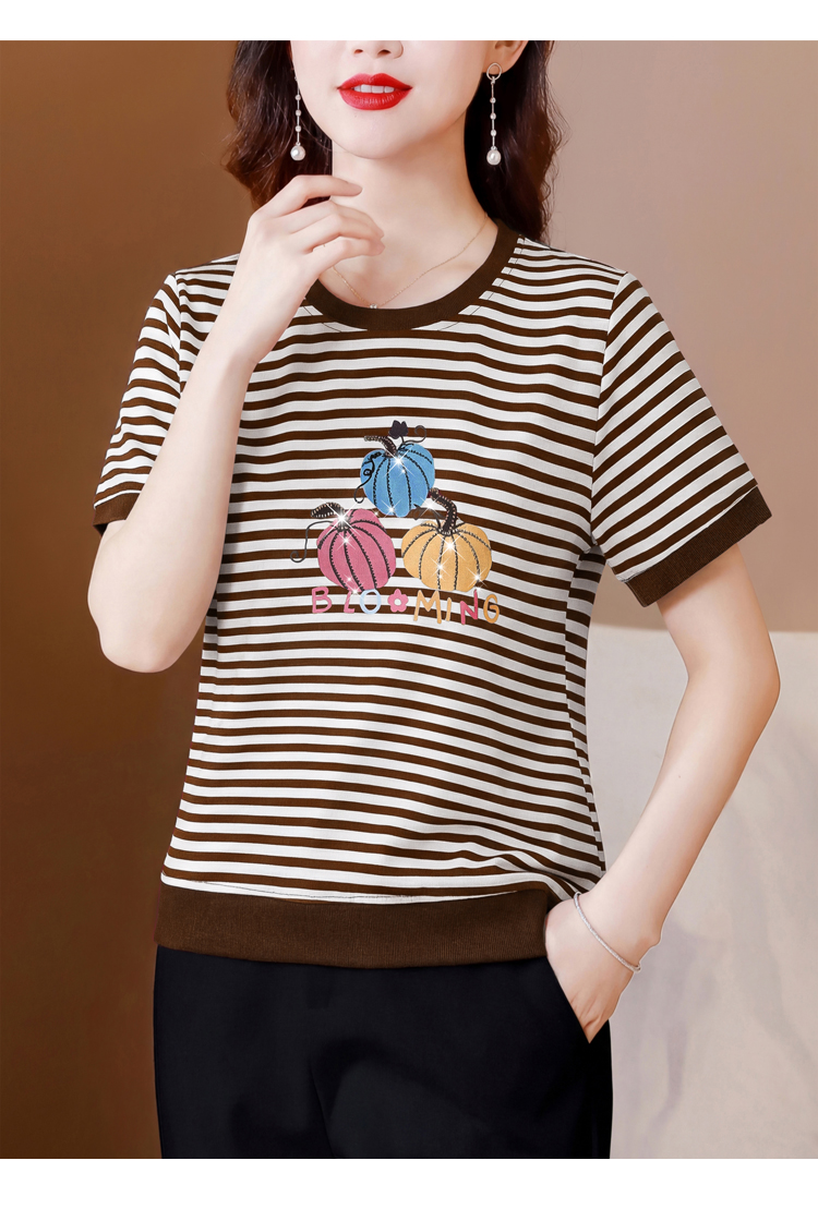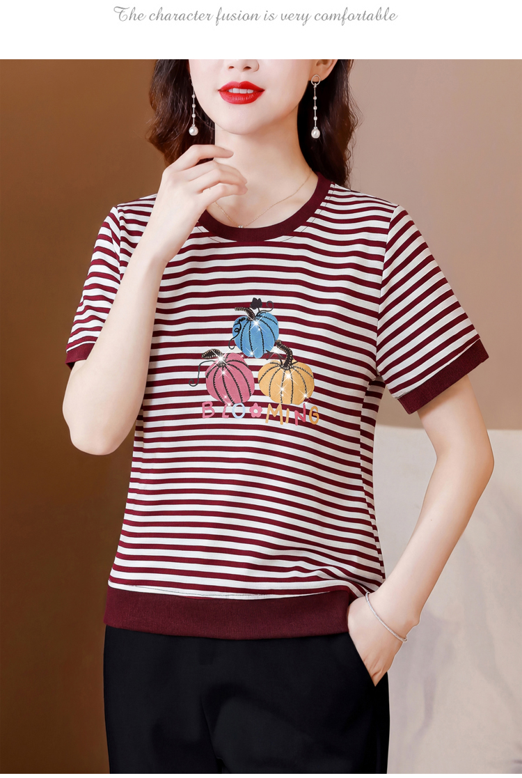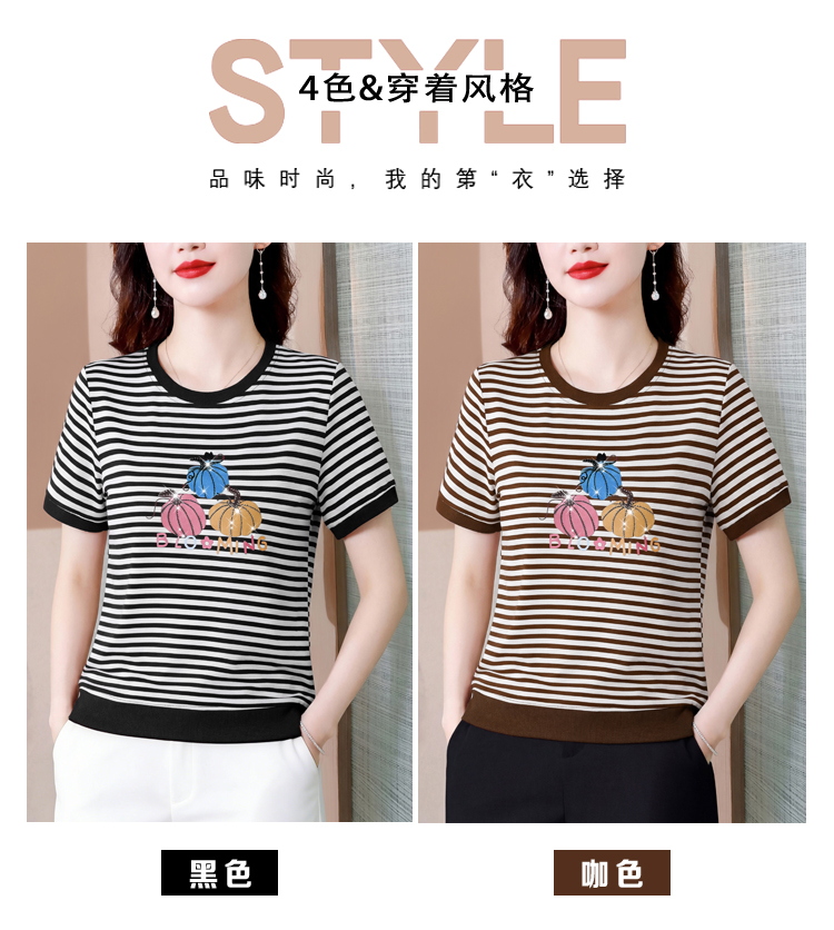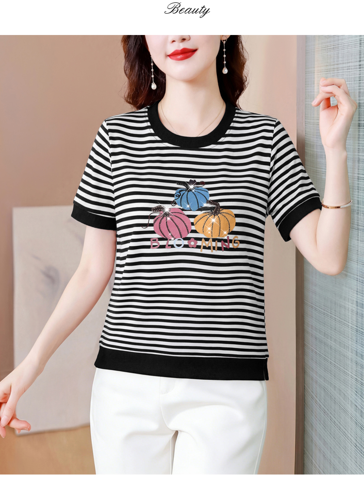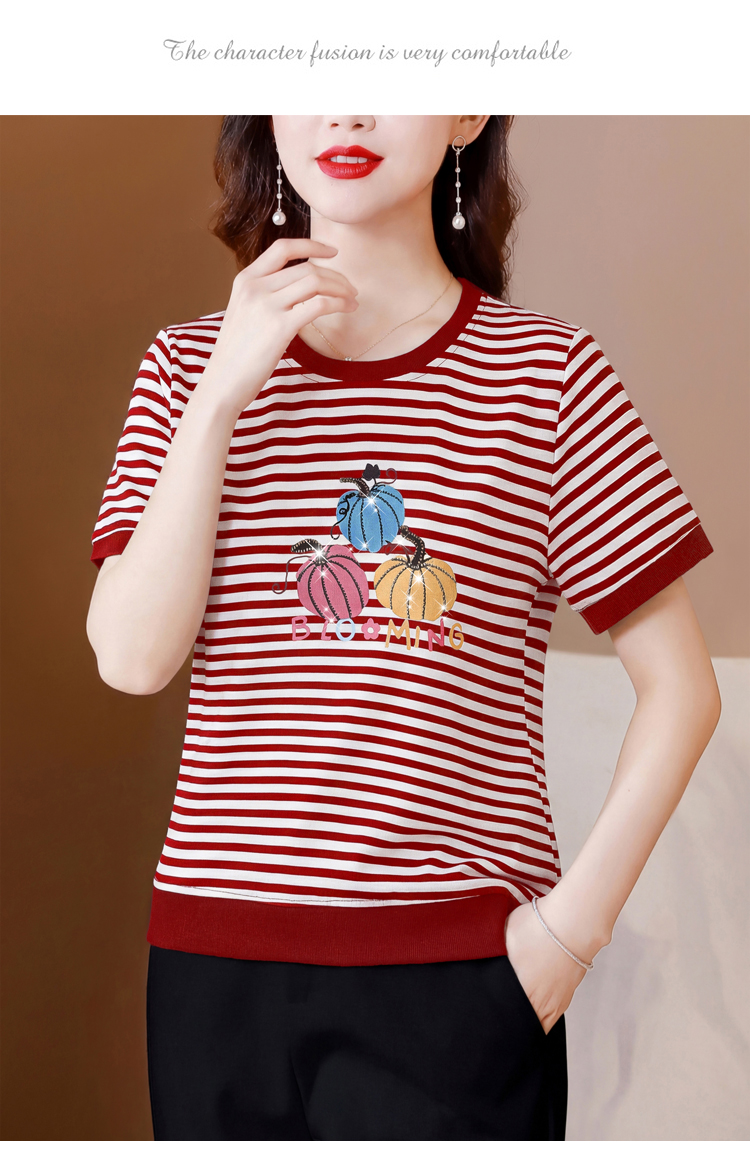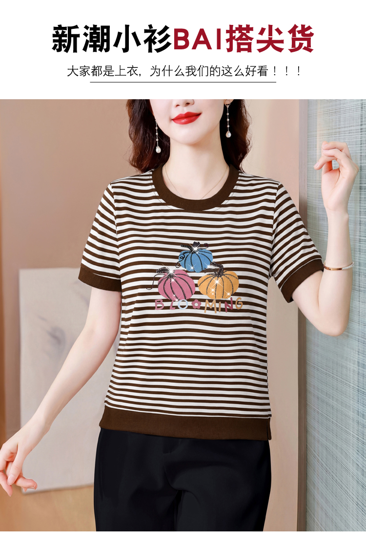 RY3683# 实拍 2026夏季新款条纹短袖妈妈装宽松遮肚南瓜图案印花烫钻T恤女