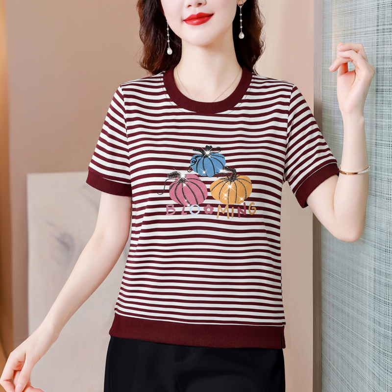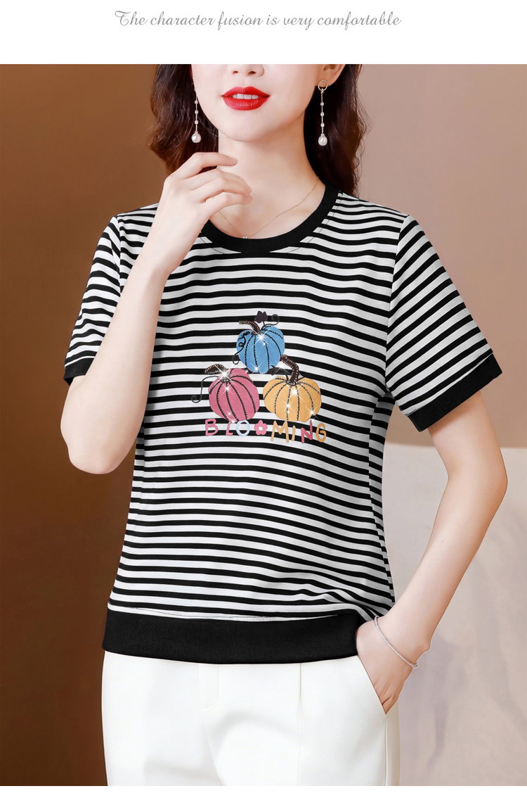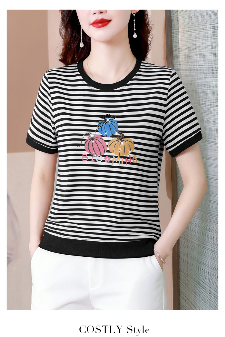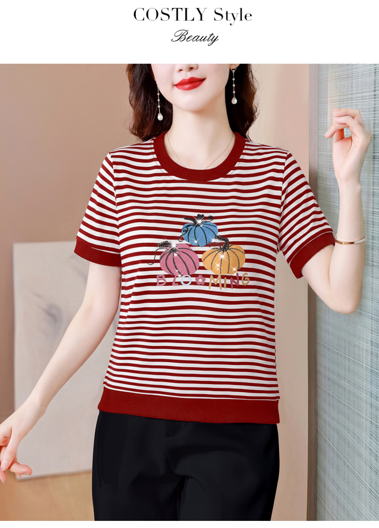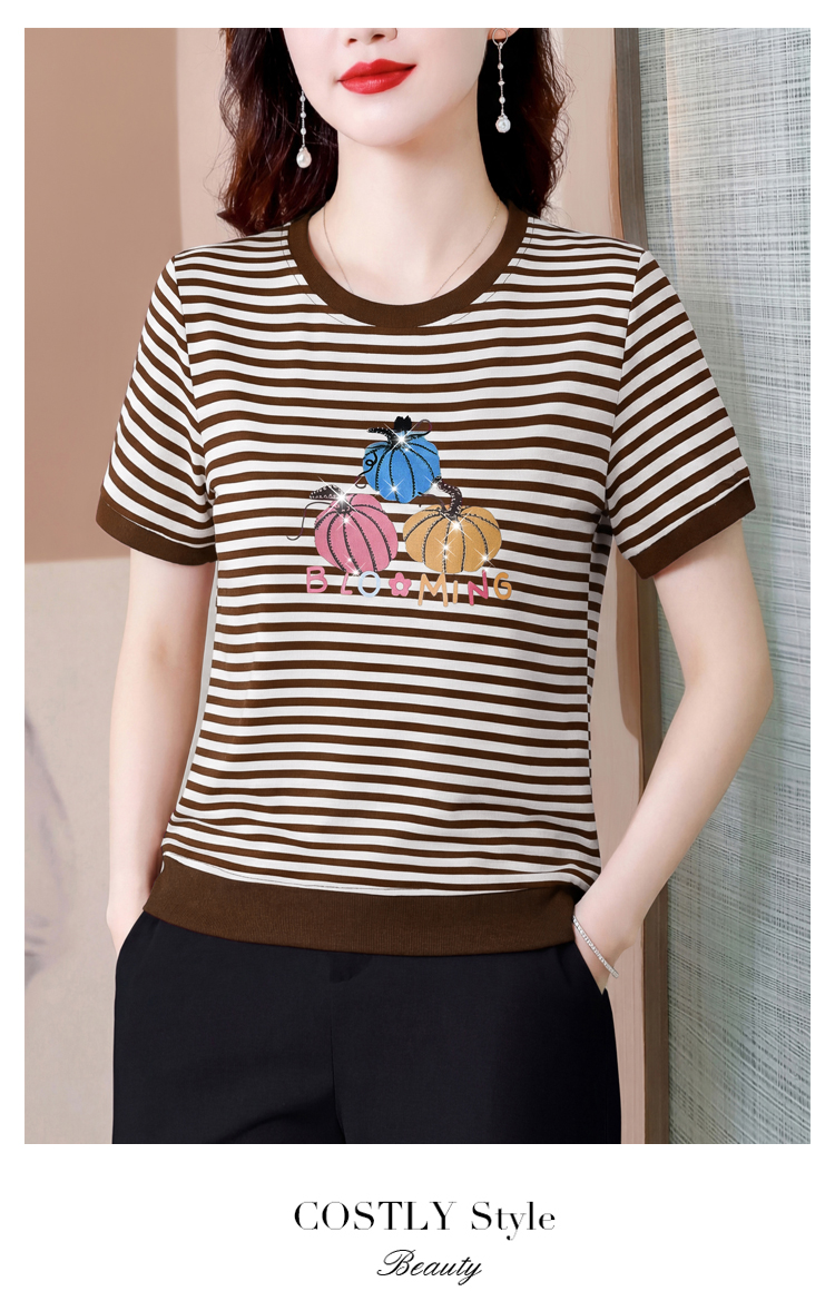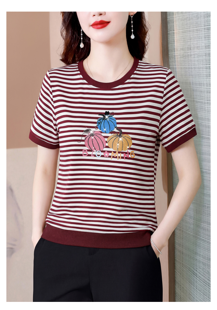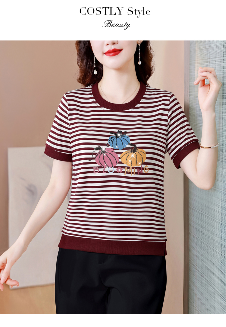 RY3683# 实拍 2026夏季新款条纹短袖妈妈装宽松遮肚南瓜图案印花烫钻T恤女