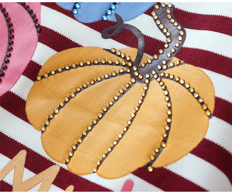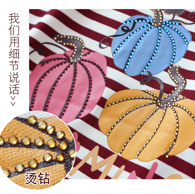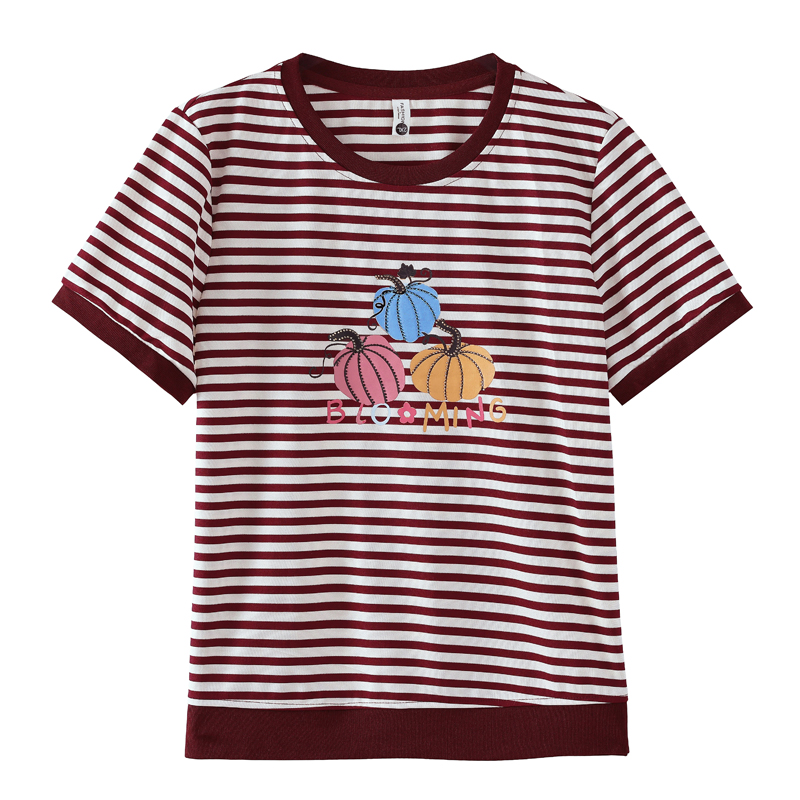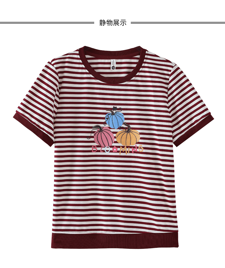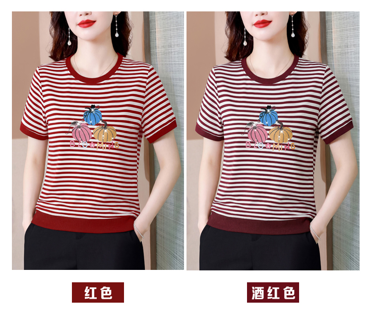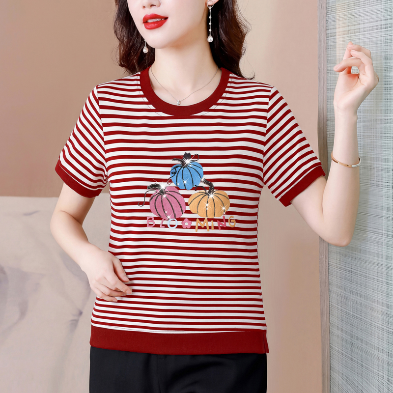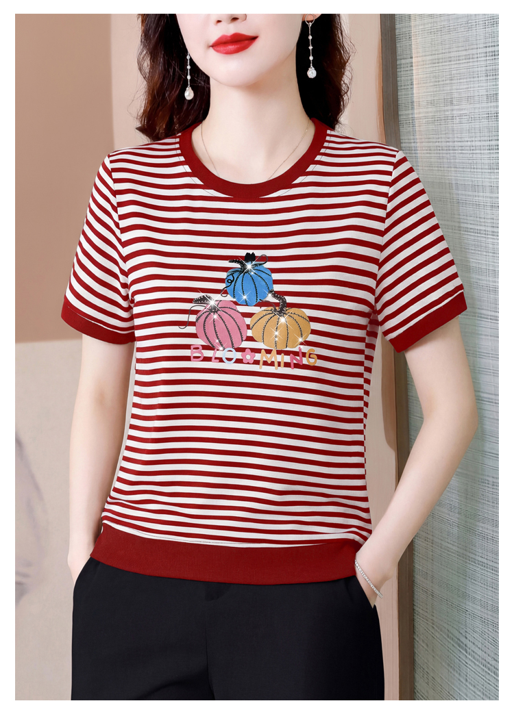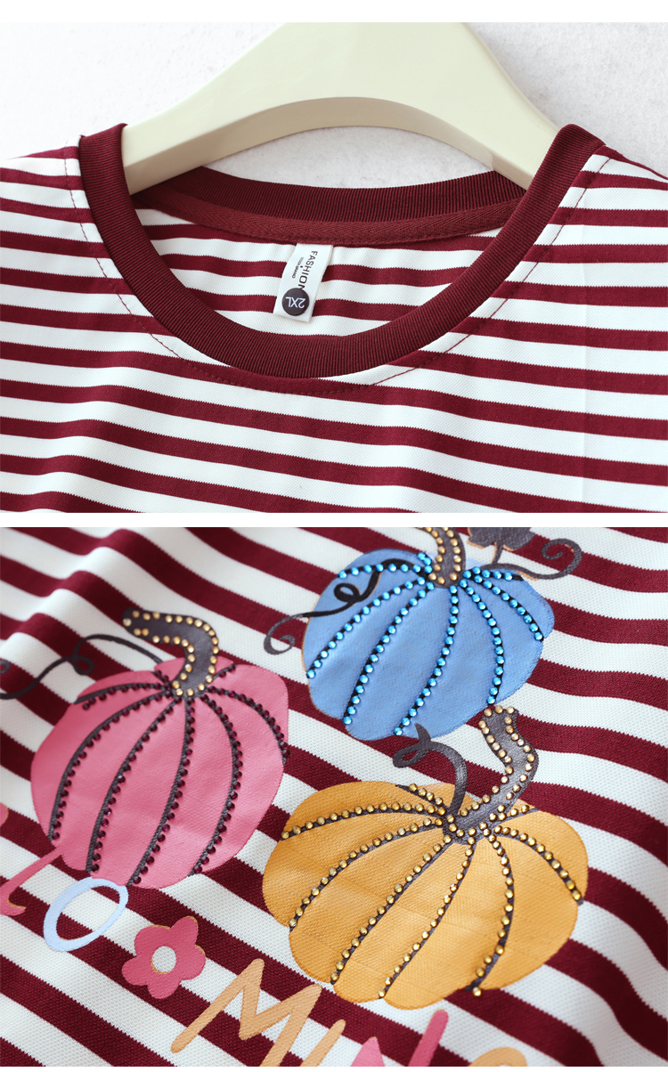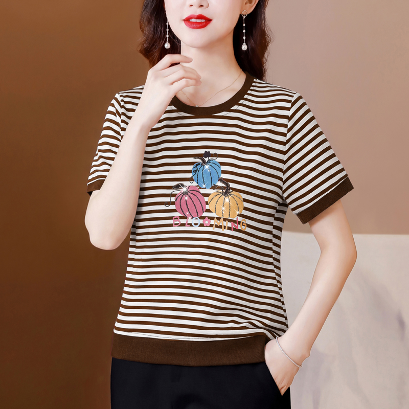 RY3683# 实拍 2026夏季新款条纹短袖妈妈装宽松遮肚南瓜图案印花烫钻T恤女