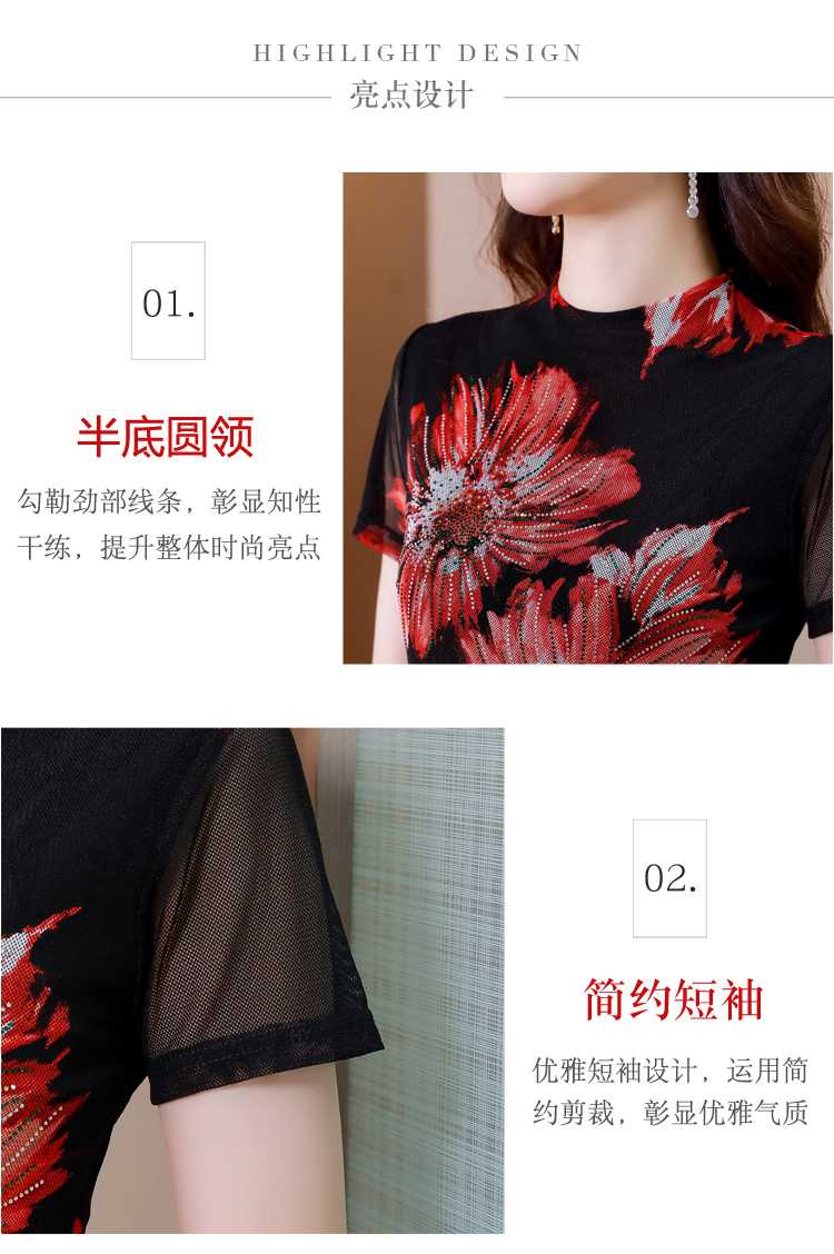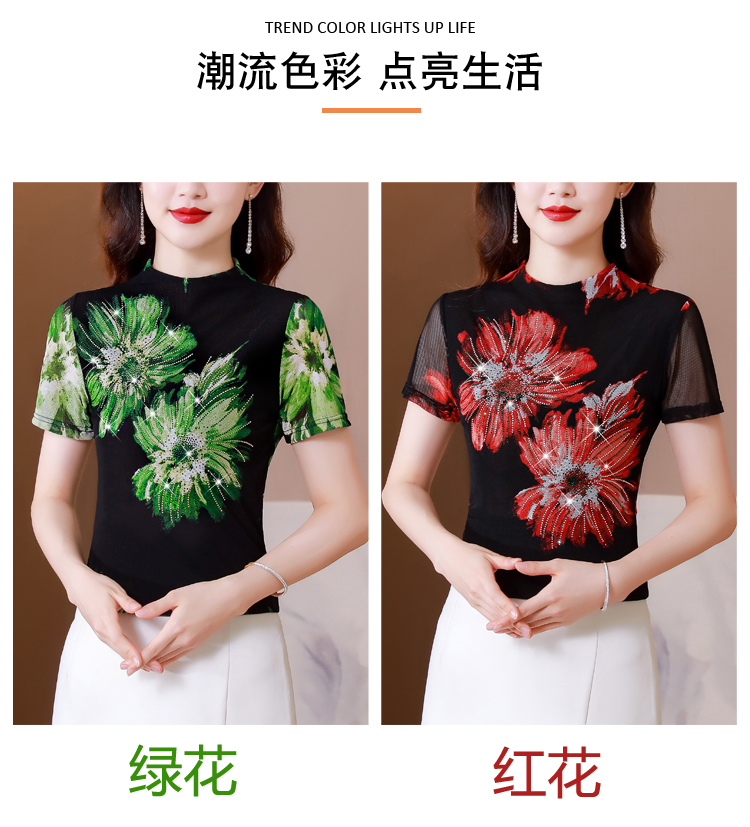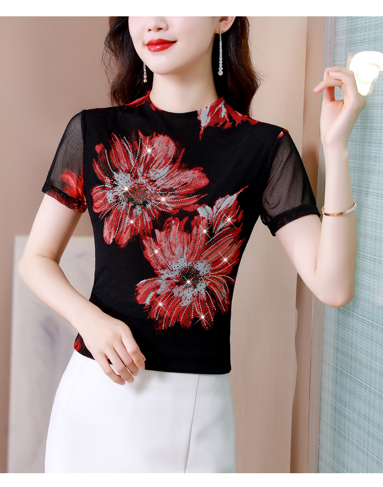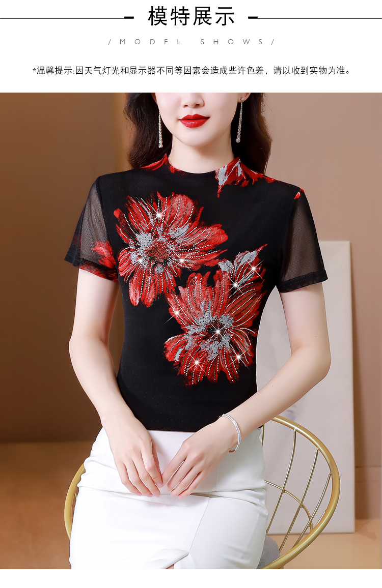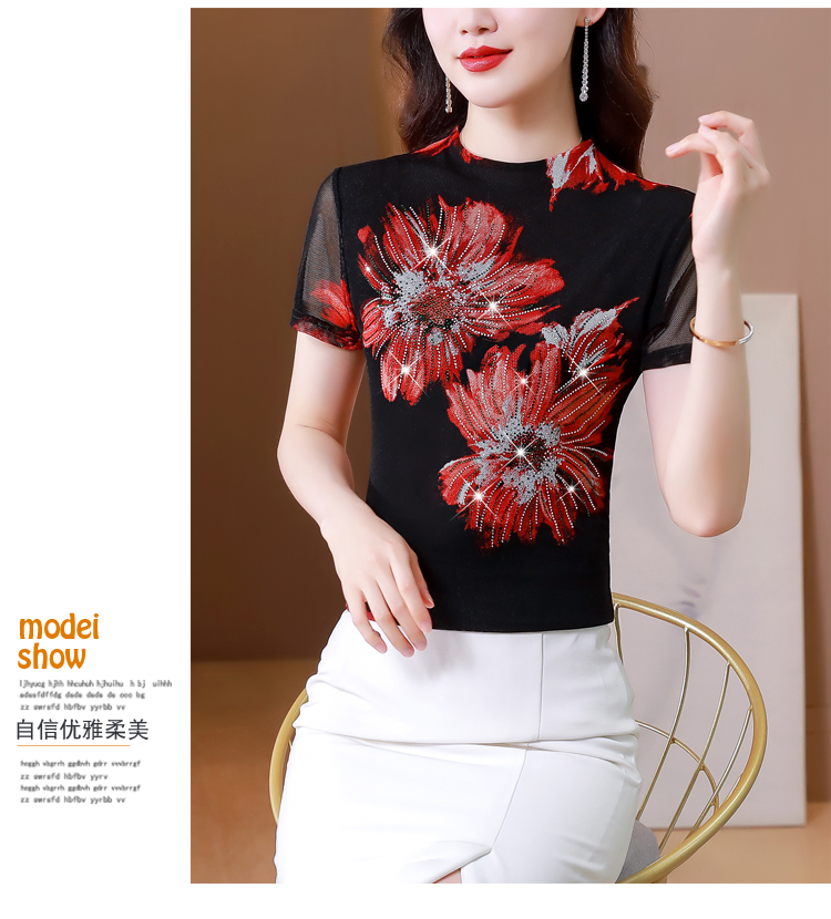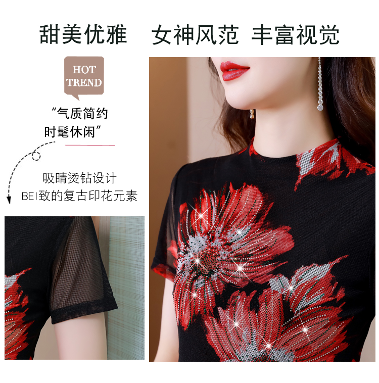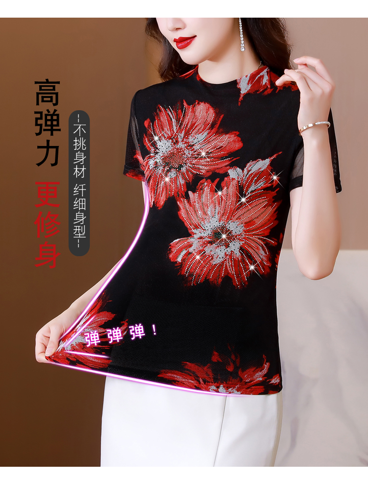 RY3688# 实拍 2026夏季新款韩版修身定位花烫钻网纱印花打底衫上衣女