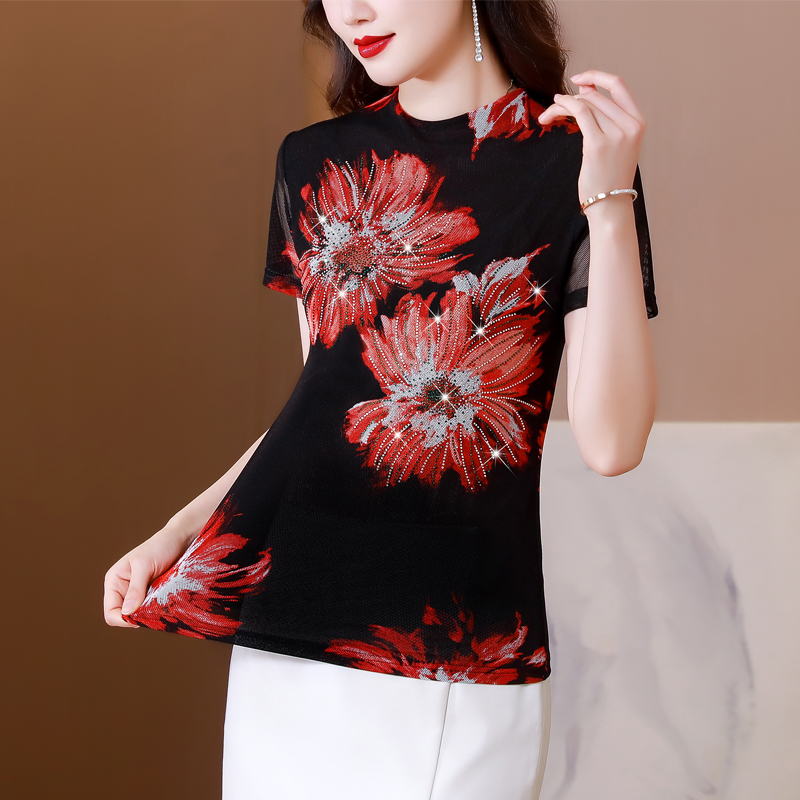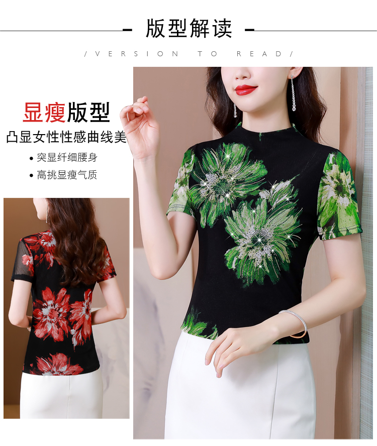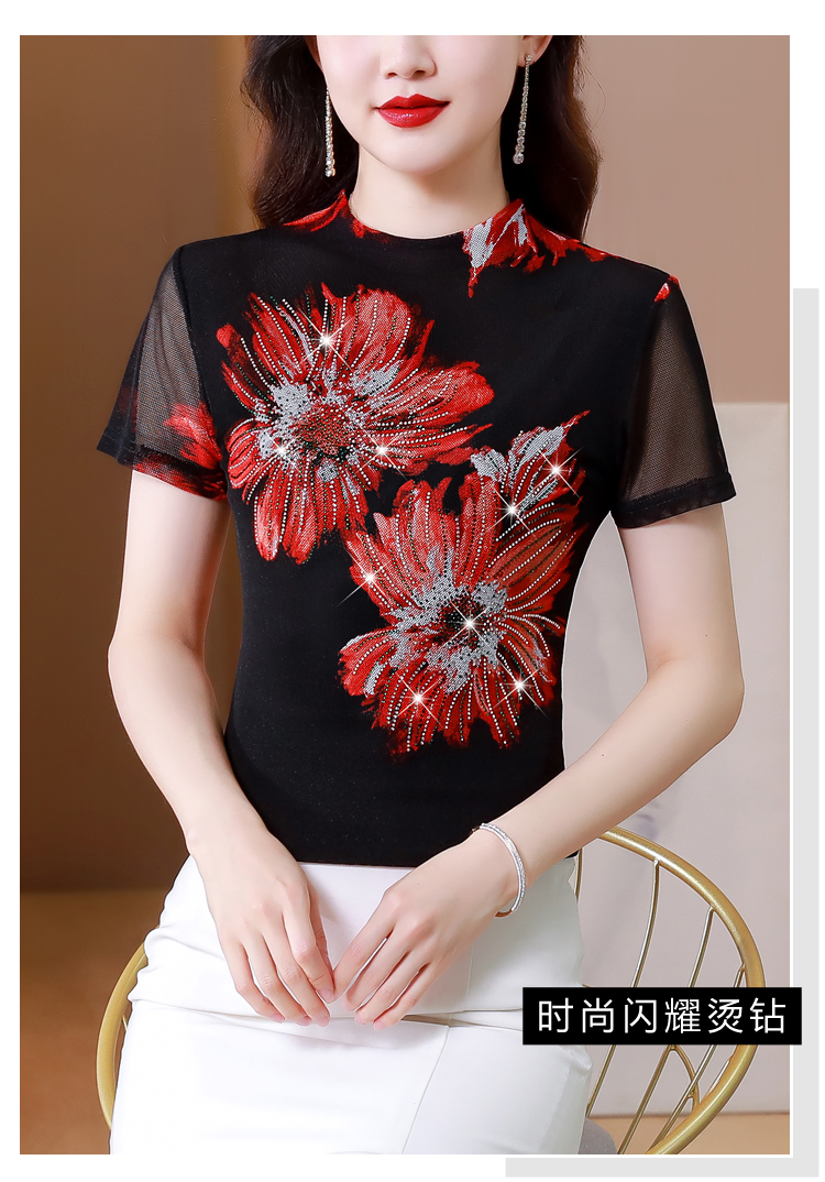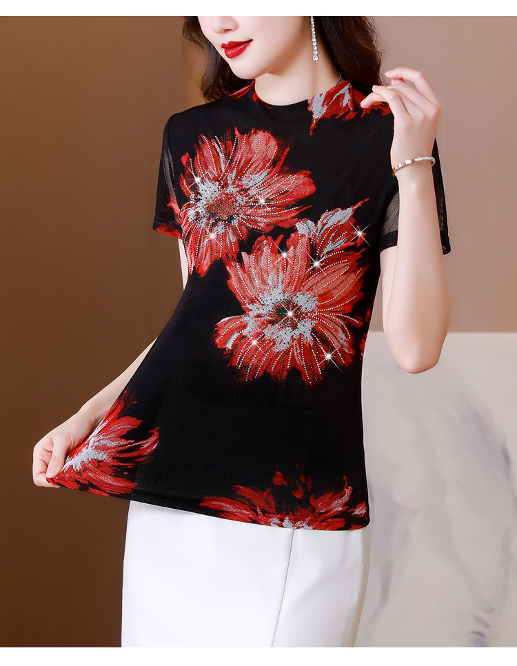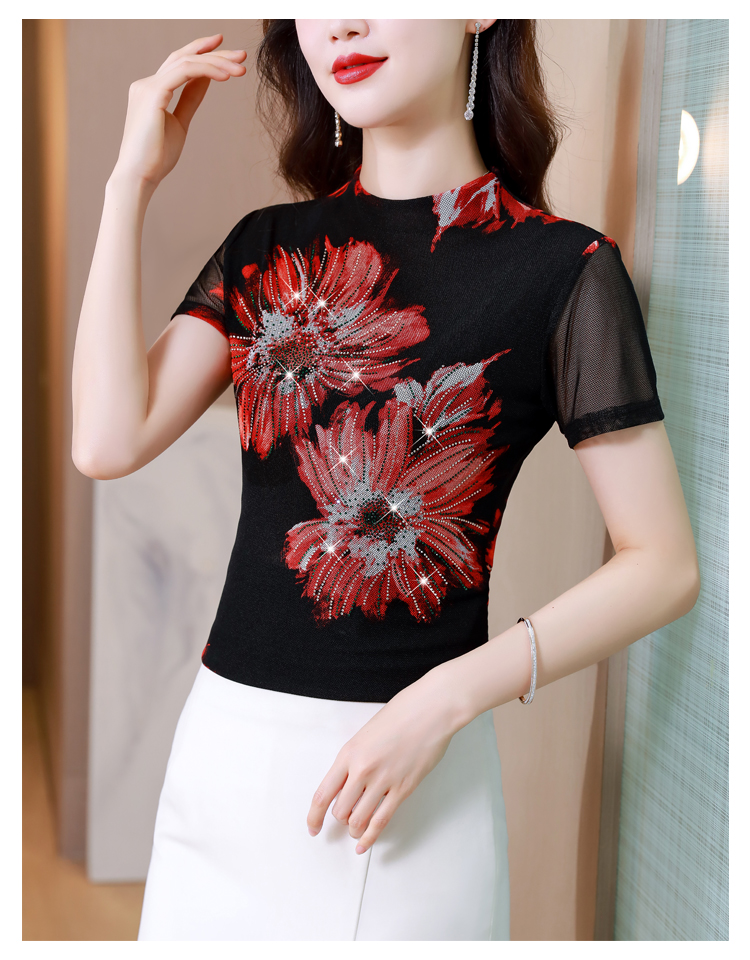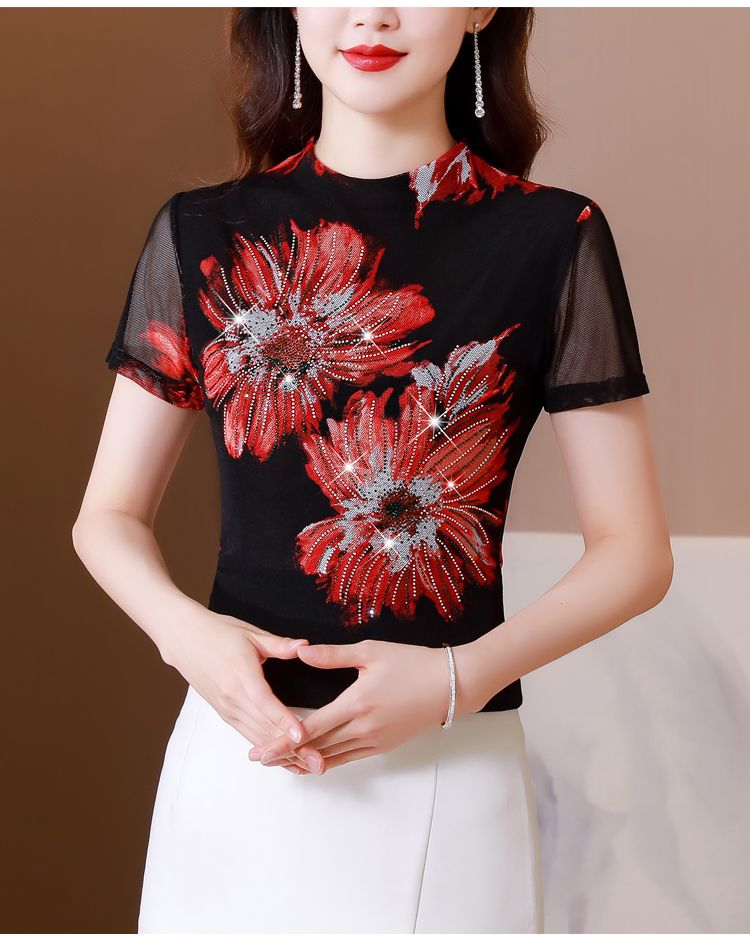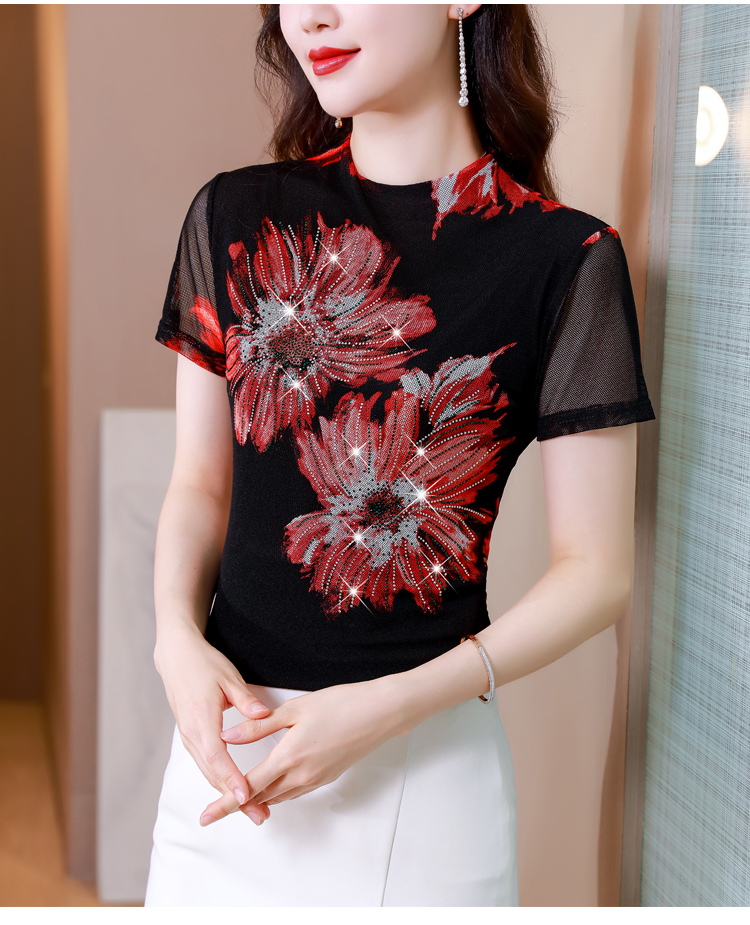 RY3688# 实拍 2026夏季新款韩版修身定位花烫钻网纱印花打底衫上衣女