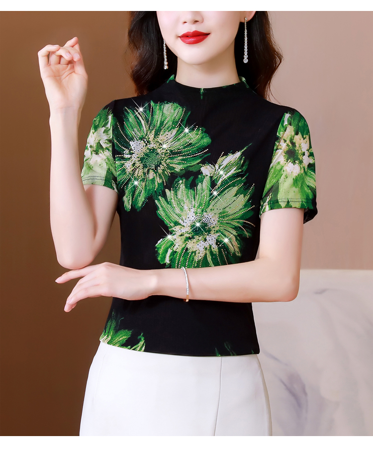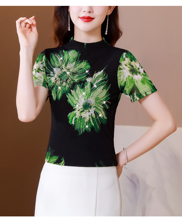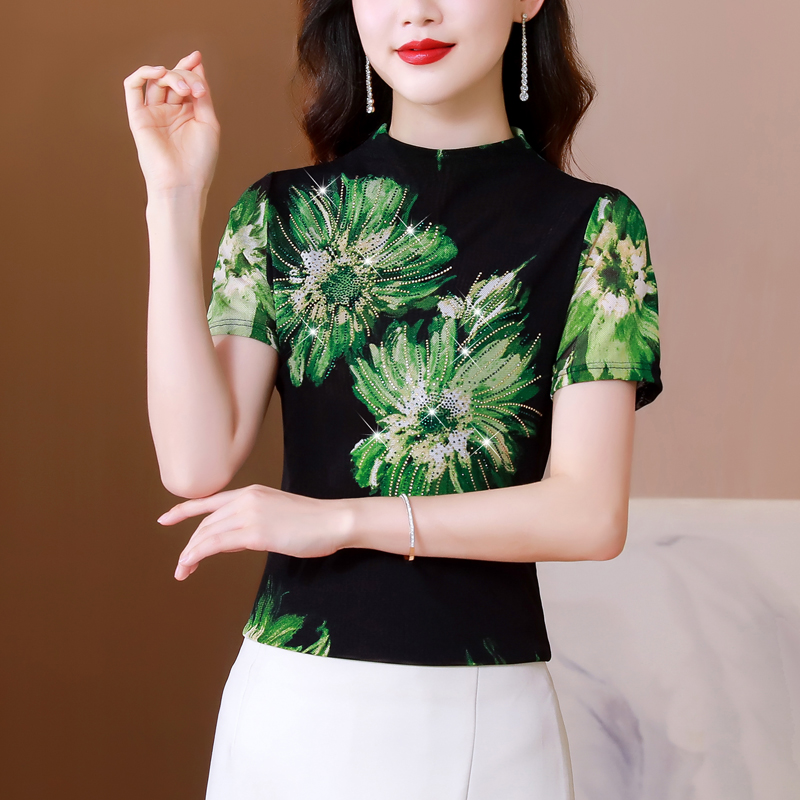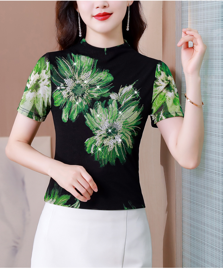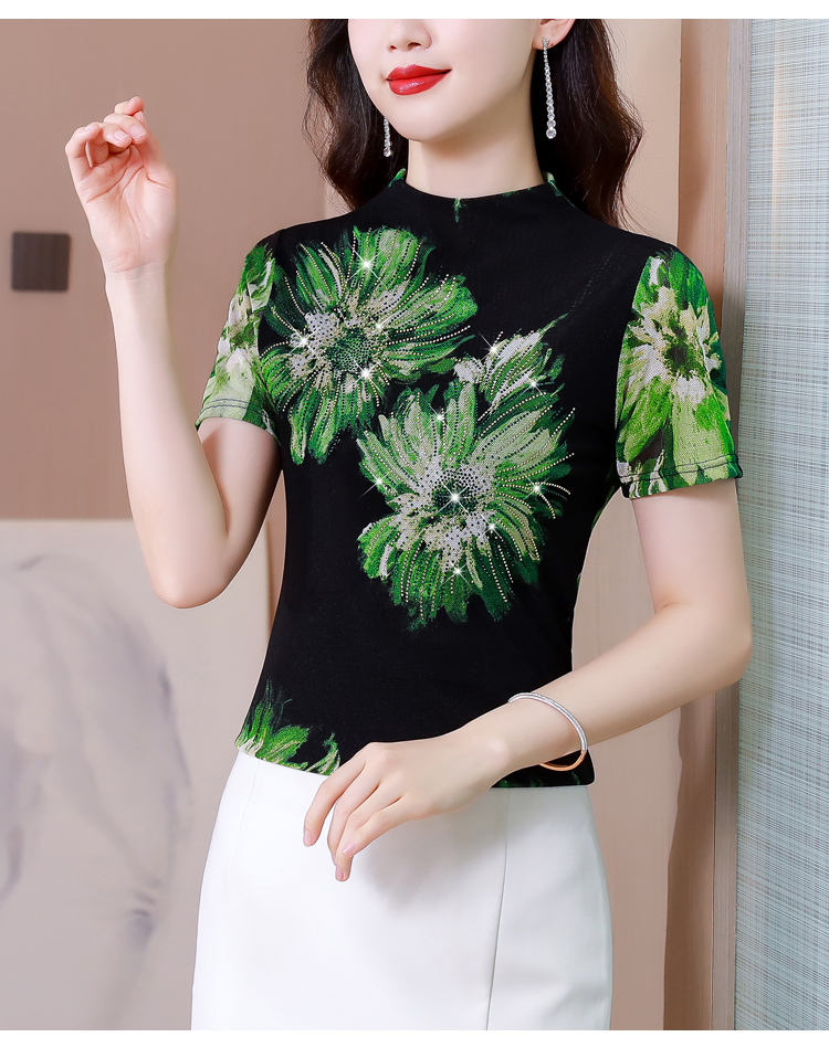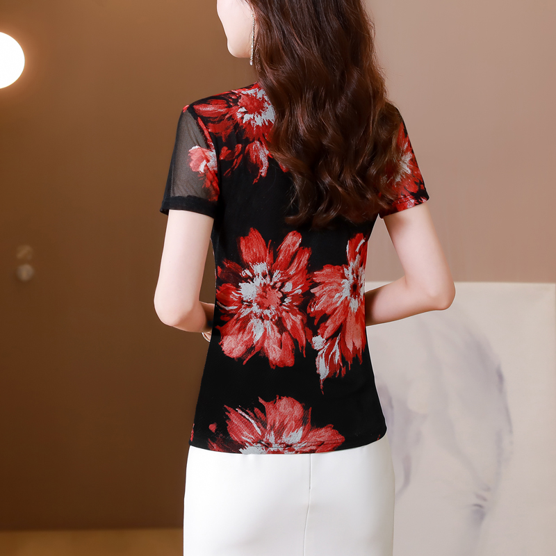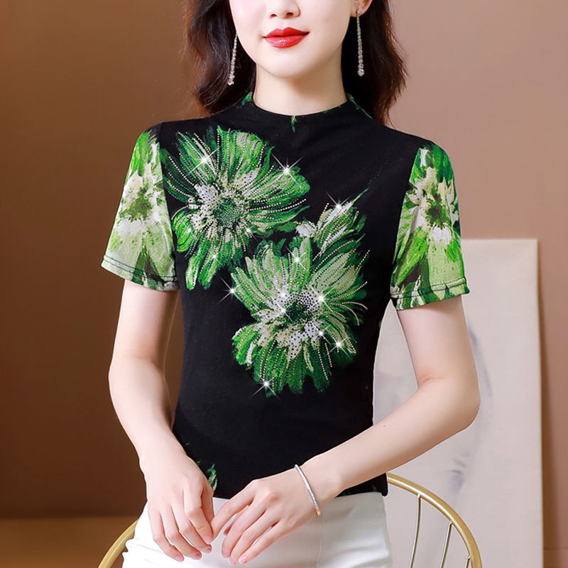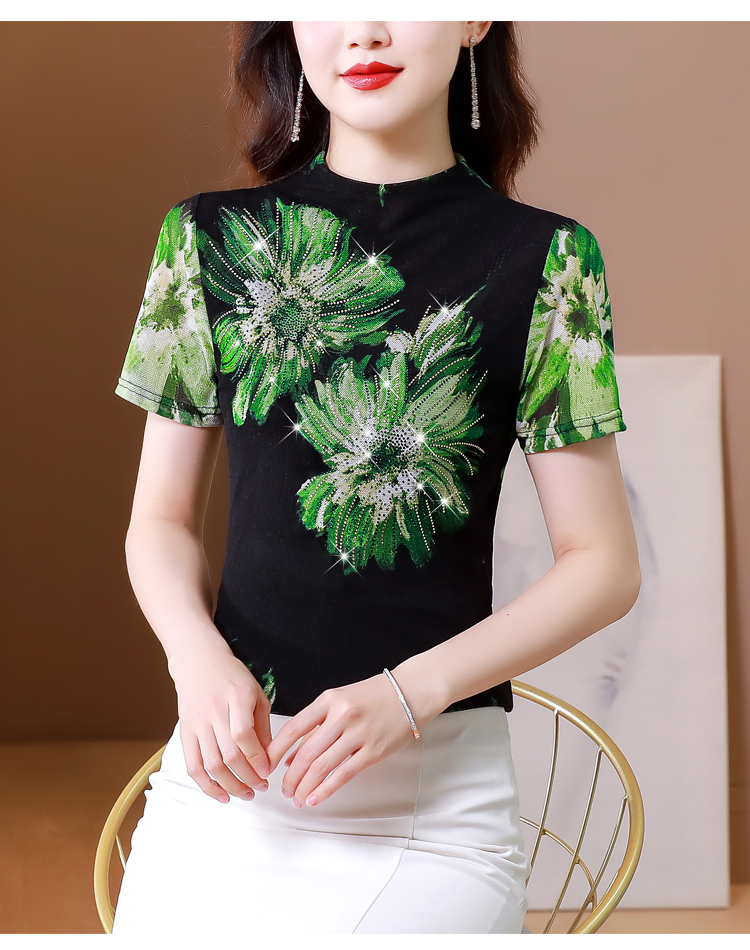 RY3688# 实拍 2026夏季新款韩版修身定位花烫钻网纱印花打底衫上衣女