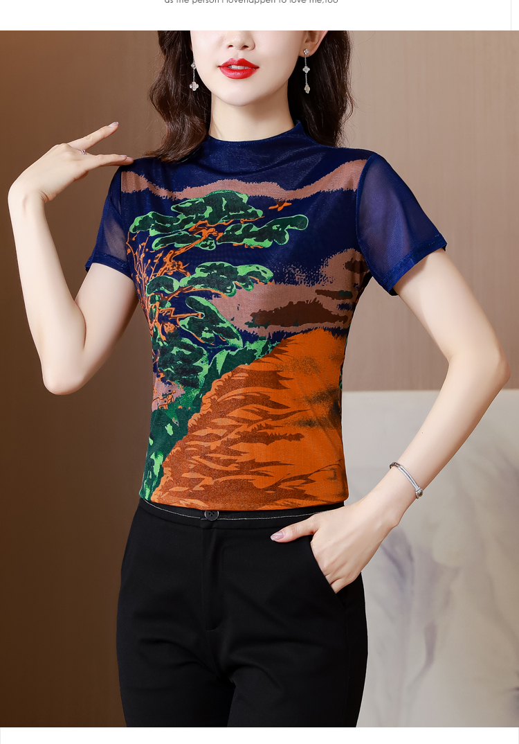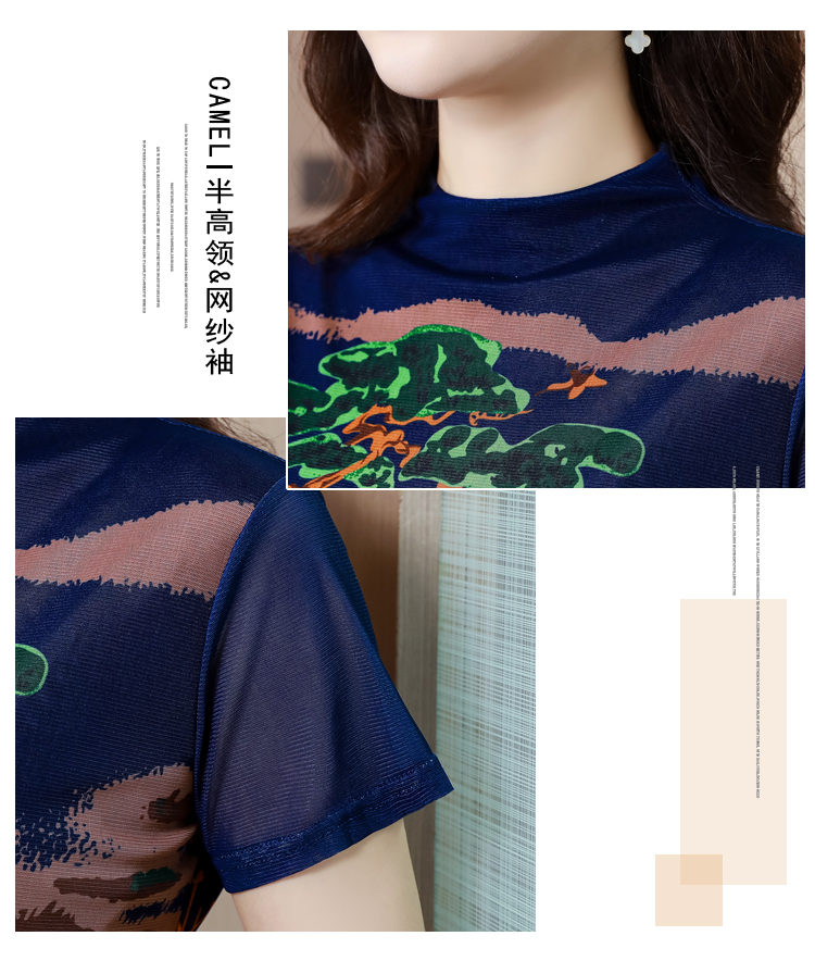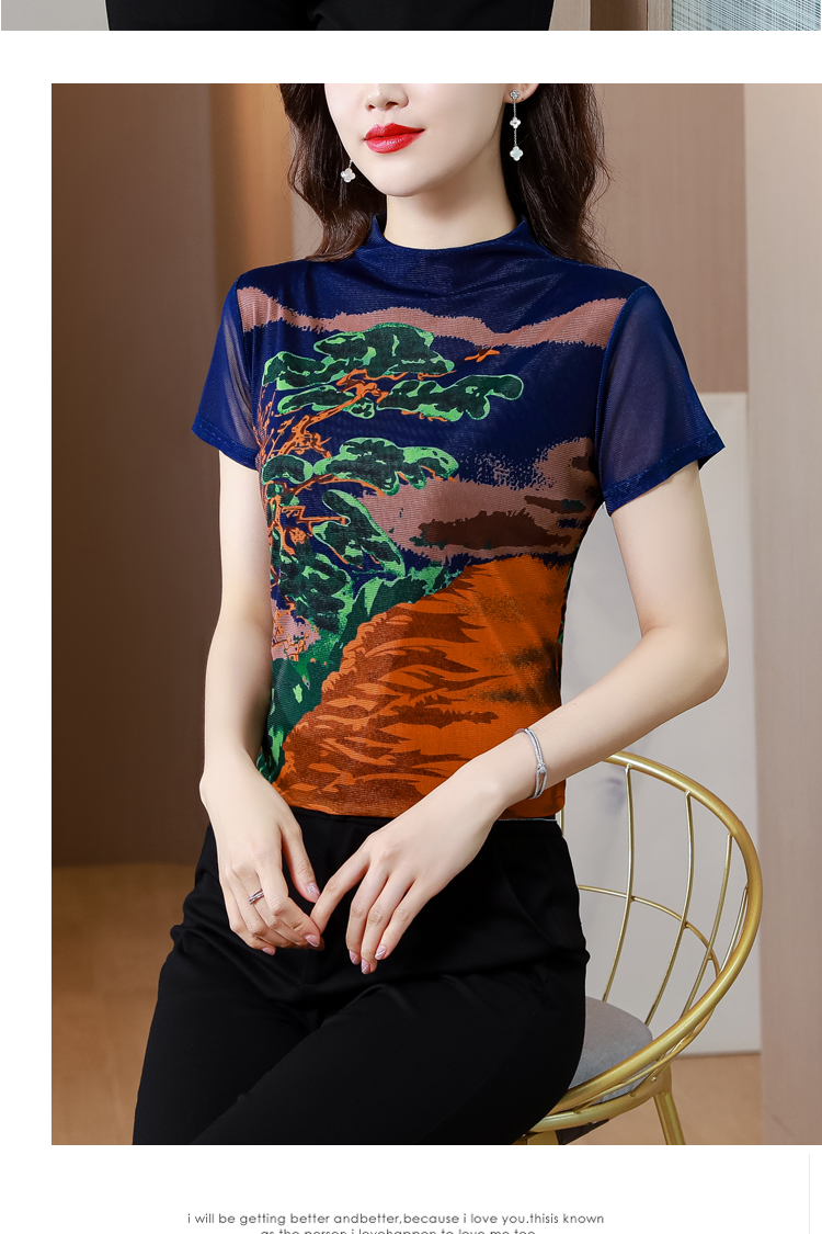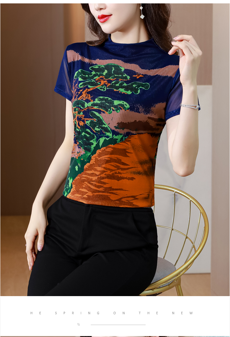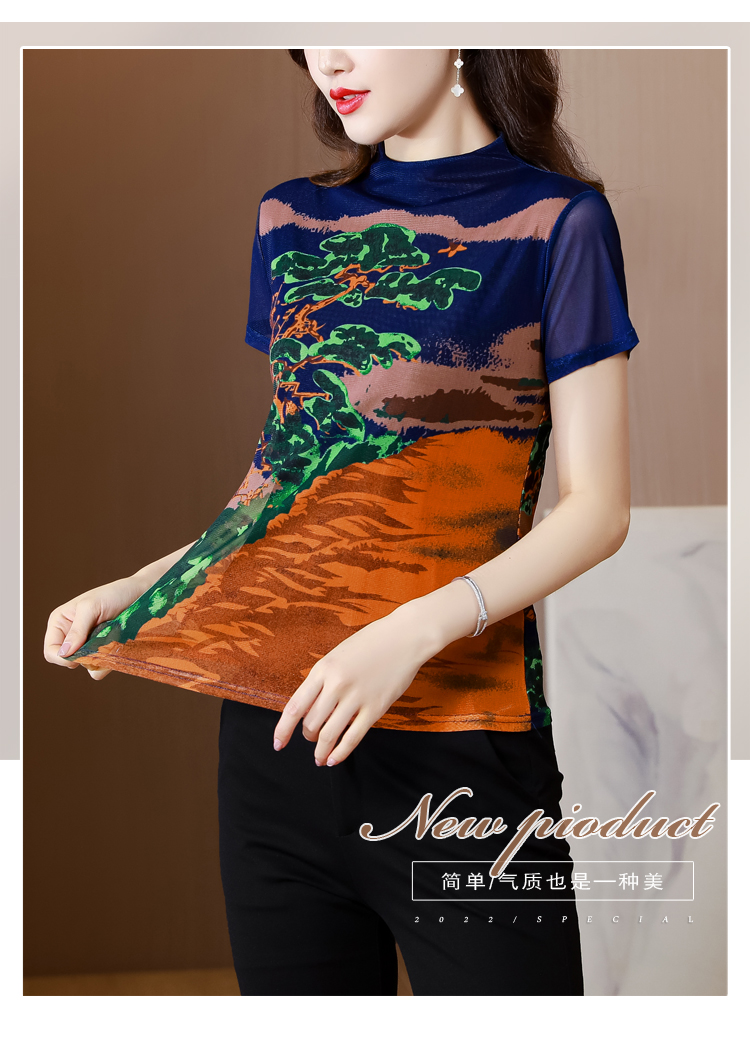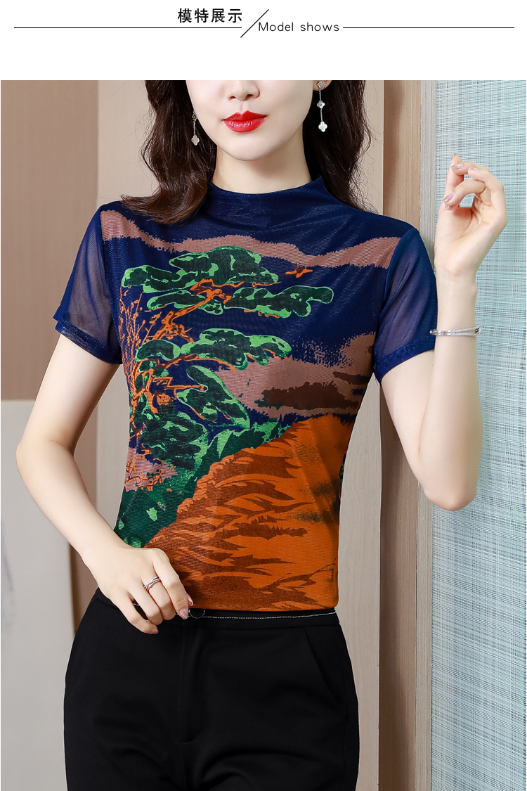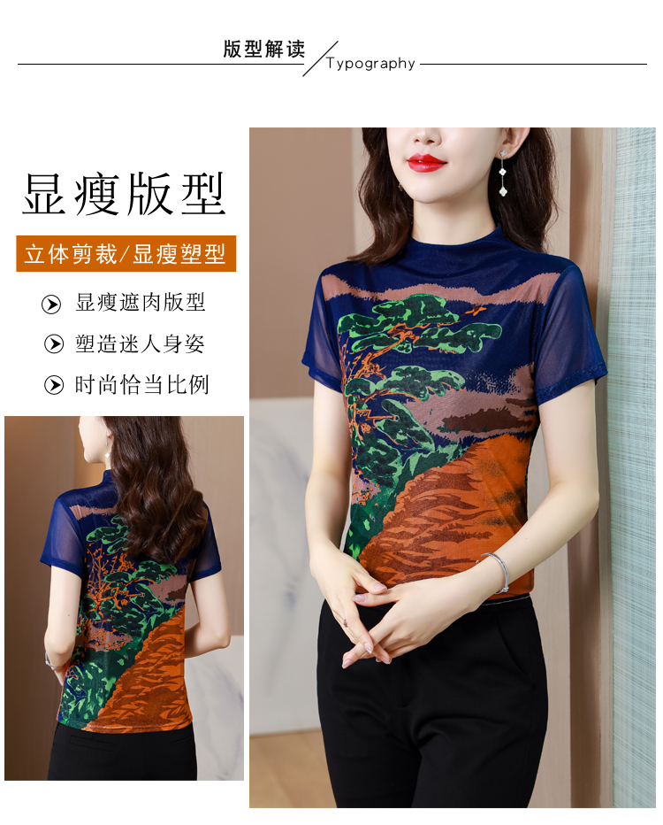 RY3689# 实拍2026夏季新款网纱打底衫女半高领短袖桑蚕丝印花韩版修身上衣