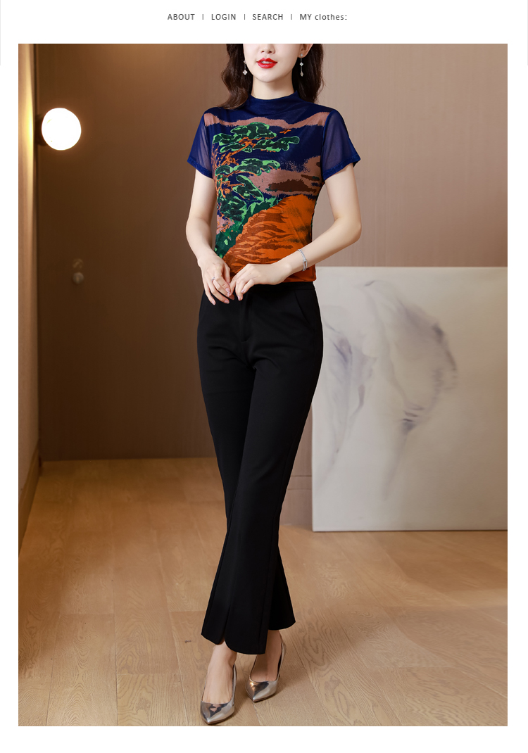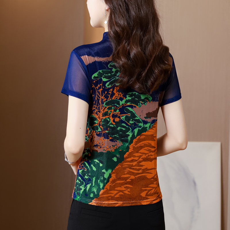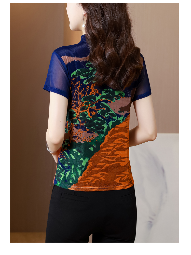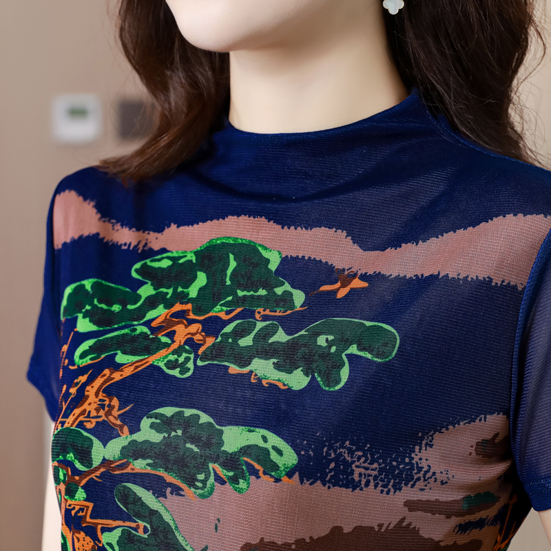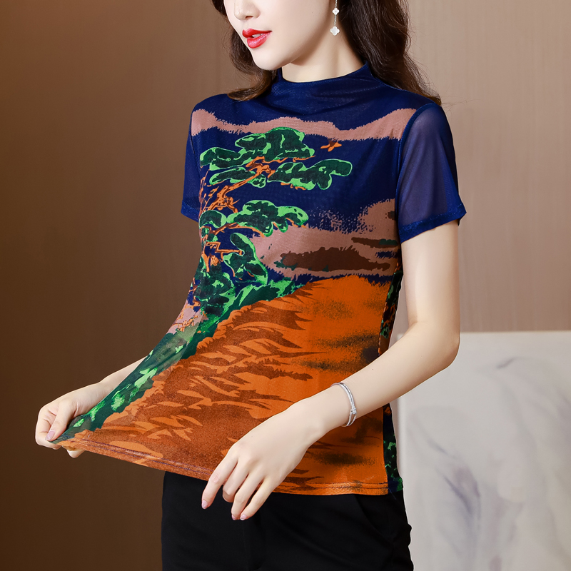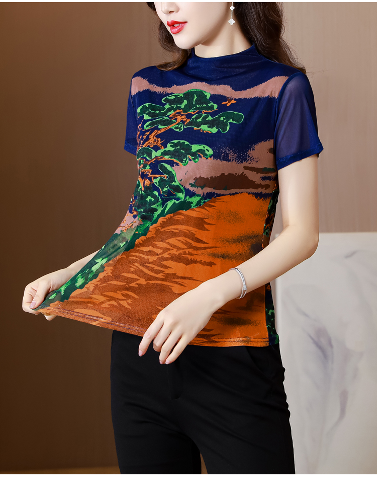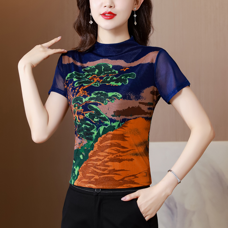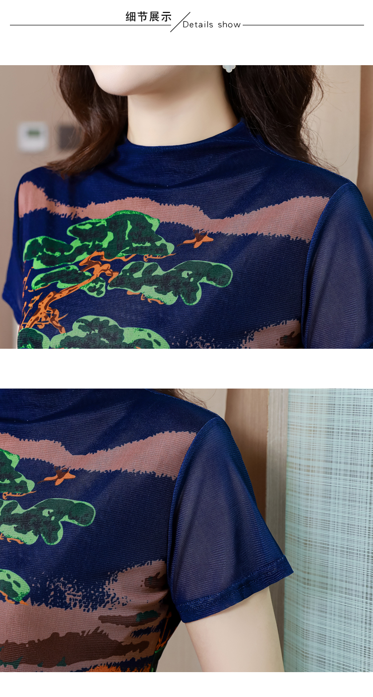 RY3689# 实拍2026夏季新款网纱打底衫女半高领短袖桑蚕丝印花韩版修身上衣