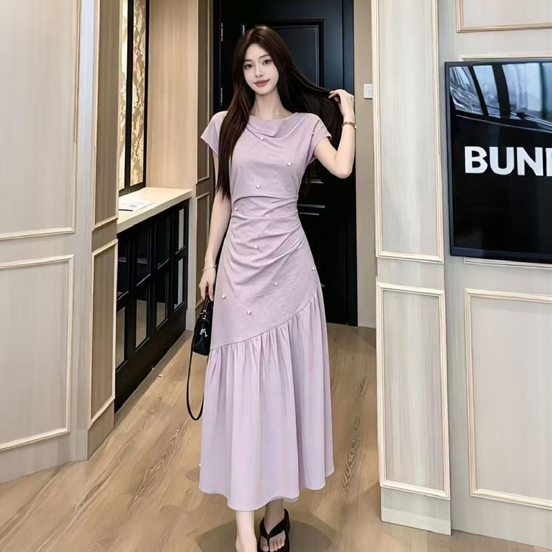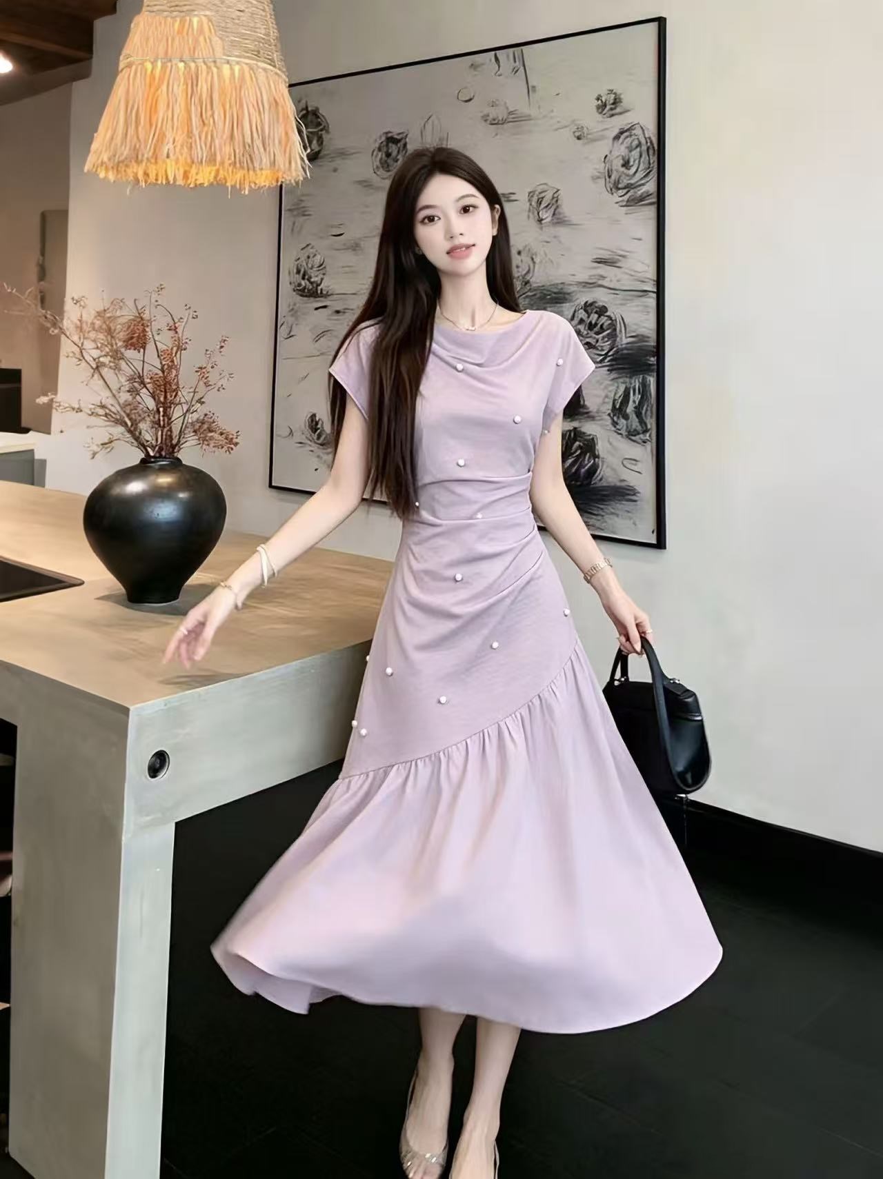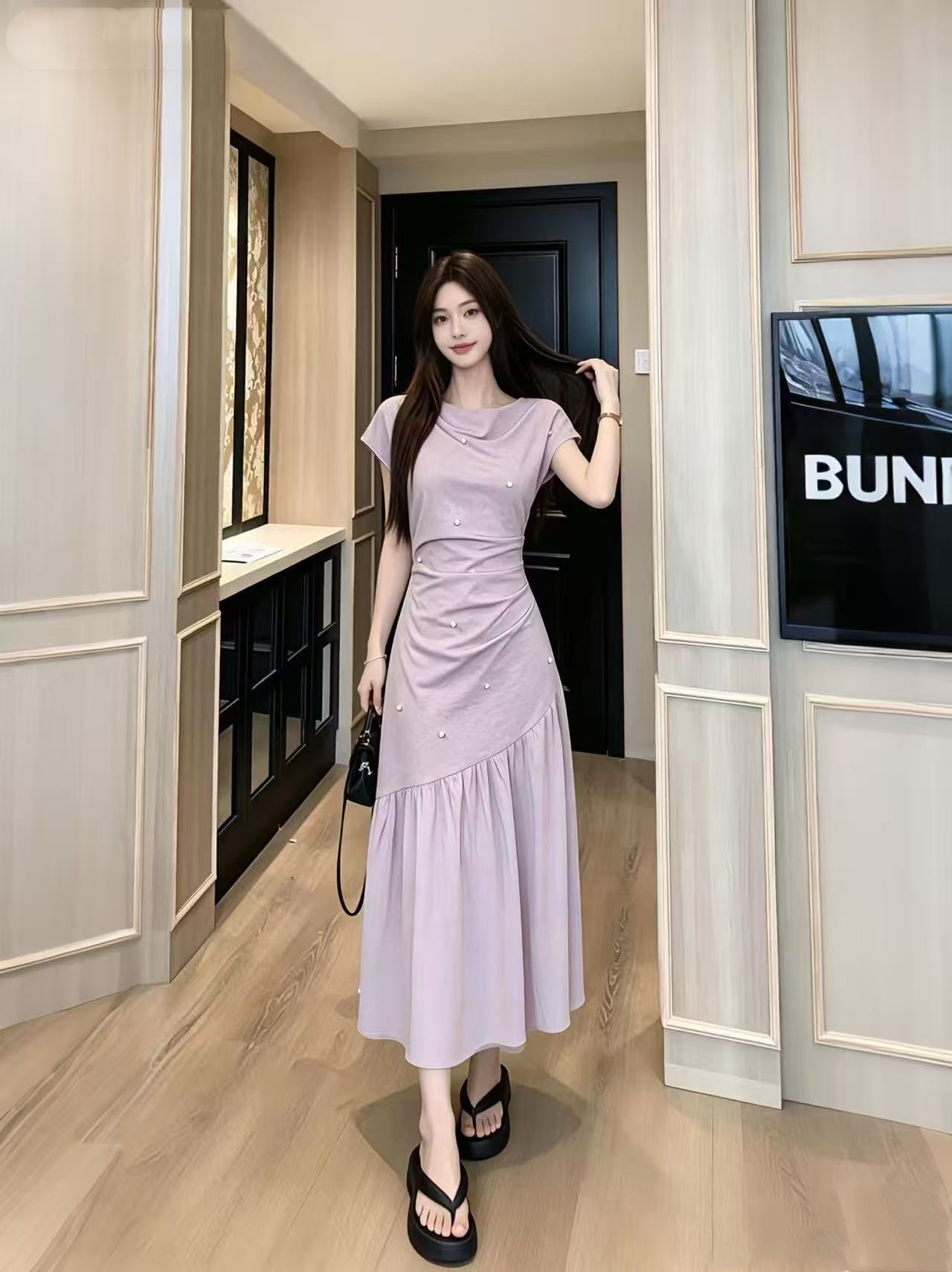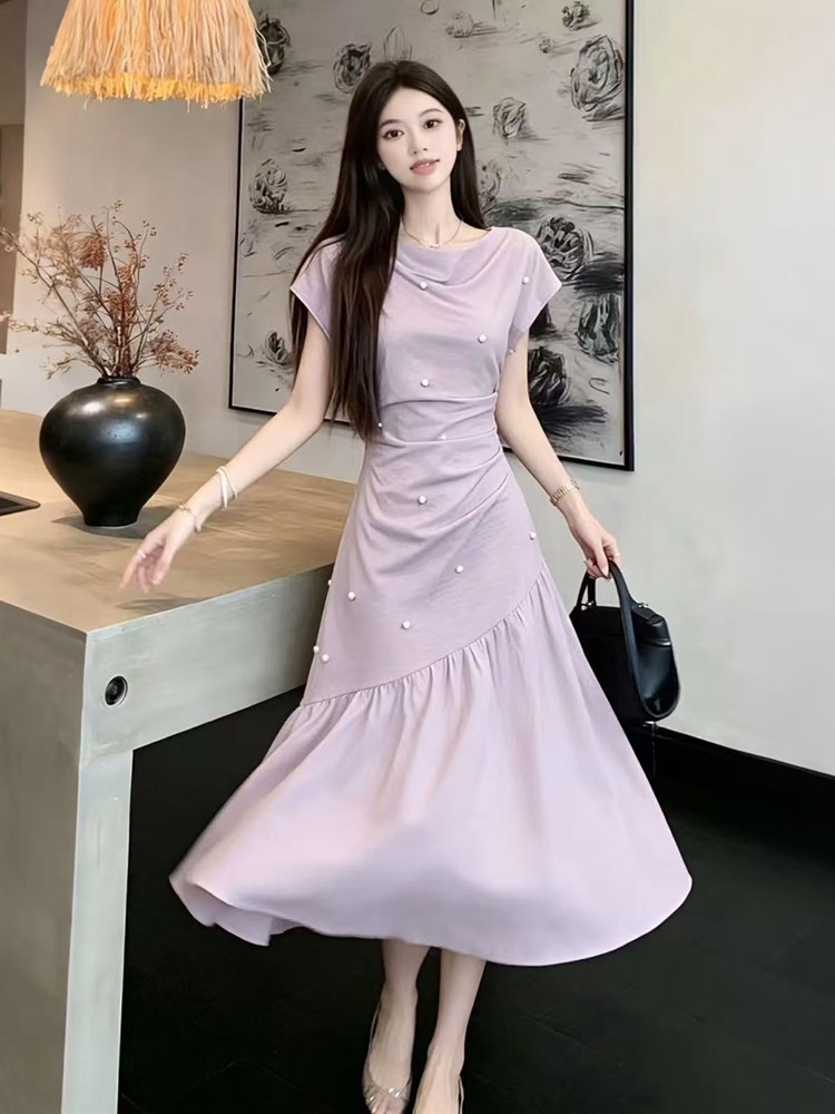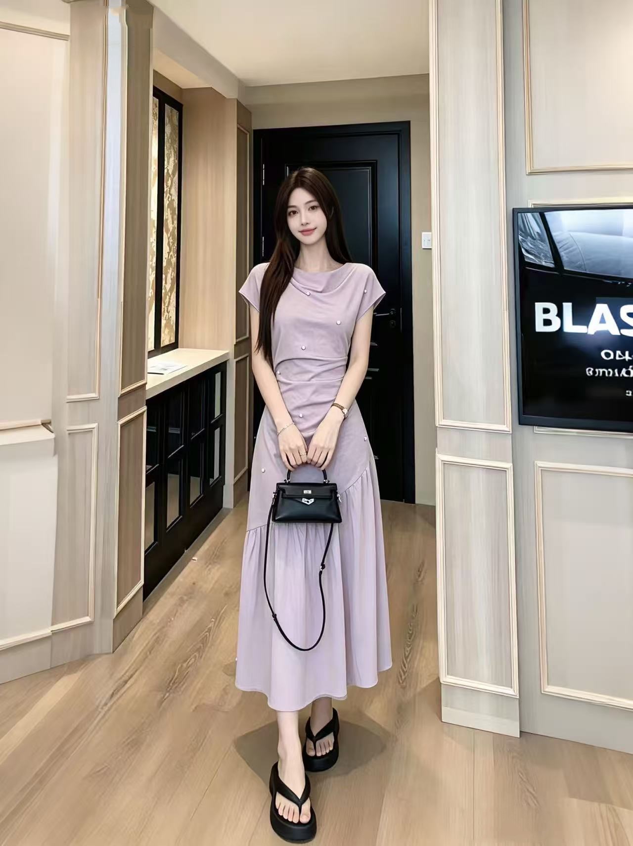 RY3692# 2026夏季新款胖mm设计感法式高级感荡领拼接遮肉显瘦连衣裙长裙子