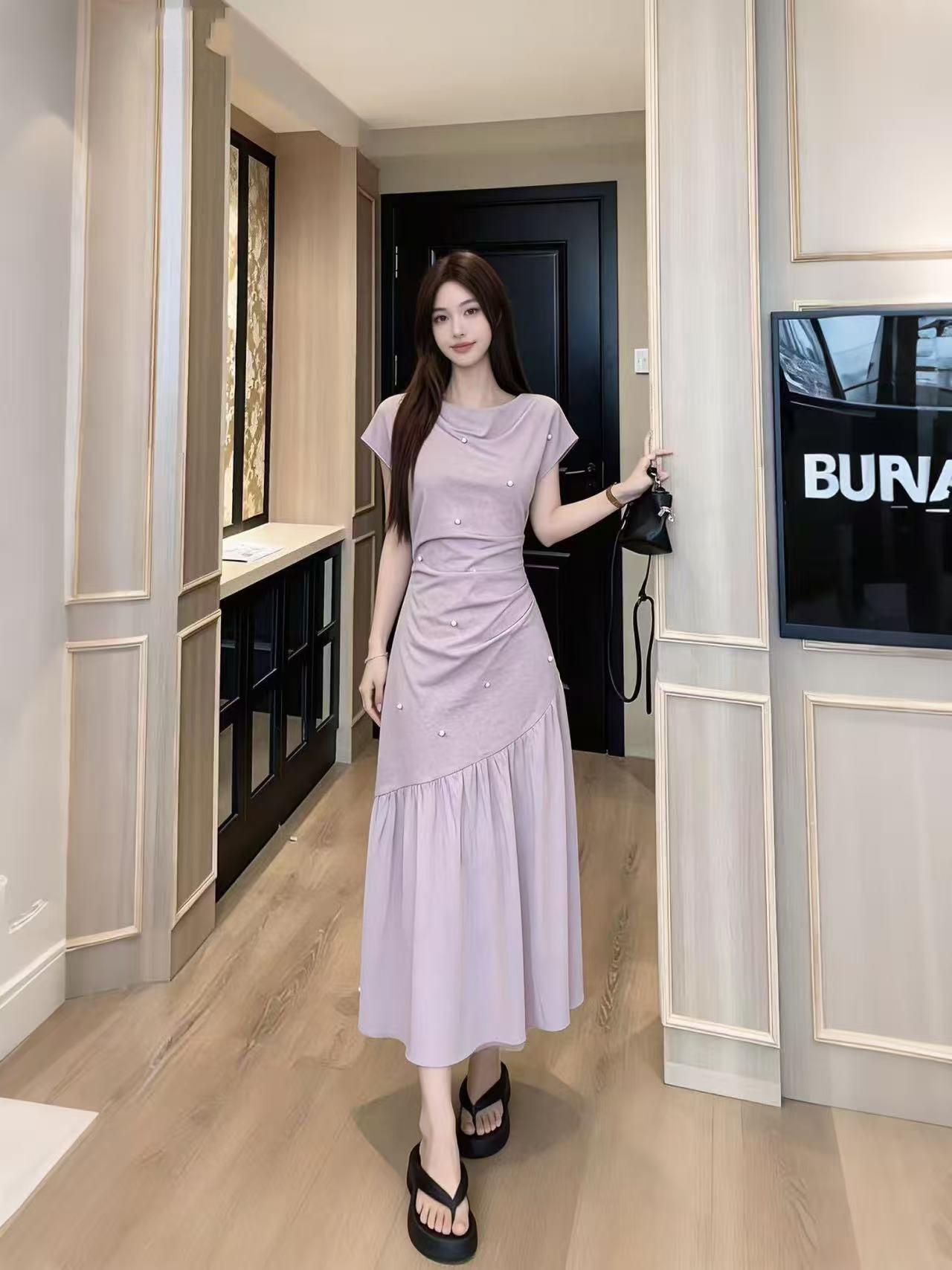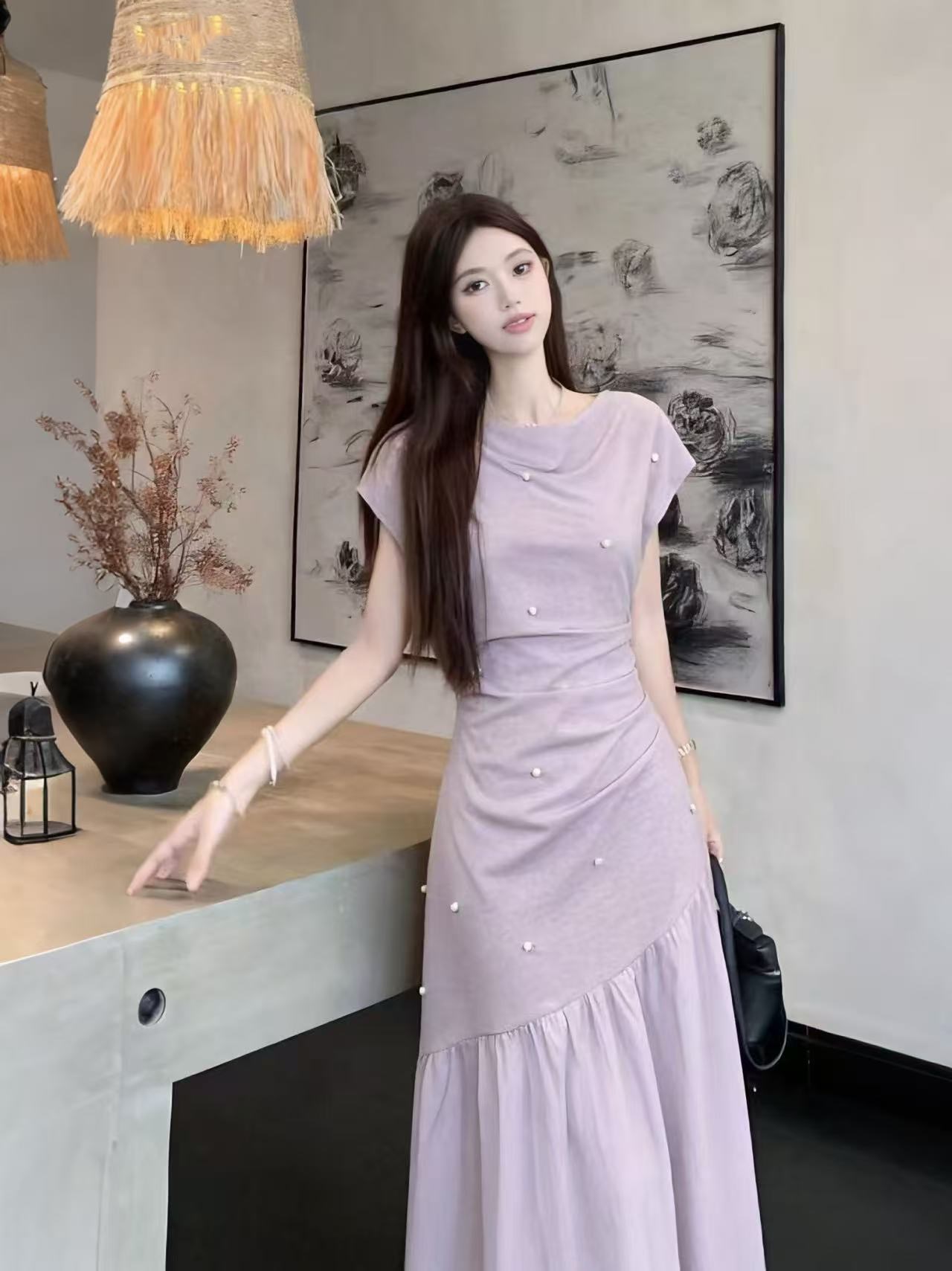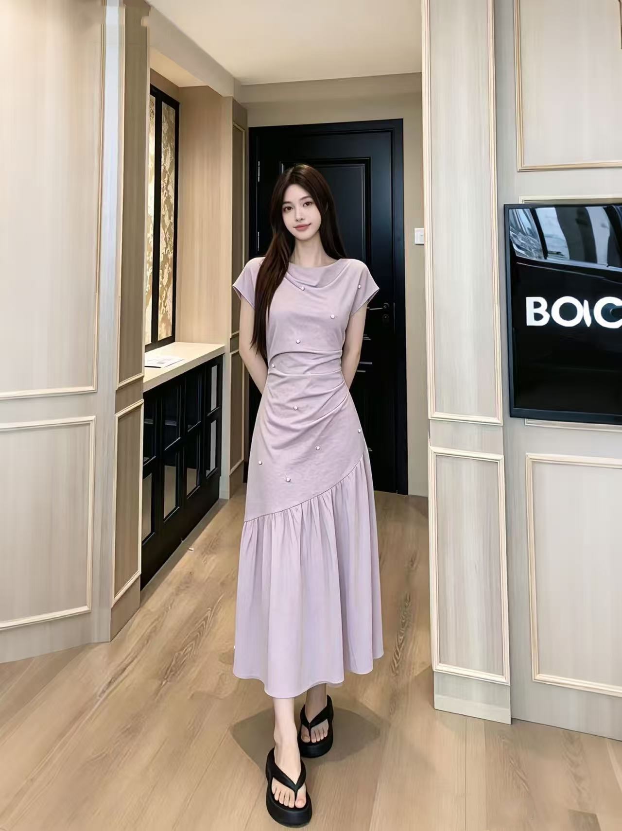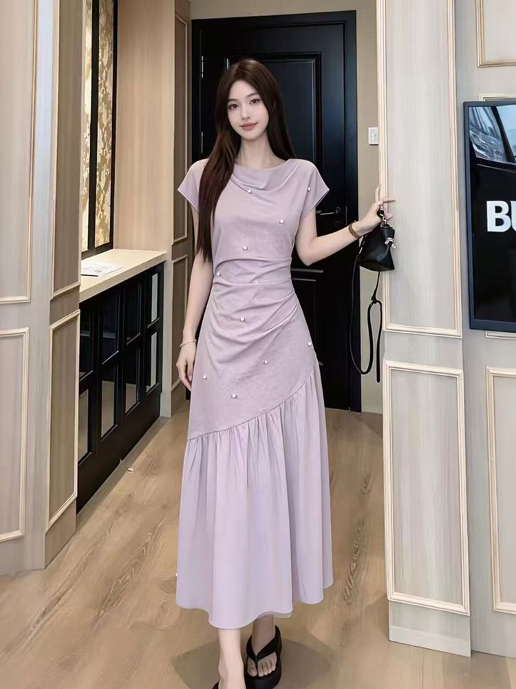 RY3692# 2026夏季新款胖mm设计感法式高级感荡领拼接遮肉显瘦连衣裙长裙子