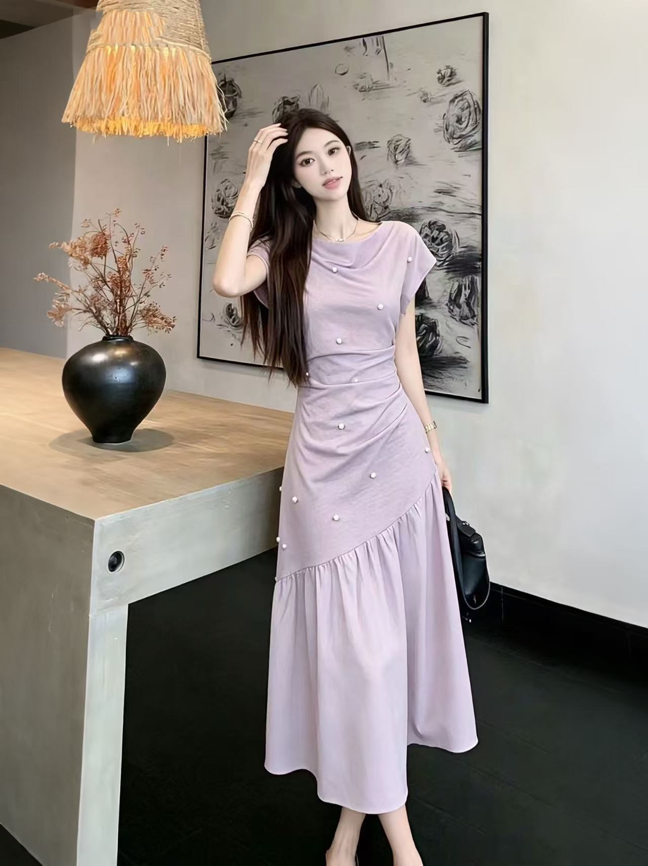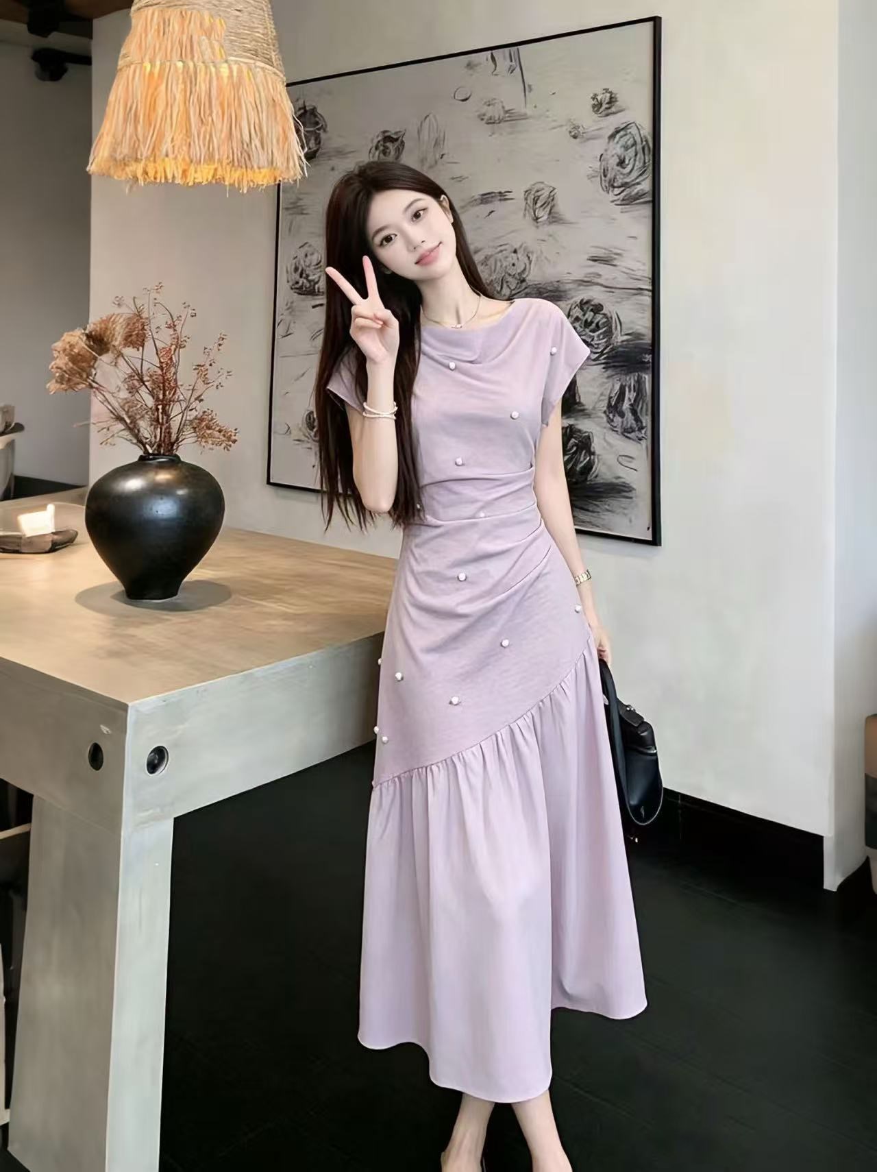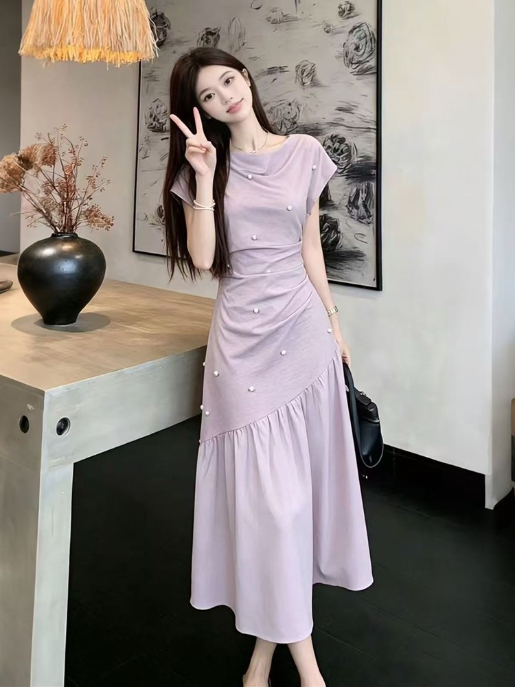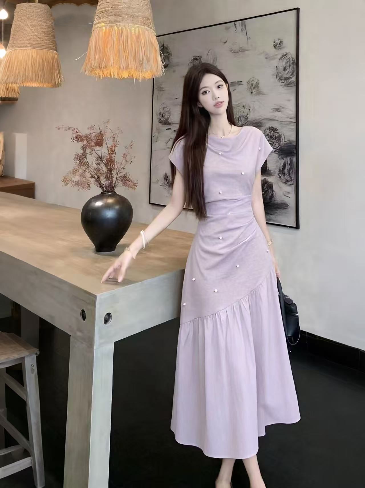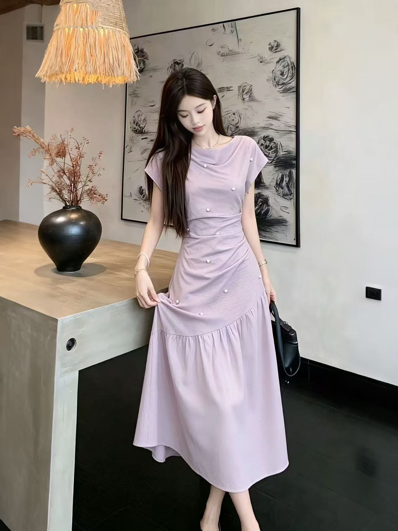 RY3692# 2026夏季新款胖mm设计感法式高级感荡领拼接遮肉显瘦连衣裙长裙子