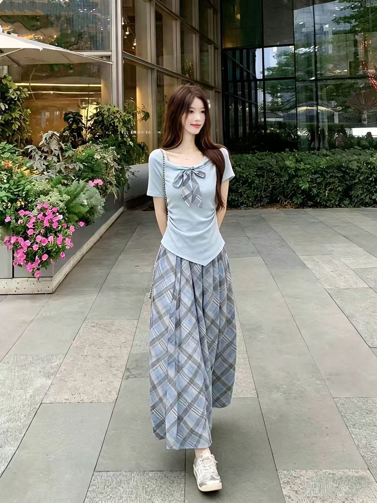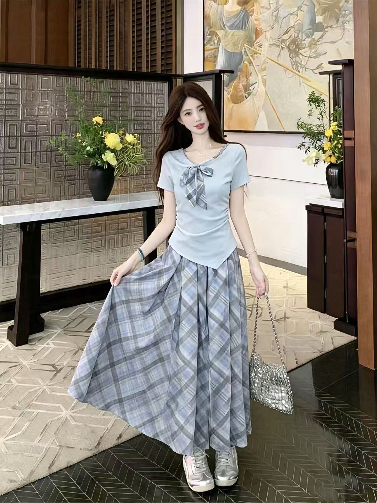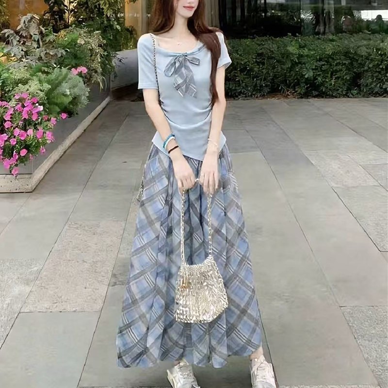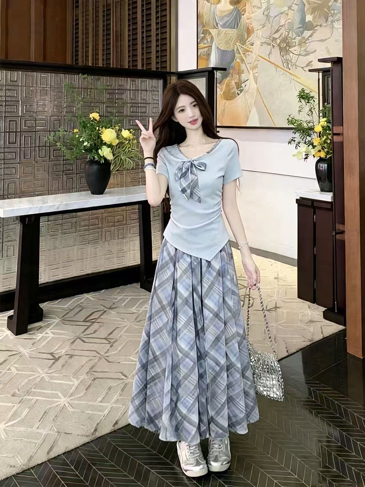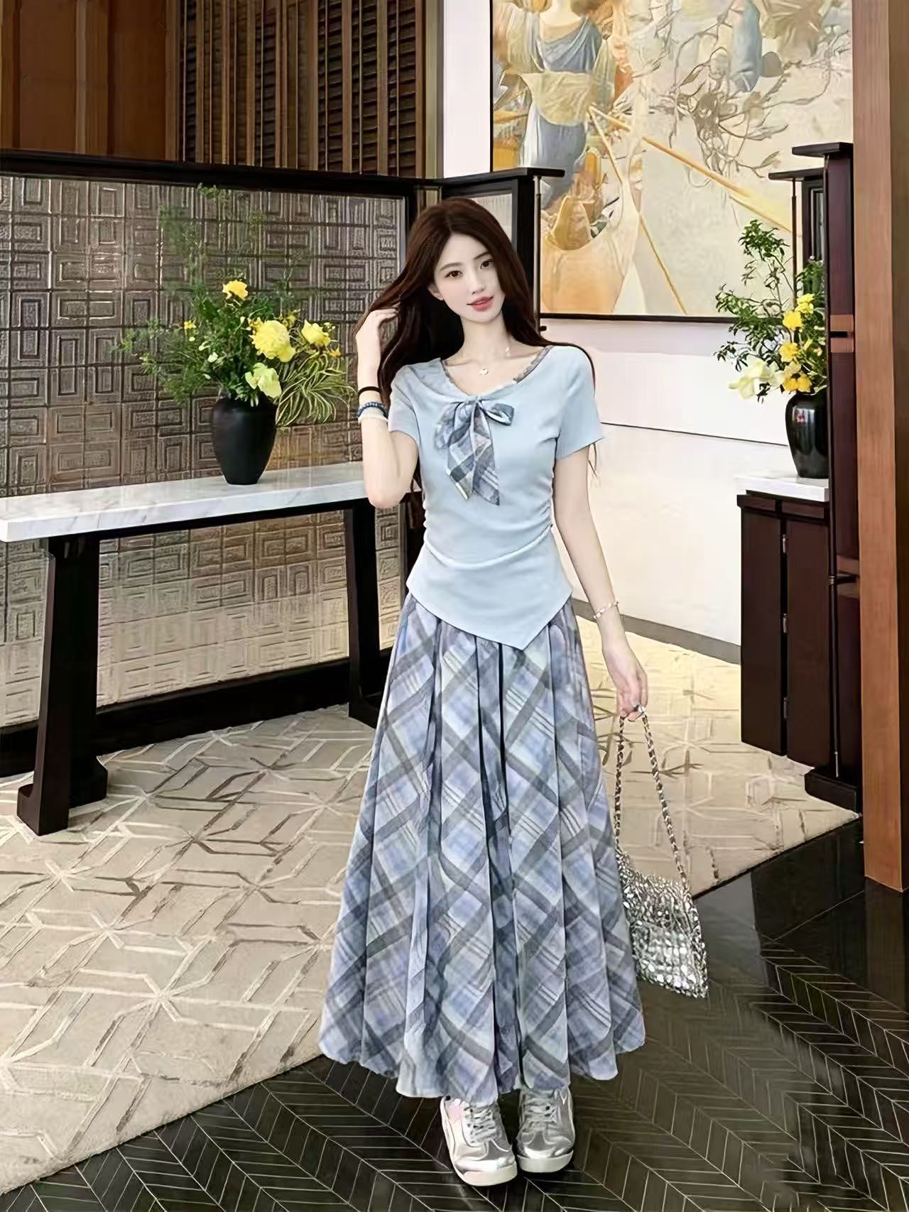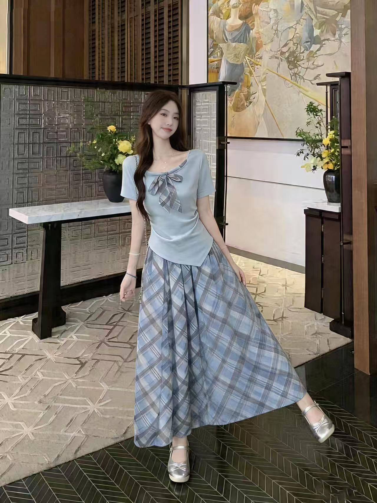 RY3693# 2026夏季新款大码温柔风设计感短袖上衣格纹半身裙度假风两件套装