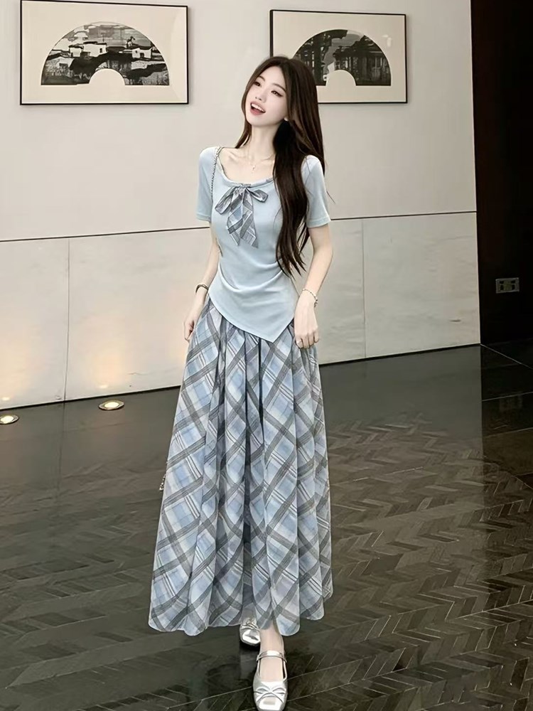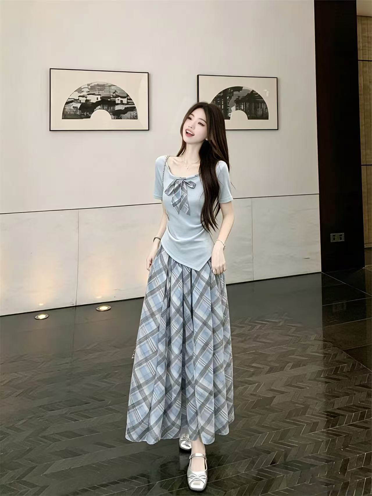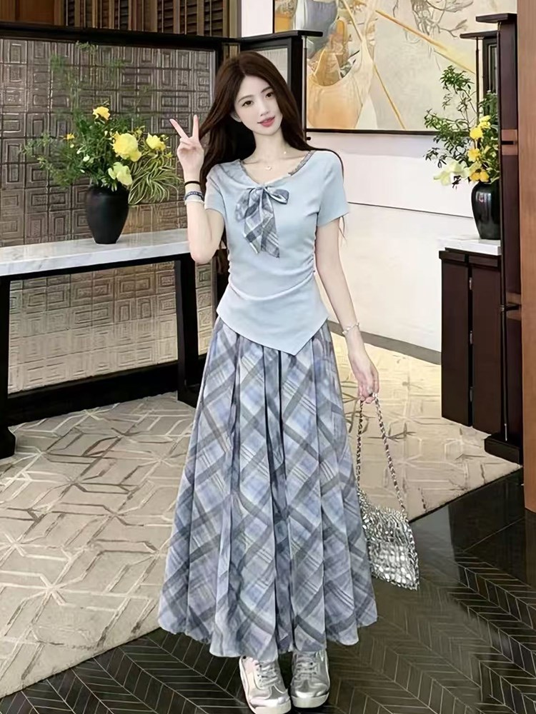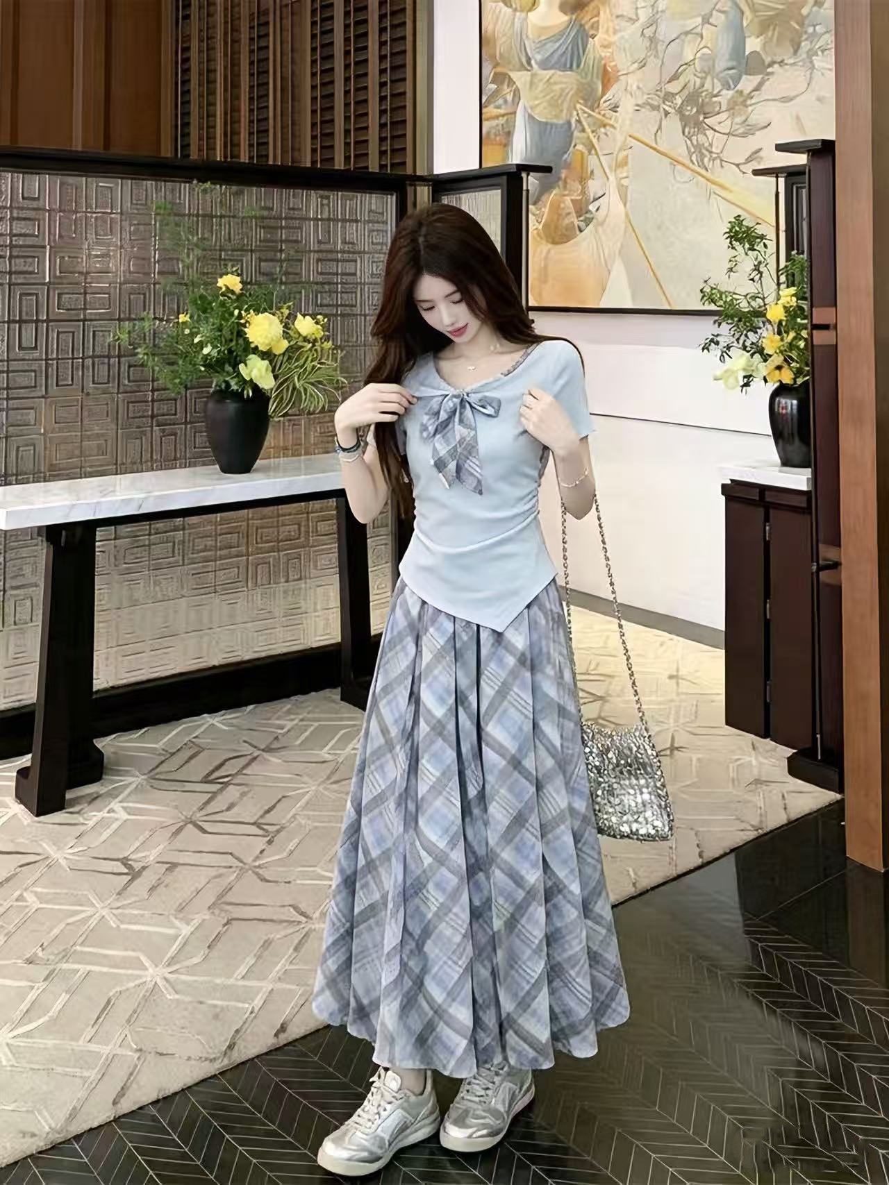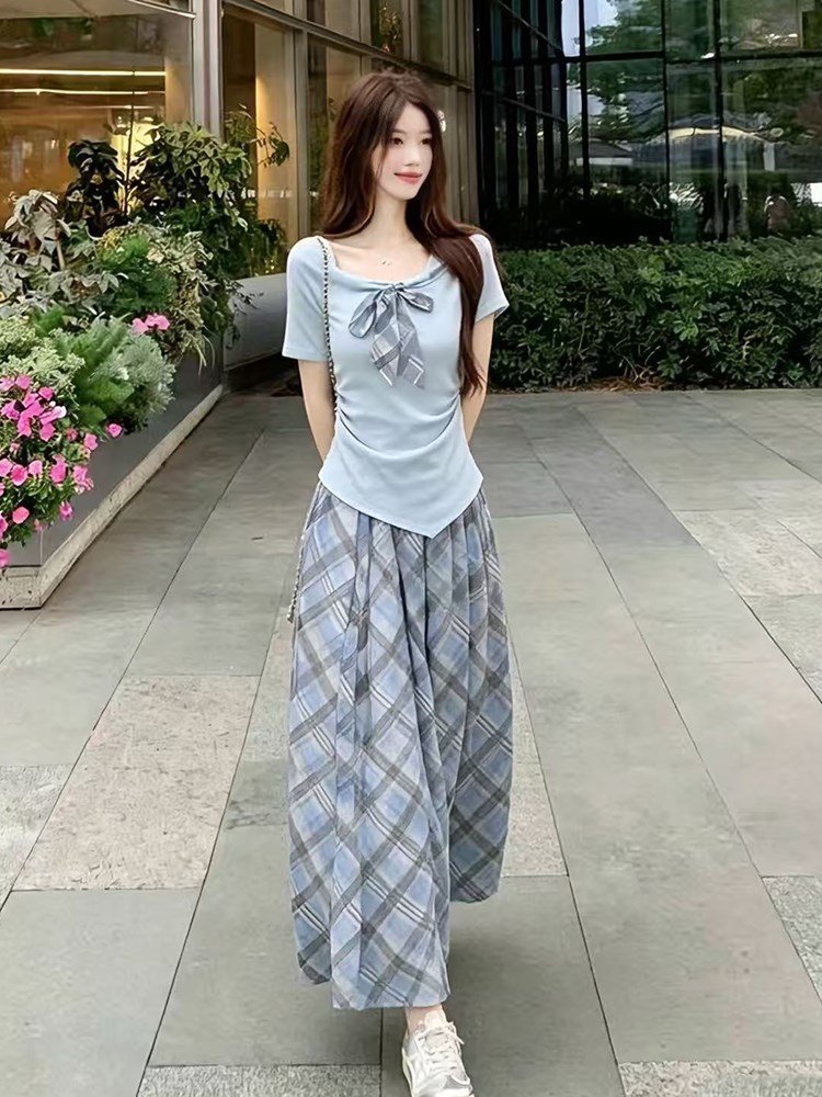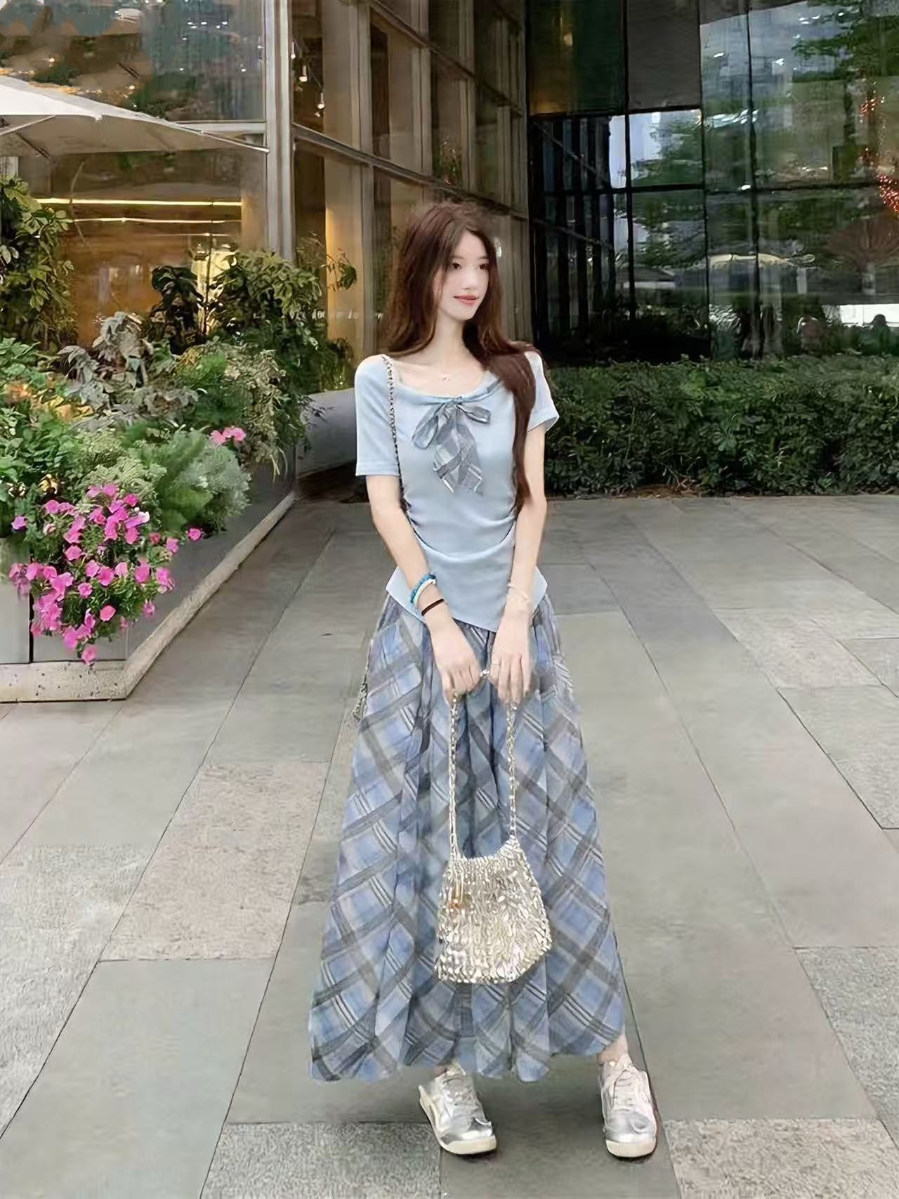 RY3693# 2026夏季新款大码温柔风设计感短袖上衣格纹半身裙度假风两件套装