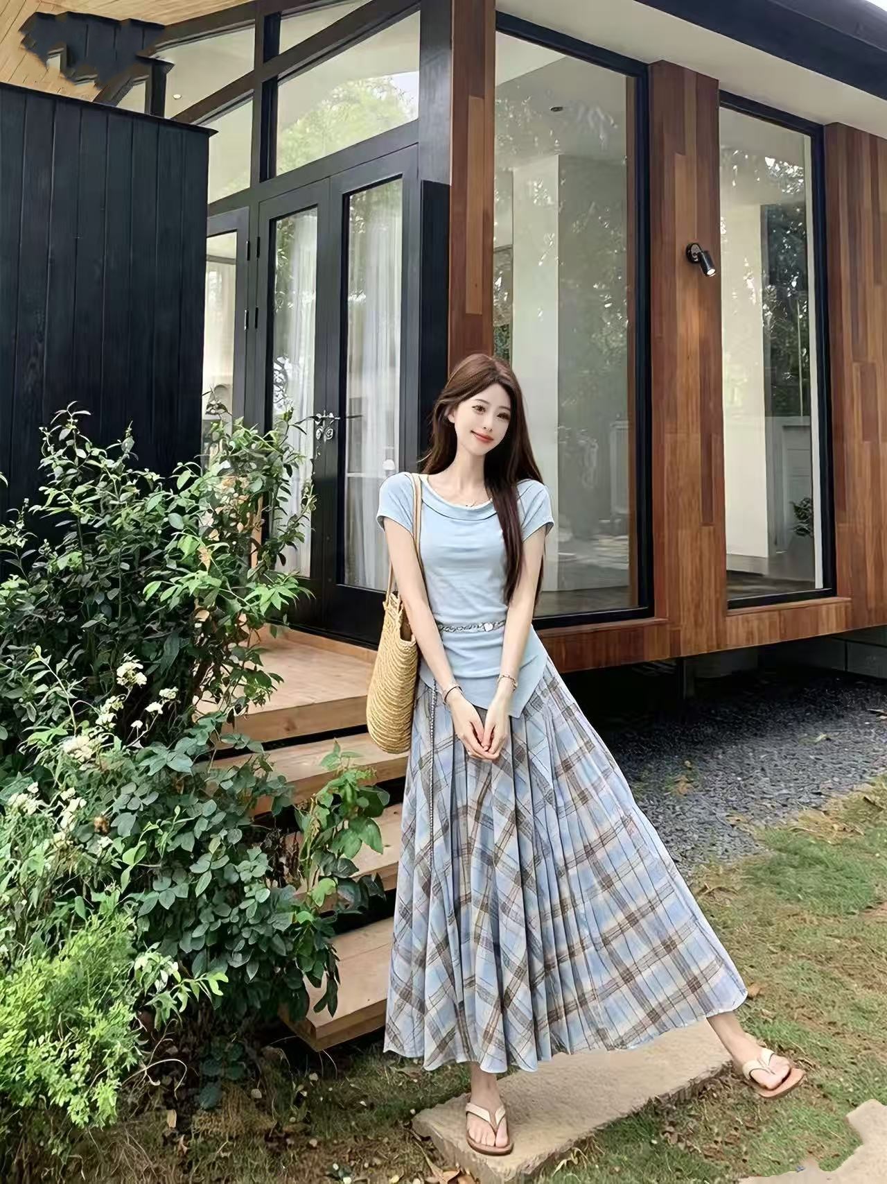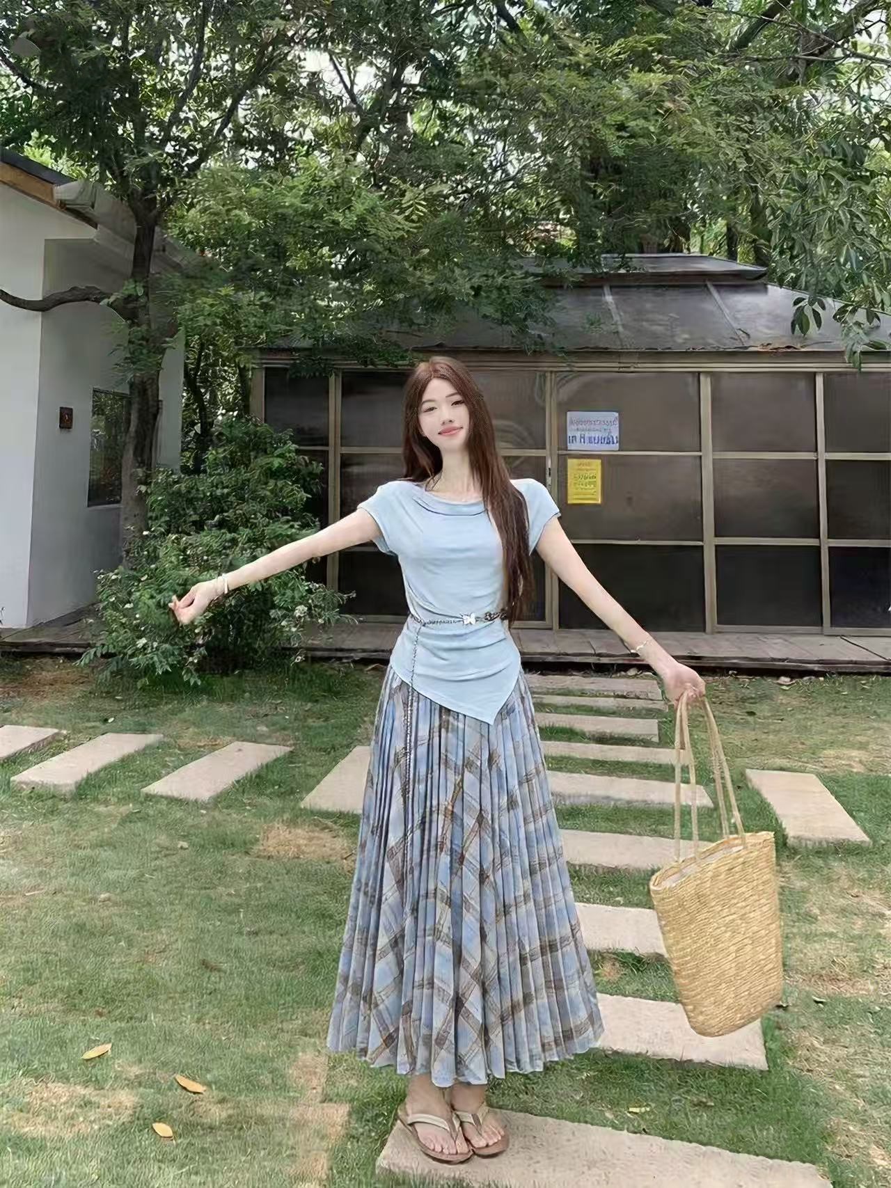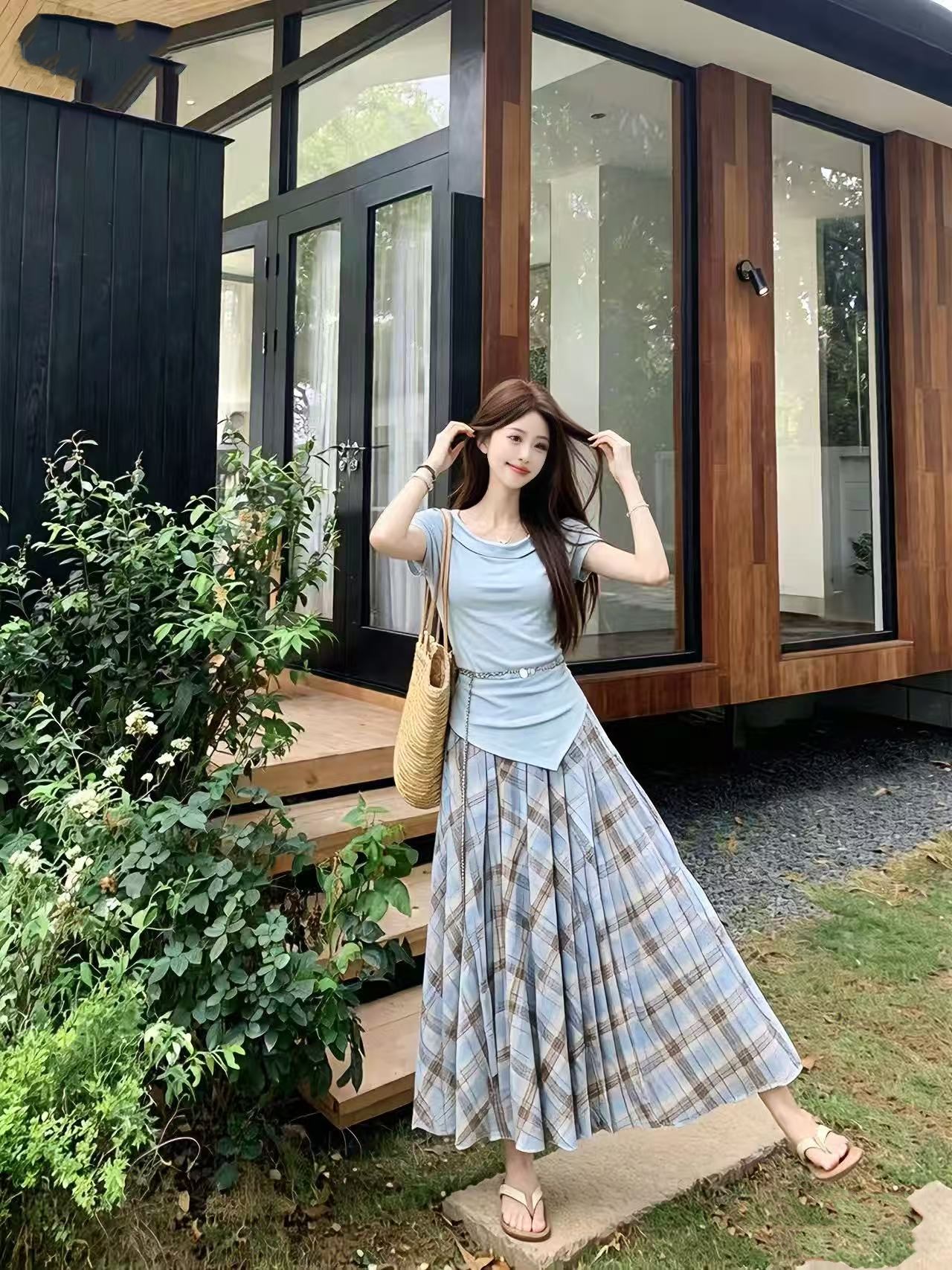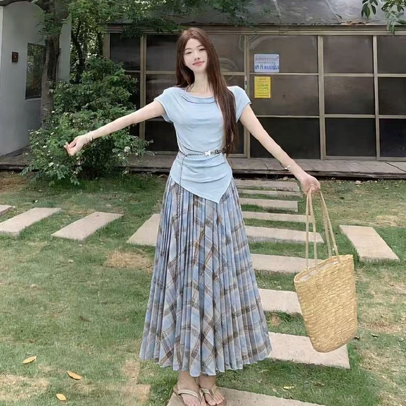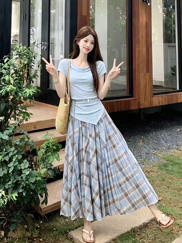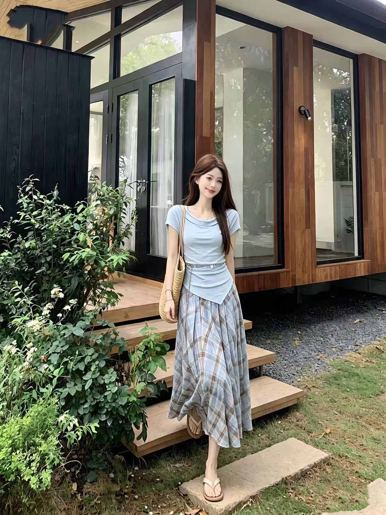 RY3694# 2026夏季新款大码温柔修身上衣格子印花网纱半身裙两件套套装裙女