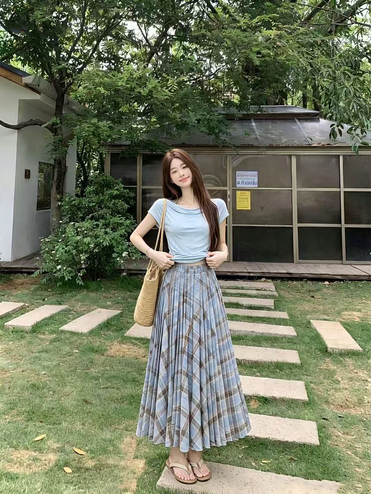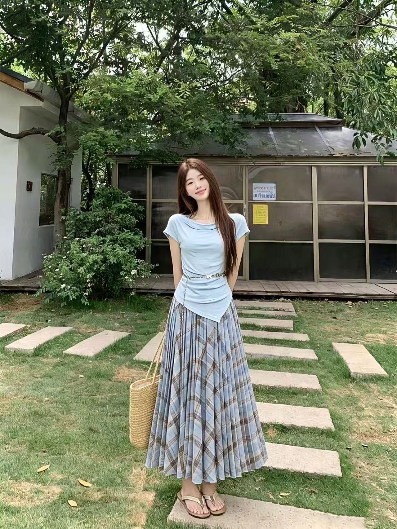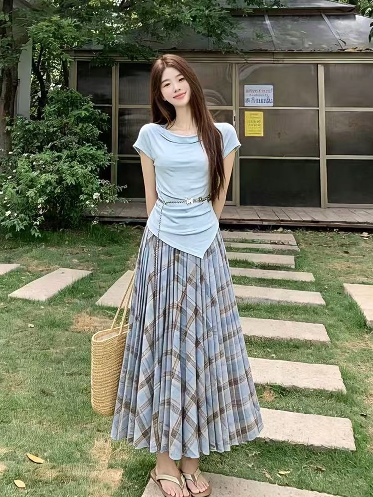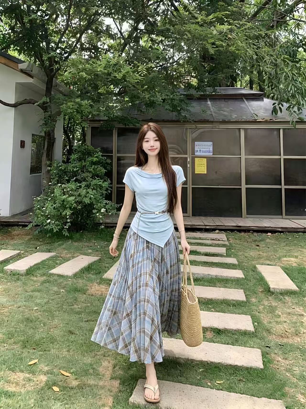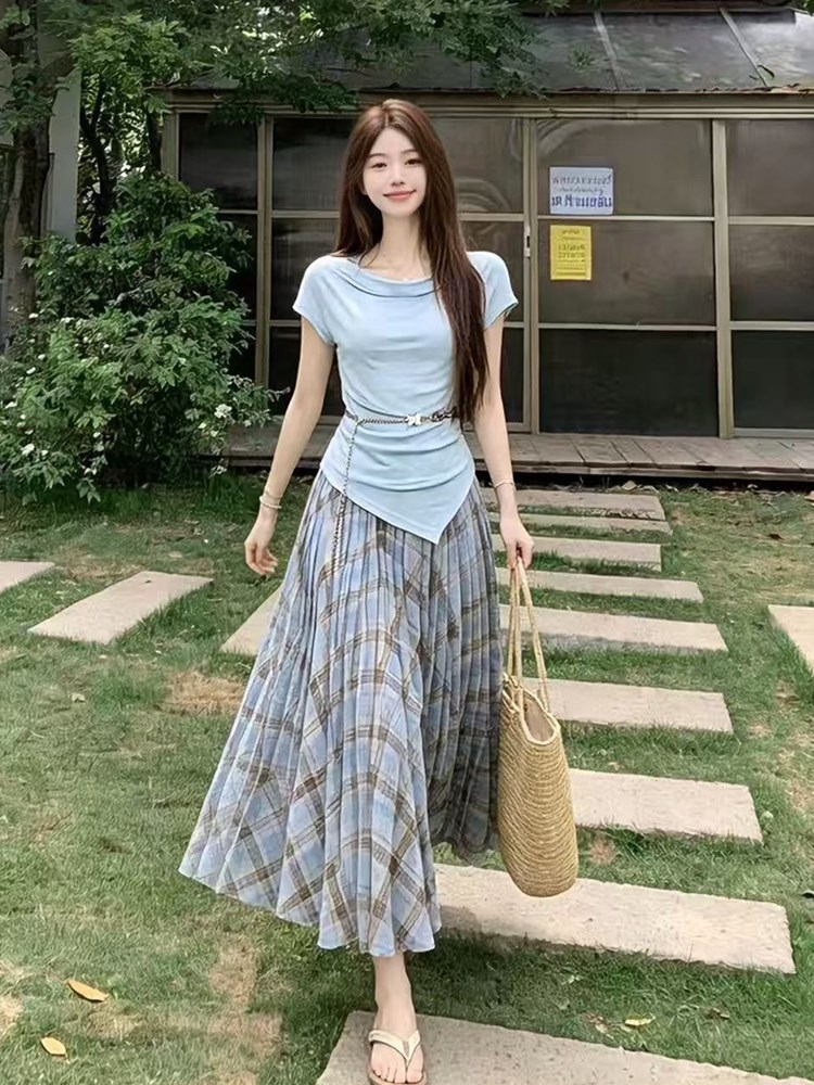 RY3694# 2026夏季新款大码温柔修身上衣格子印花网纱半身裙两件套套装裙女