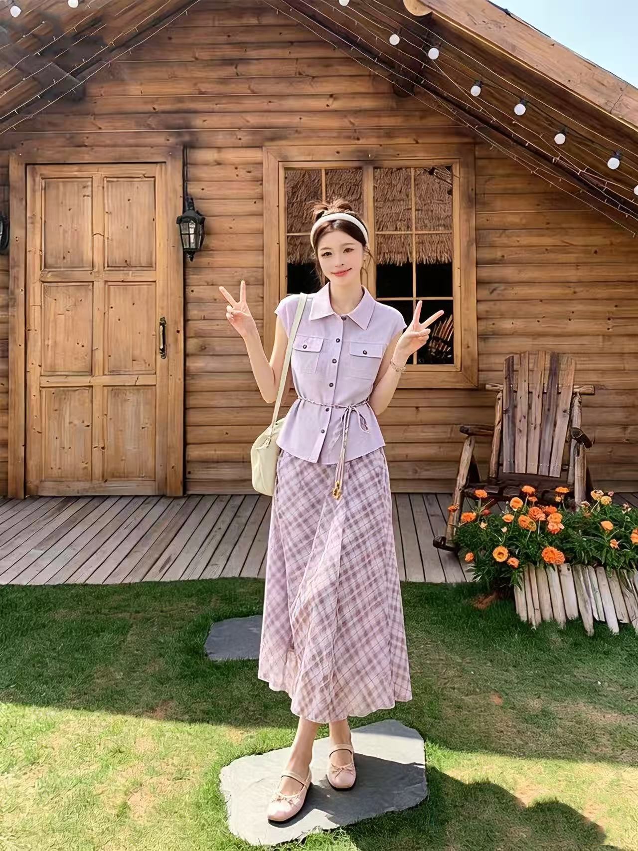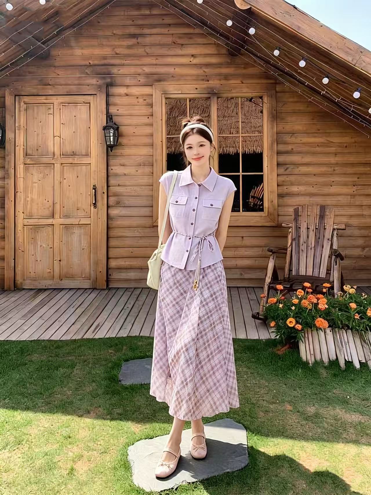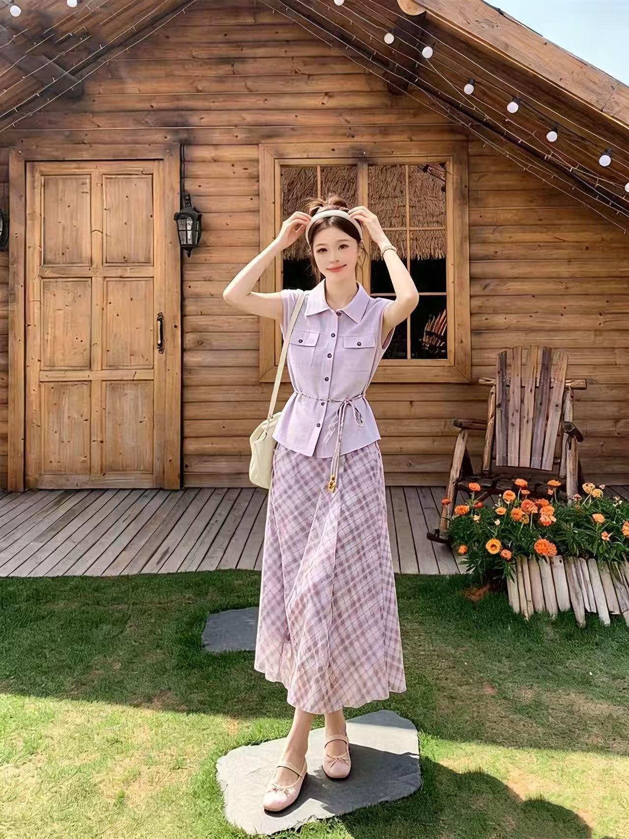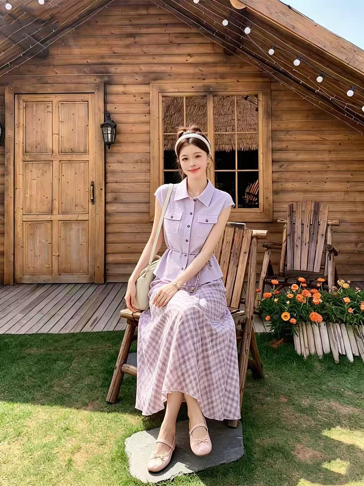 RY3695# 法式轻熟风套装裙女2026夏新款大码气质翻领衬衫格纹半身裙两件套
